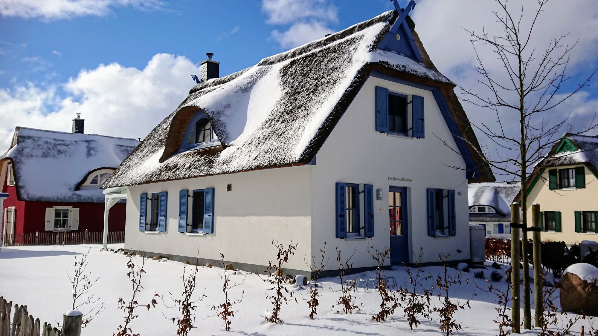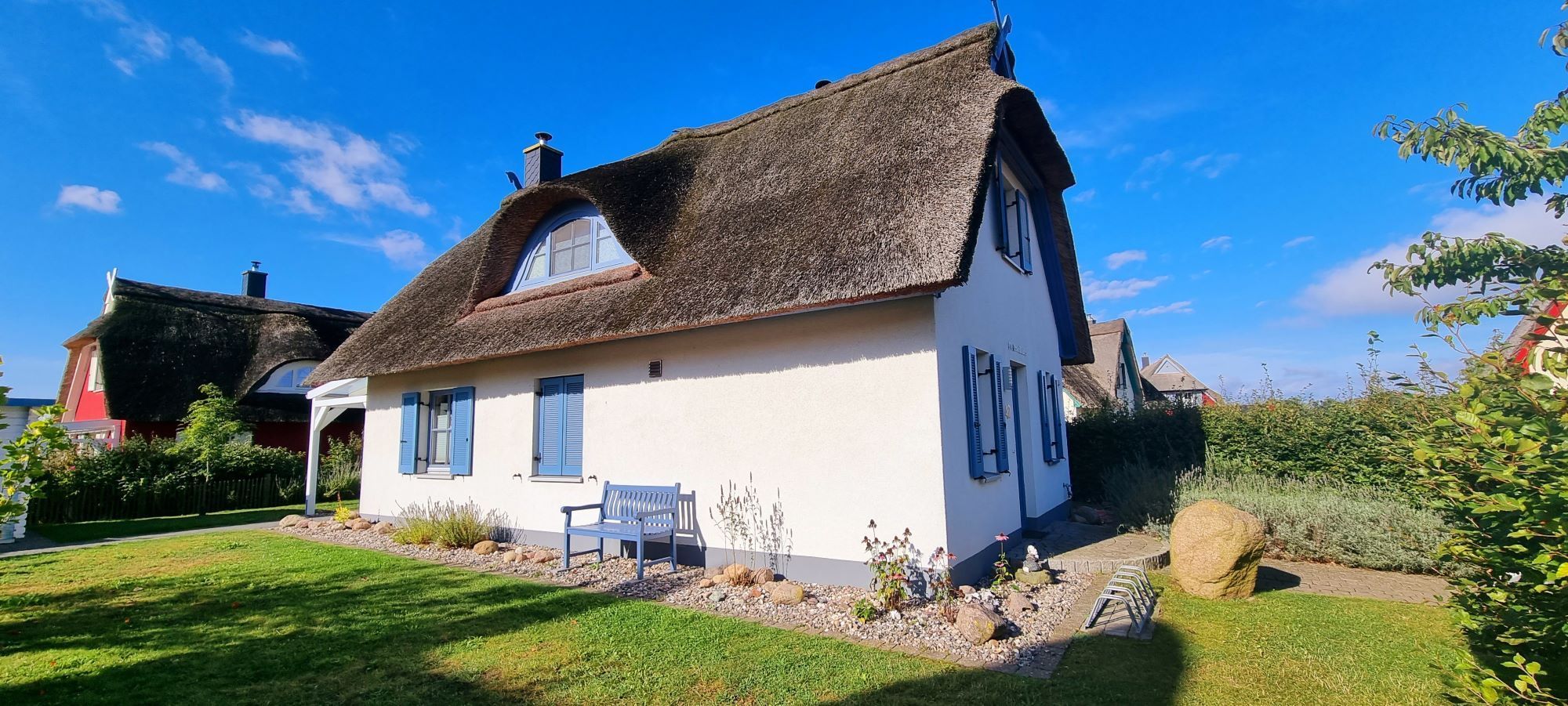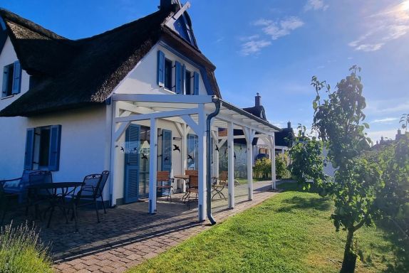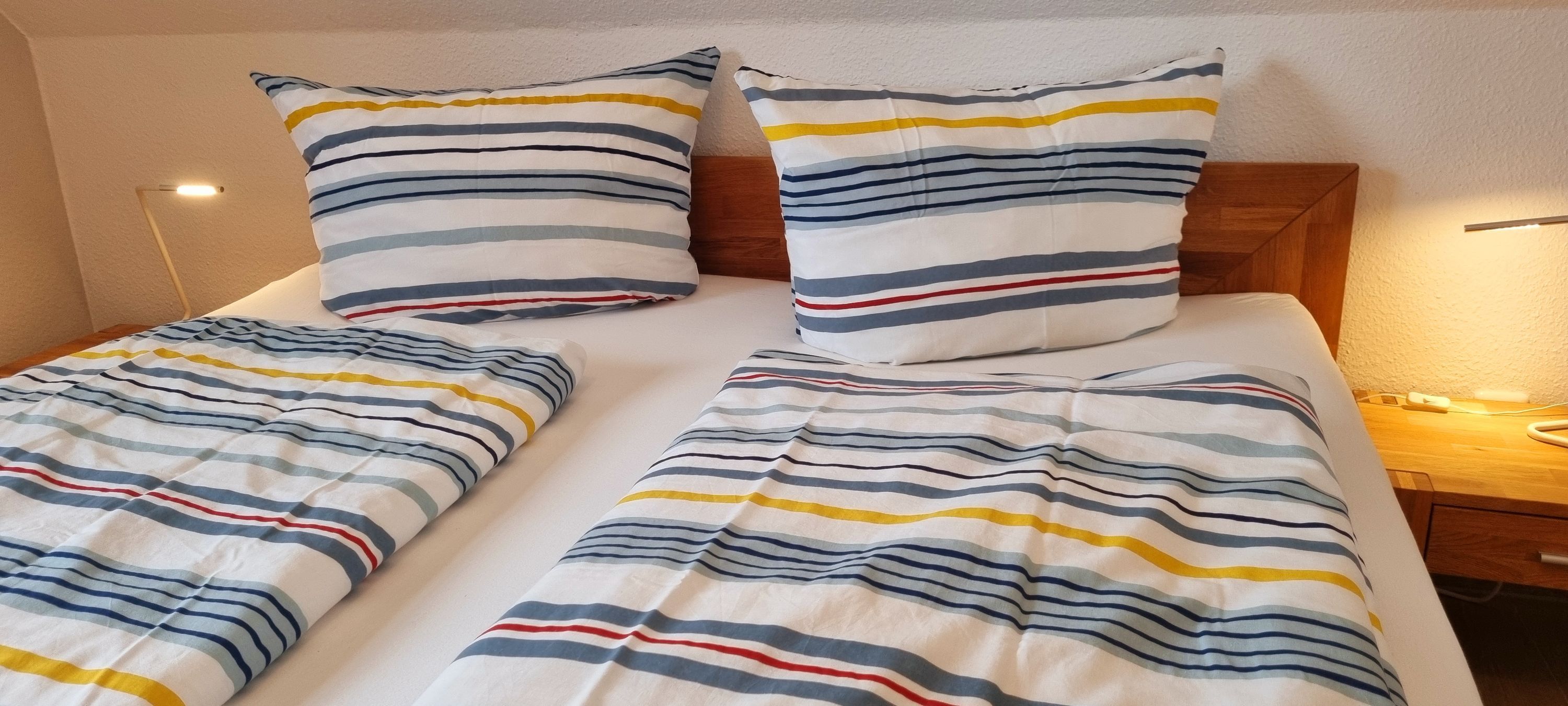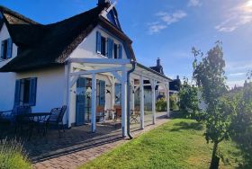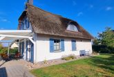 Im Obergeschoss finden Sie zwei großzügige Schlafzimmer (je 15 qm) und ein Bad vor. Das Schlafzimmer mit Seeblick ist mit einem Doppelbett (180x200), einem eingebauten Schlafzimme, einer Kommode, zwei Nachttischen und einem zweiten TV ausgestattet. Ein Kinderreisebett findet hier ebenfalls Platz und kann auf Anfrage zur Verfügung gestellt werden. Im Kinderzimmer befinden sich zwei Einzelbetten (90x200), ein Schrank, eine Kommode und zwei Nachttische. Fliegenschutzgitter zum Lüften sind angebracht. Zum Verdunkeln dienen die Klappläden des Reethauses. Ihr Urlaub beginnt sofort - die Bettwäsche ist inklusive und am Anreisetag bereits frisch bezogen. Das moderne Vollbad unter der charakteristischen Fledermausgaube sorgt für ein behagliches Wohngefühl. Es ist mit hochwertigen Sanitärelementen (eine Badewanne und einer Dusche) ausgestattet. Ein Fön ist ebenfalls vorhanden. Die überdachte Südterrasse ist mit Gartenmöbeln möbliert und der große Garten mit Außengrill lädt zum Entspannen und Spielen ein. Das Gartenhäuschen zum Unterstellen von mitgebrachten Fahrrädern steht im eingefriedetem Garten. Ein Fahrradständer und Parkplatz befinden sich direkt auf dem Grundstück. Der Naturstrand ist in ca. 500 m zu erreichen.