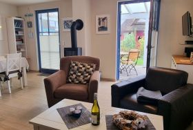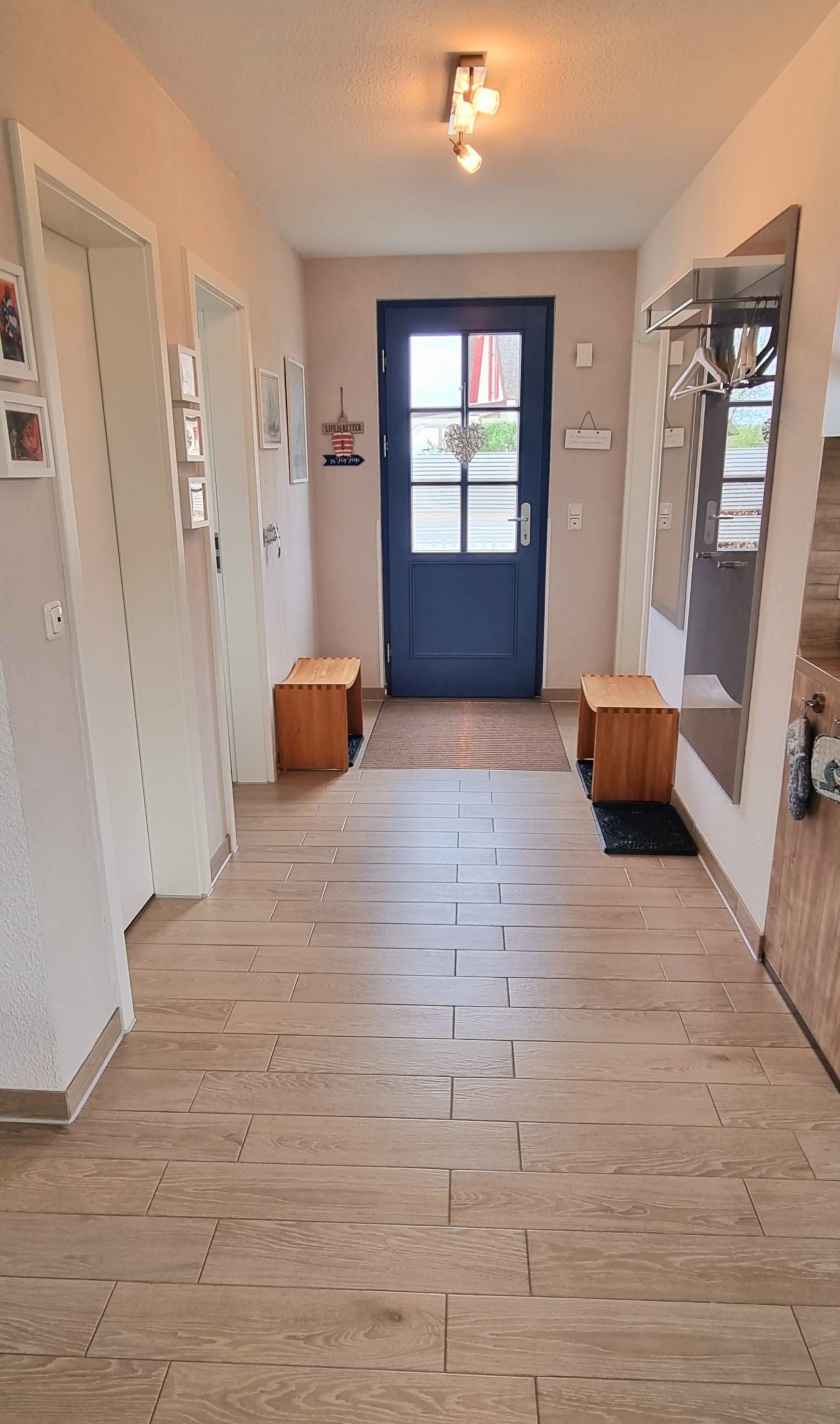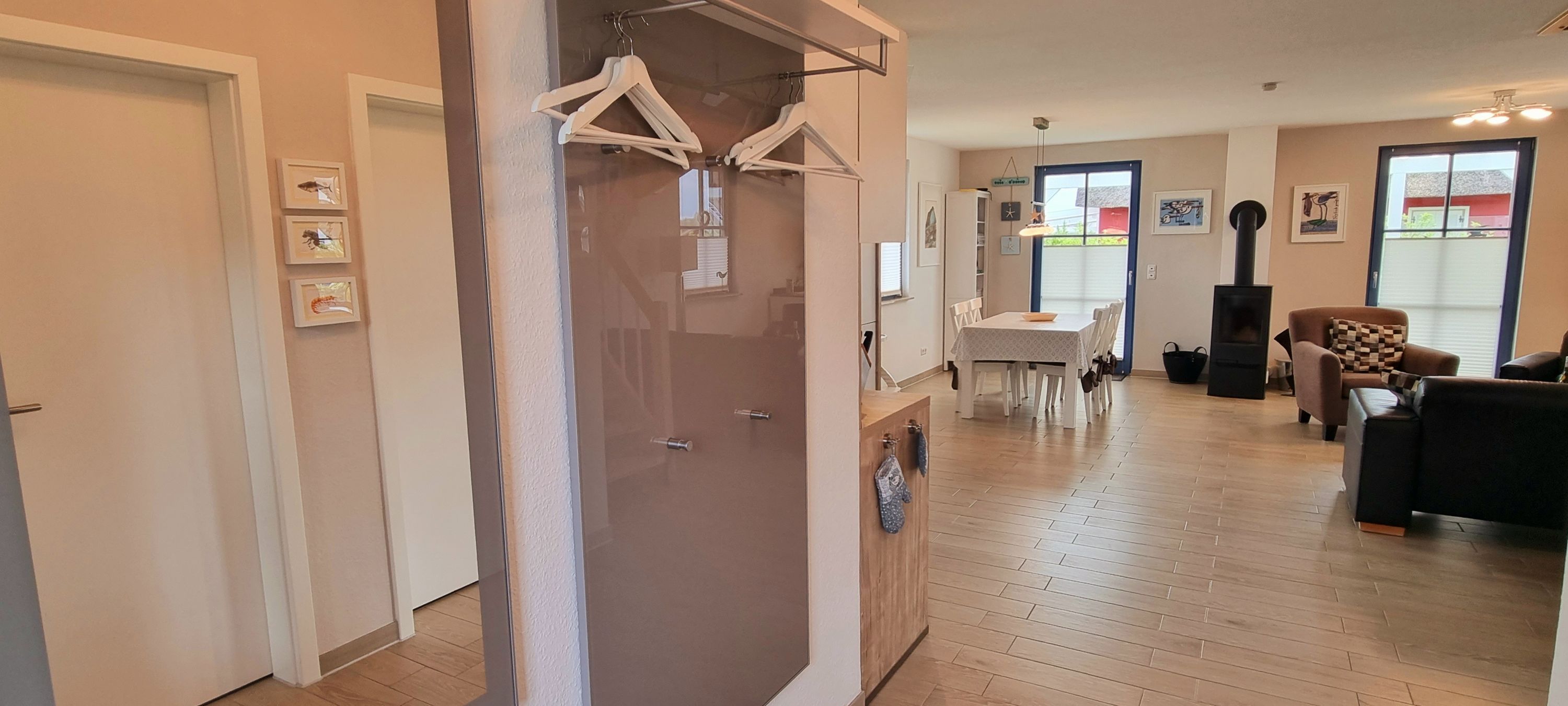 Das in 2014 errichtete Reetdachhaus mit einer Wohnfläche von 97 qm befindet sich in der neuen Ferienhaussiedlung „De Poeler Drift“ in Zierow. Das mit Echtholzmöbeln, Sprossenfenstern und Fensterläden ausgestattete Feriendomizil lädt zu jeder Jahreszeit an die mecklenburgische Ostsee ein. Ob im schönen Sommer, denn der Strand ist nicht weit, zudem gibt es einen umlaufenden Garten, aber auch in der kälteren oder auch schmuddeligen Jahreszeit, denn sowohl eine Sauna als auch ein Kaminofen sind vorhanden. Es erwartet Sie ein komplett gefliestes, mit Fußbodenheizung ausgestattetes Reetdachhaus. Eine hochwertige Innenausstattung lässt keine Wünsche offen. Das Erdgeschoss empfängt Sie mit einem großen Wohn-/Essbereich mit offener Küche und bietet ausreichend Platz für die ganze Familie. Die integrierte Küche ist voll ausgestattet mit einem hochwertigen Backofen mit Induktionskochfeld, einem Kühlschrank mit Gefrierfach, einem Geschirrspüler, Kaffeemaschine, Toaster und Wasserkocher, aber auch ein Eierkocher und Mixer sind vorhanden. Eine Ledercouchgarnitur und Sessel laden zu einem gemütlichen Abend ein. Ein Flach-TV, Blue-Ray-Player und Bluetooth-Stereoanlage bieten Unterhaltung, zudem stehen einige Bücher, Reiseführer und Spiele zur Verfügung. Im Wohnbereich steht der Kaminofen, der wohlige Wärme in der kalten Jahreszeit schenkt. Kaminholz ist mitzubringen. Der Essbereich bietet Platz für 4 Personen, ein Kinderhochstuhl ist zusätzlich vorhanden. Weiterhin befinden sich im EG ein Tageslicht-Gäste-WC, eine Sauna mit Komfortdusche und ein Hauswirtschaftsraum mit Waschmaschine, Wäscheständer, Staubsauger, Bügeleisen, Bügelbrett und Putzutensilien.