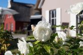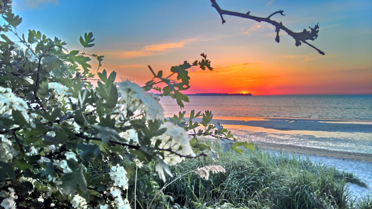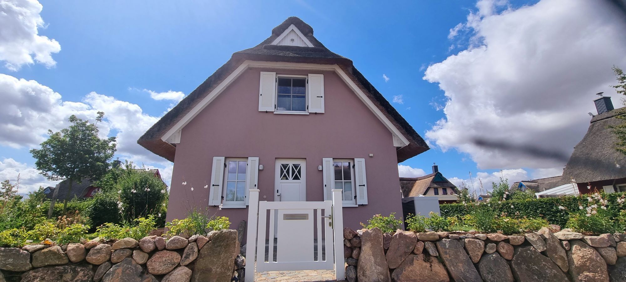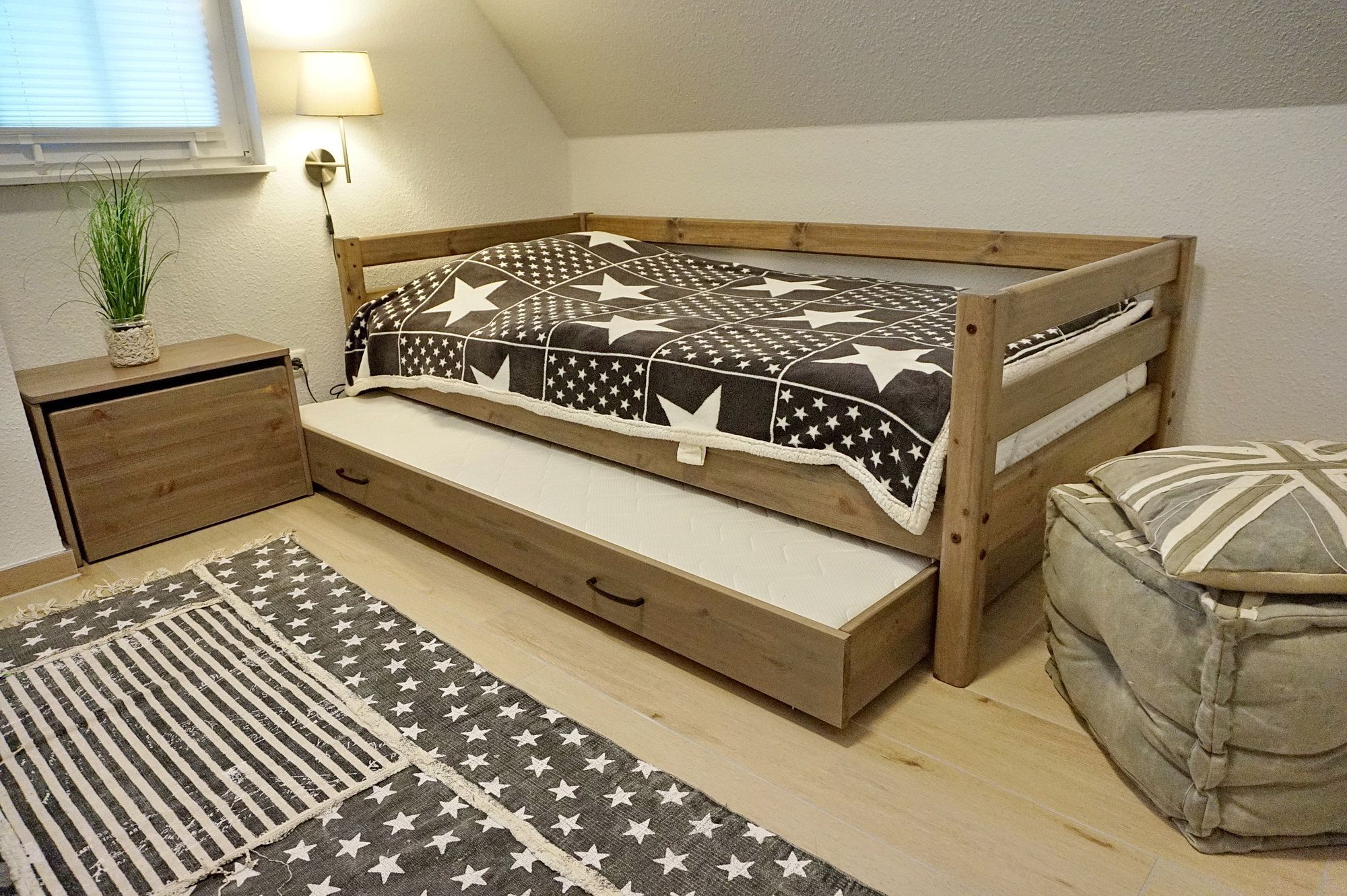Im Obergeschoss finden Sie zwei großzügige Schlafzimmer (jeweils 15 m²) und ein Bad vor. Schlafzimmer A ist mit einem Doppelbett (180x200), Schrank, Kommode und einer gemütlichen Sitzecke mit Lesesessel ausgestattet. Im Schlafzimmer B befinden sich zwei Einzelbetten (90x200) mit je einem weiteren komfortablen Unterbett (Lattenrost und vollwertige Matratze) ein Schrank, zwei Nachttische und ein Schreibtisch. Die zwei Zusatzbetten können separat aufgestellt werden. Somit ideal für Familien mit bis zu 4 Kindern. Die Bettwaren sind für Allergiker geeignet. Die Schlafzimmer verfügen über Fenster mit integrierten Insektenschutzrollos. Das moderne Bad unter der charakteristischen Fledermausgaube sorgt für ein behagliches Wohngefühl. Neben hochwertigen Sanitärelementen finden Sie ein Bidet, eine Badewanne und eine bodengleiche Dusche mit Echtglasduschabtrennung vor. Die Südterrasse ist mit einem Tisch mit zwei Stühlen, zwei Bänken und einem Sonnenschirm, sowie einem Strandkorb und Gartenliegen zum Relaxen ausgestattet. Ein kleiner Elektrotischgrill ist vorhanden. Der Garten lädt zum Entspannen und Spielen im Holzboot ein. Zwei Stellplätze befinden sich direkt auf dem Grundstück. Das Grundstück ist umzäunt. Eine E-Ladestation geg. Gebühr steht zur Verfügung.