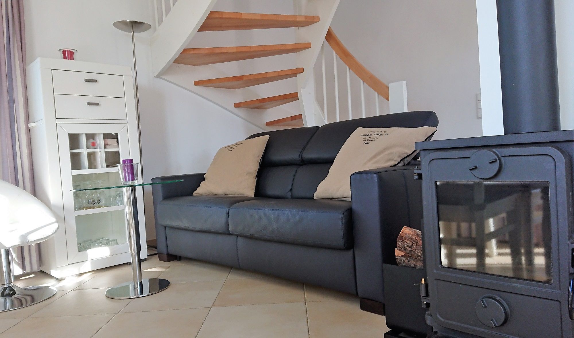 Im Erdgeschoss befindet sich der Wohn- Essbereich mit Kaminofen, gemütlicher Ledercouch (Schlafcouch 140x200 m für 5. & 6. Person) und Esstisch mit viel Platz.