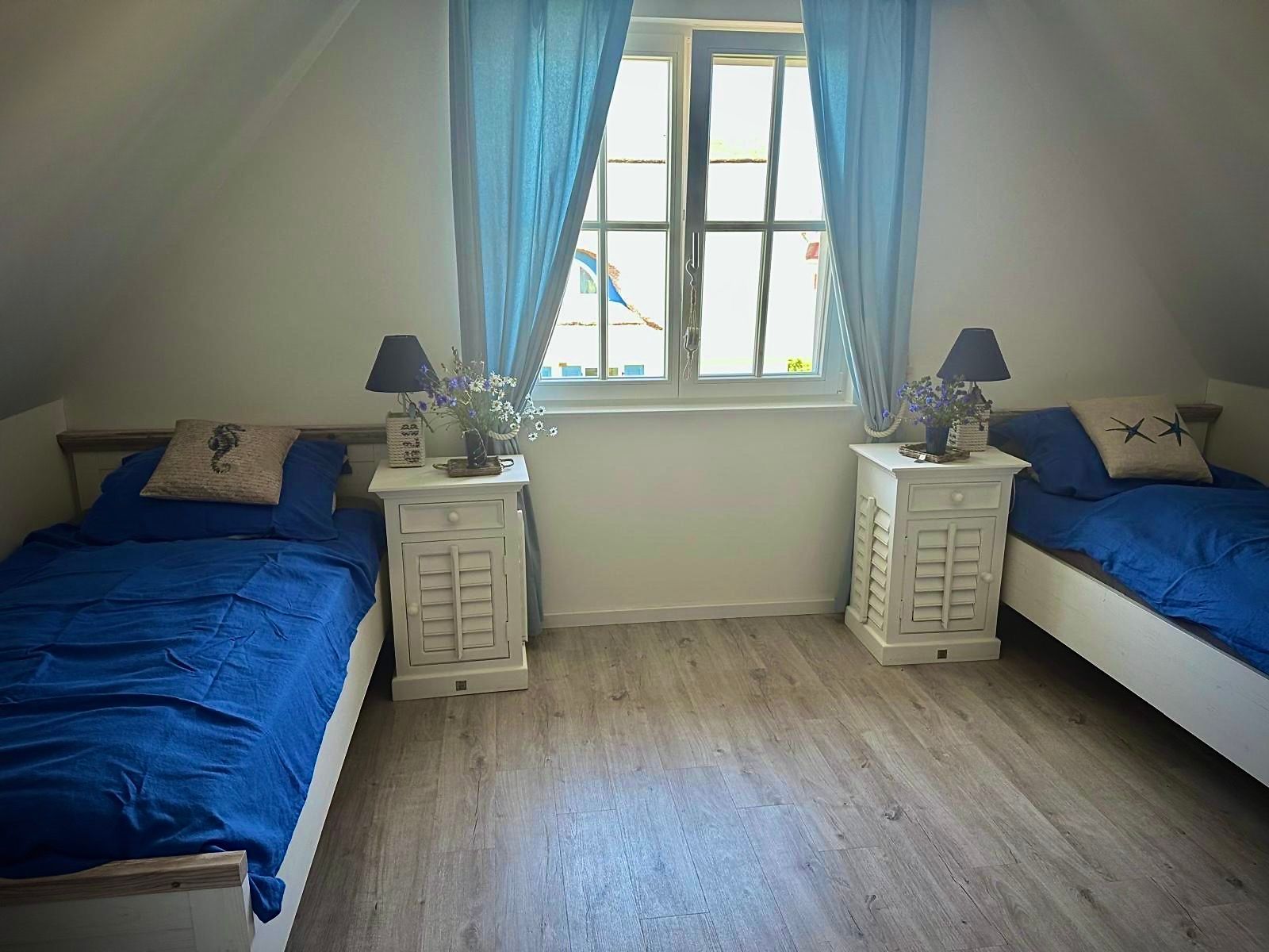 Im Obergeschoss befinden sich die zwei Schlafzimmer und das Duschbad. Das erste Schlafzimmer ist mit einem Doppelbett, Kommode und Schreibtisch ausgestattet. Im zweiten Schlafzimmer stehen zwei Einzelbetten und eine weitere Kommode. Die Bettwäsche ist gegen Gebühr buchbar.