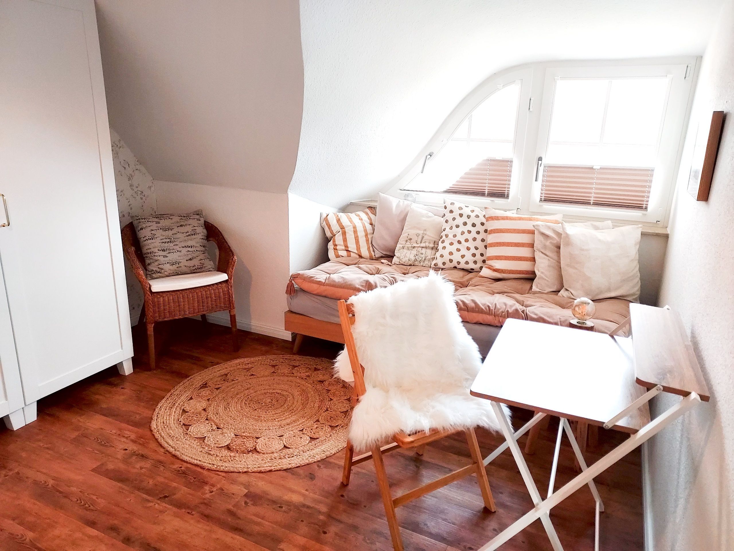 Das zweite Schlafzimmer bietet einen wunderbaren Rückzugsort für Jung und Alt. Es ist mit einem Doppelbett, Kleiderschrank und einem Einzelbett eingerichtet, welches zu Lesestunden einlädt.