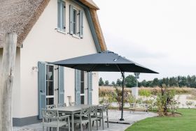 Natürlich gibt es auch einen Gasgrill und einen großen Tisch mit 8 Stühlen auf der nach Südwesten ausgerichteten Terrasse. Auch hier sitzen kleine Kinder gerne am eigenen Tisch im Schatten unter dem großen schwenkbaren Sonnenschirm.