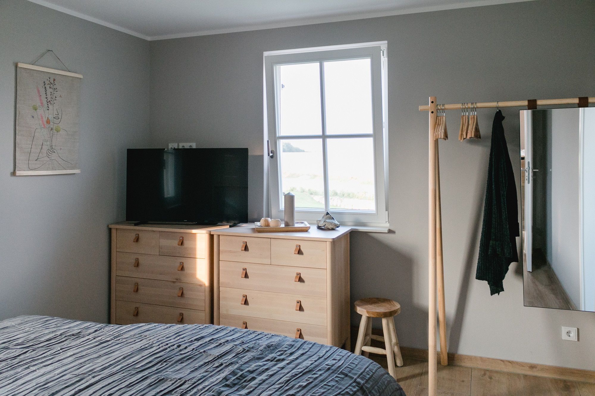 Vom Wohnzimmer abgehend gelangen Sie in ein geräumiges Schlafzimmer mit traumhaftem Blick auf die umliegenden Felder. Hier können Sie aus dem gemütlichen 1,80m Doppelbett den Sonnenaufgang genießen. Das Schlafzimmer verfügt ebenfalls über einen Smart-TV mit Satellitenanschluss.