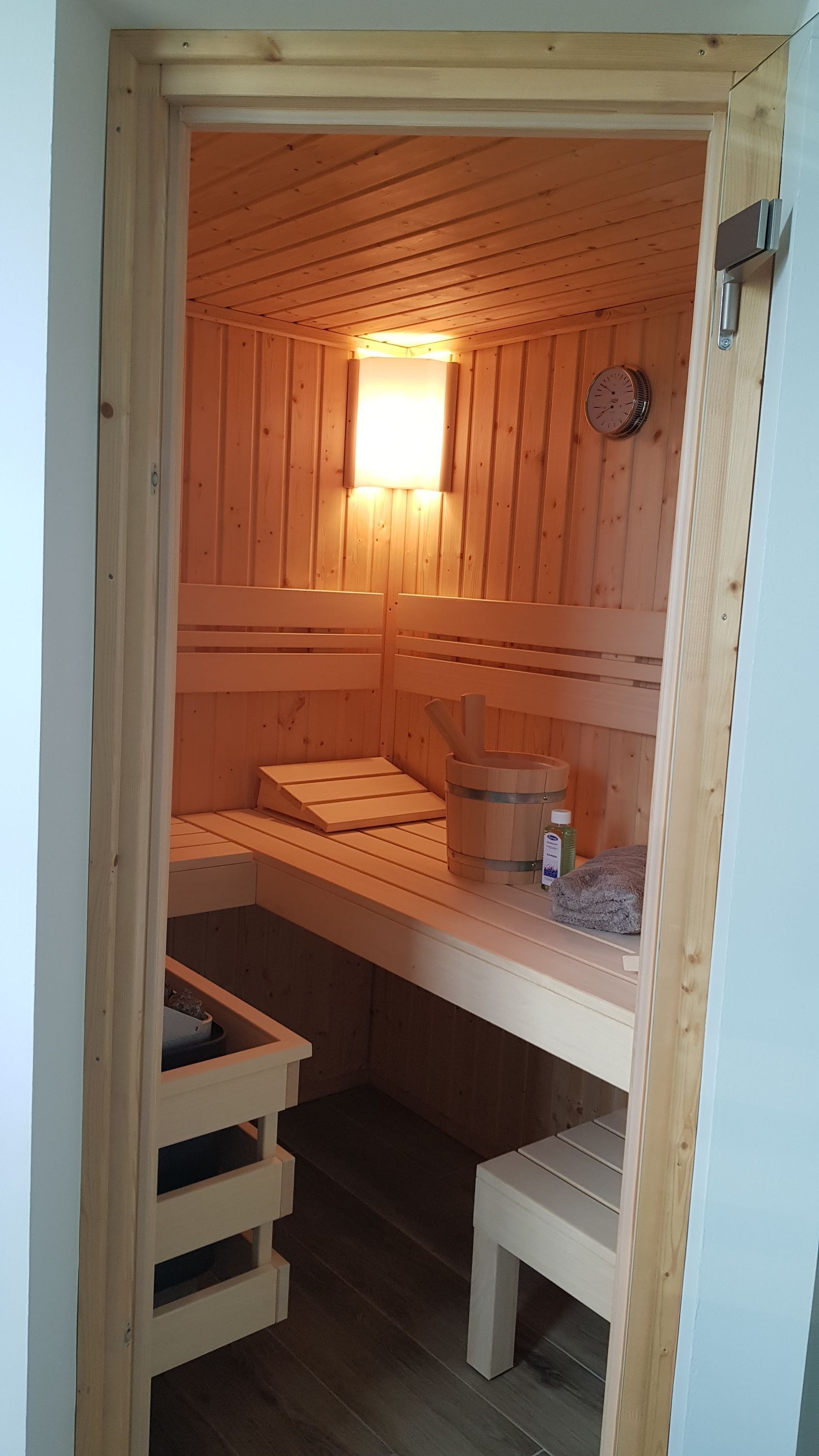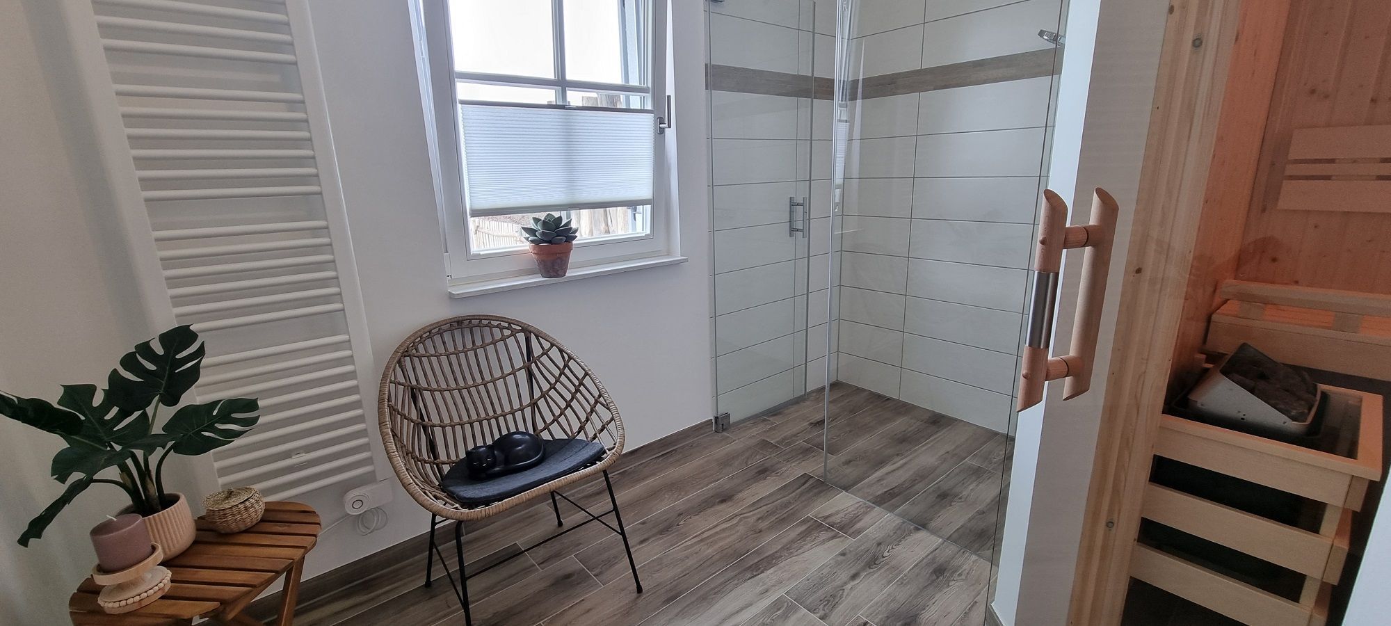 Die moderne Küchenzeile ist voll ausgestattet. Im Erdgeschoss befindet sich des Weiteren das Wellnessbad mit Sauna und bodengleicher Dusche. Hier können Sie von Ihrem Alltag entfliehen. Das Gäste-WC und der Hauswirtschaftsraum mit Waschmaschine runden das Erdgeschoss ab.