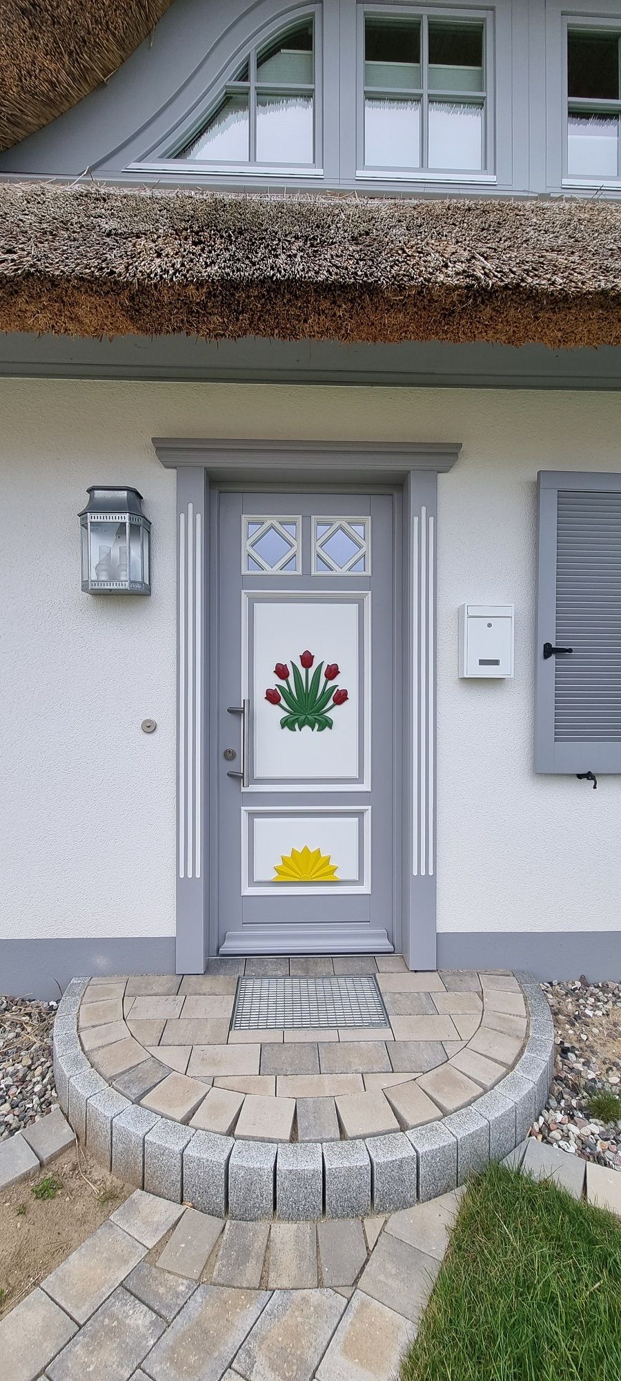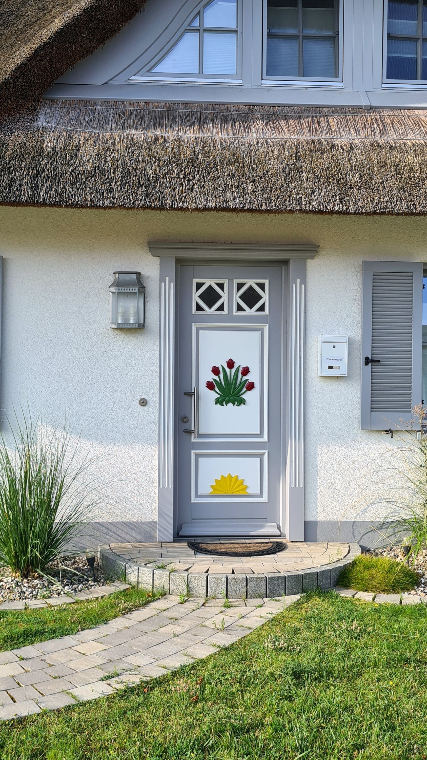 Die typische Seemannstür mit den schönen Ornamenten heißt Sie willkommen im Haus Strandmuschel.