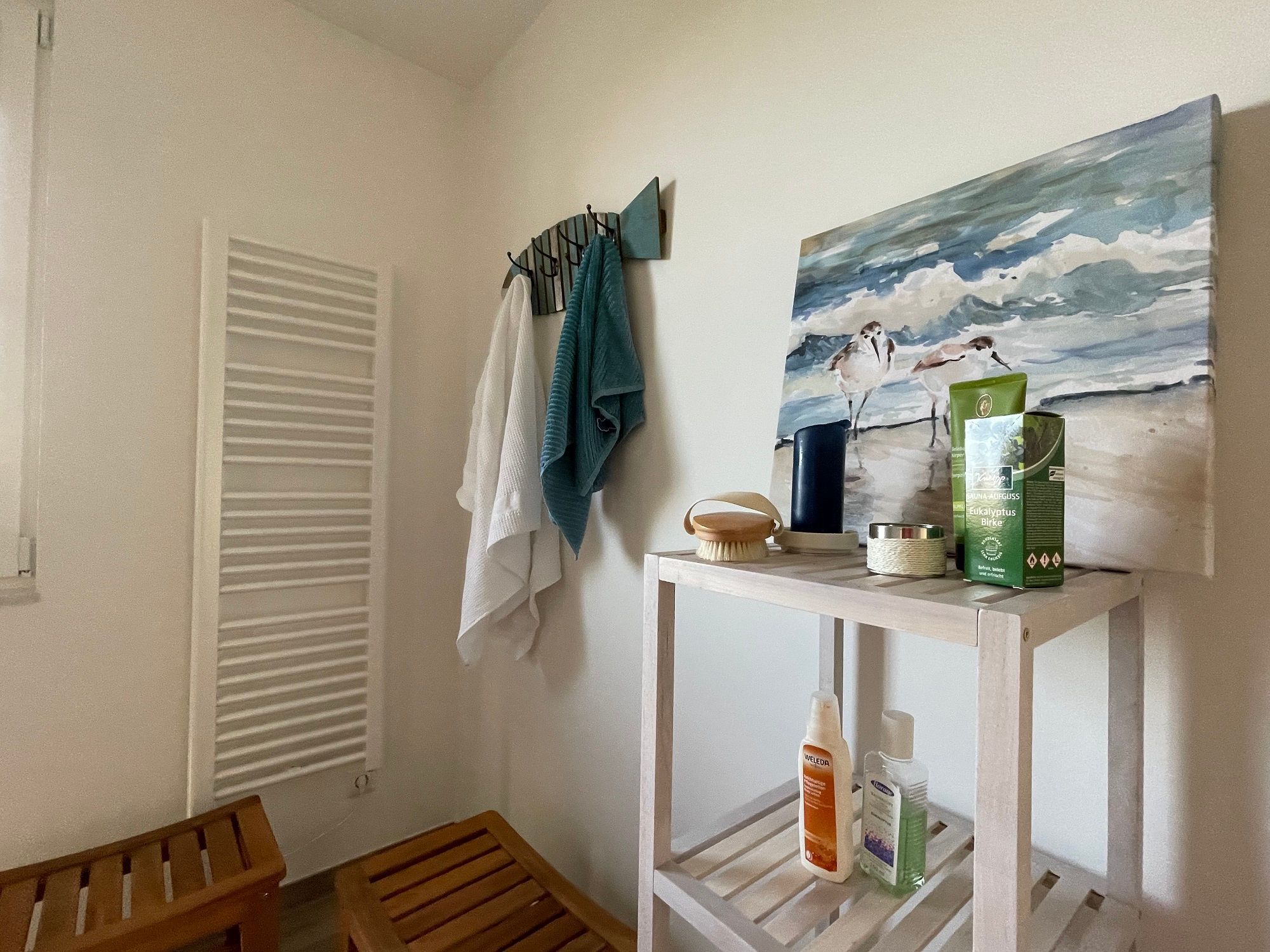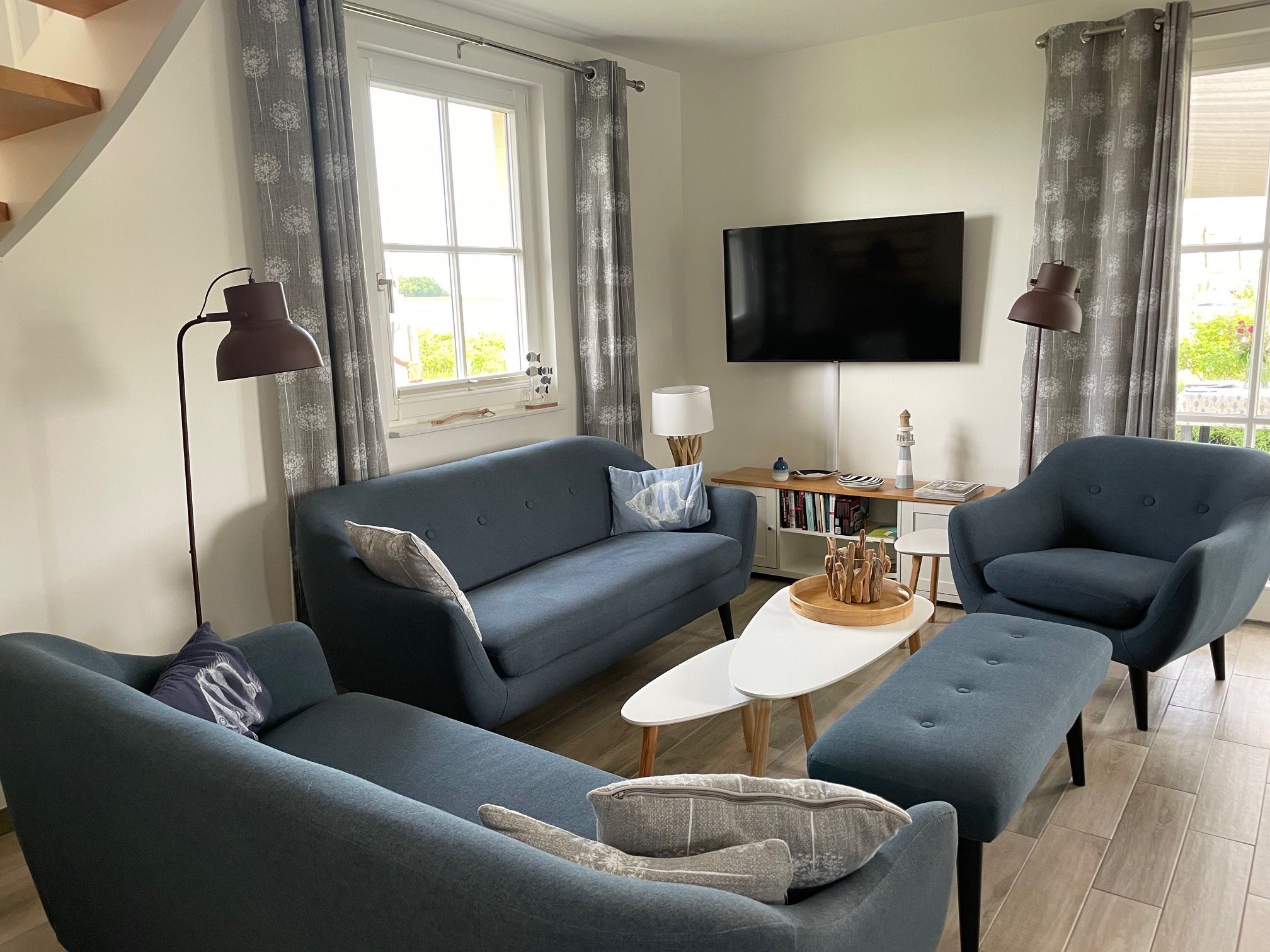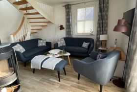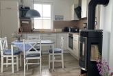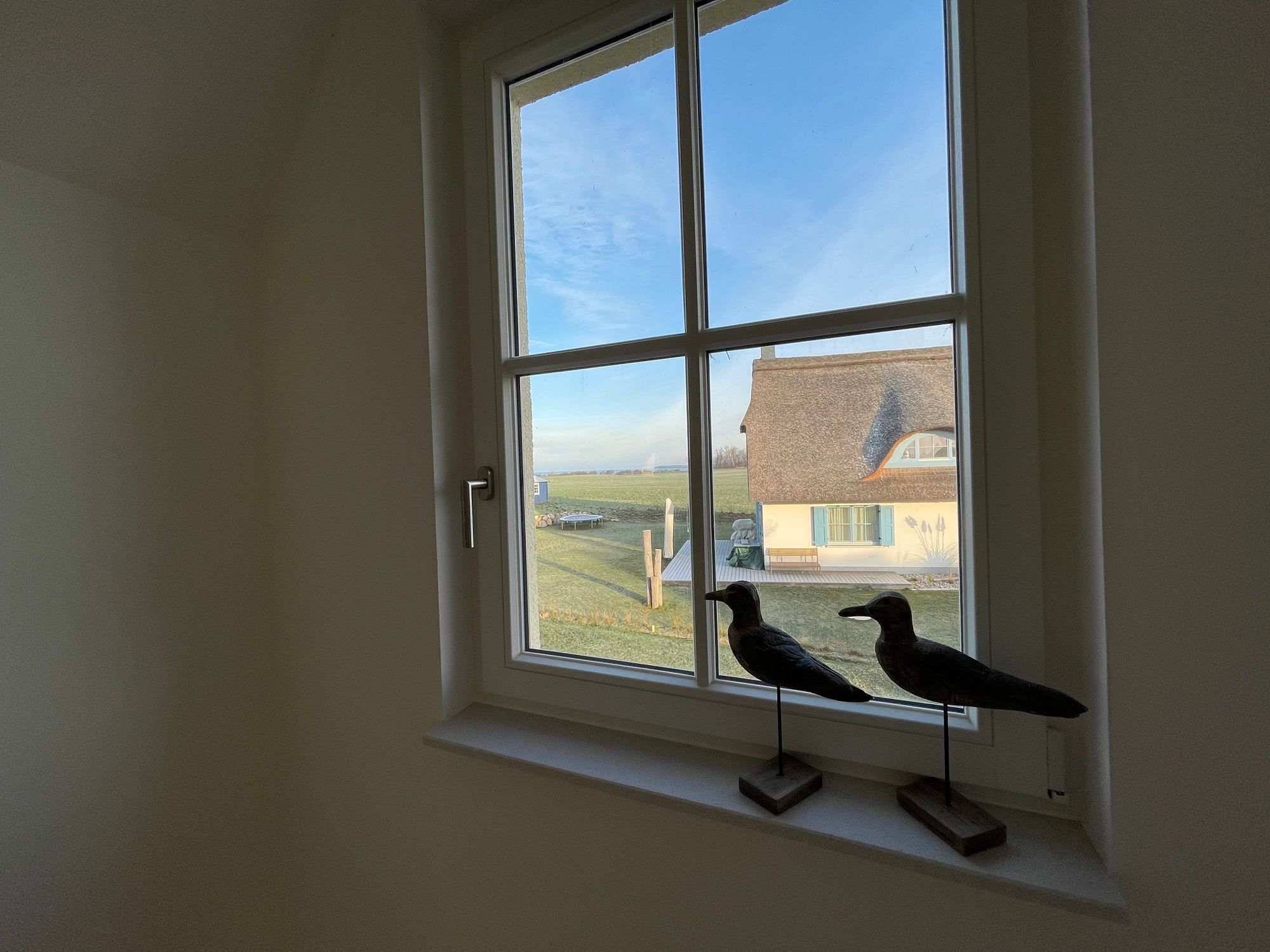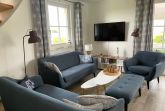 Das ganze Haus ist im skandinavischen Stil eingerichtet und mit Fußbodenheizung ausgestattet. Die Küche ist modern und mit vielen Extras ausgestattet. Das von allen Seiten sichtbare Kaminfeuer bringt eine wohlige Stimmung ins Haus. Die Sauna mit Wellnessdusche im Erdgeschoss bietet angenehm Platz zum Erholen. Durch das Fenster des Ruheraumes kann der Blick über die Felder bis zum Meer schweifen. Das Gäste-WC mit Tageslicht befindet sich ebenfalls im Erdgeschoss.