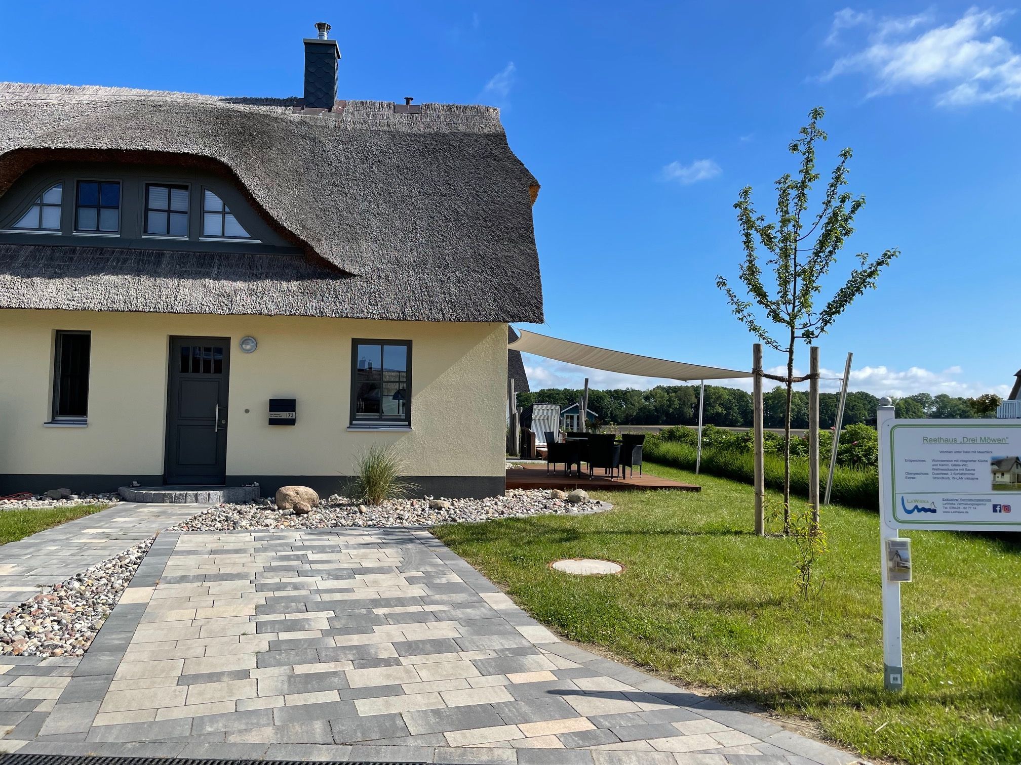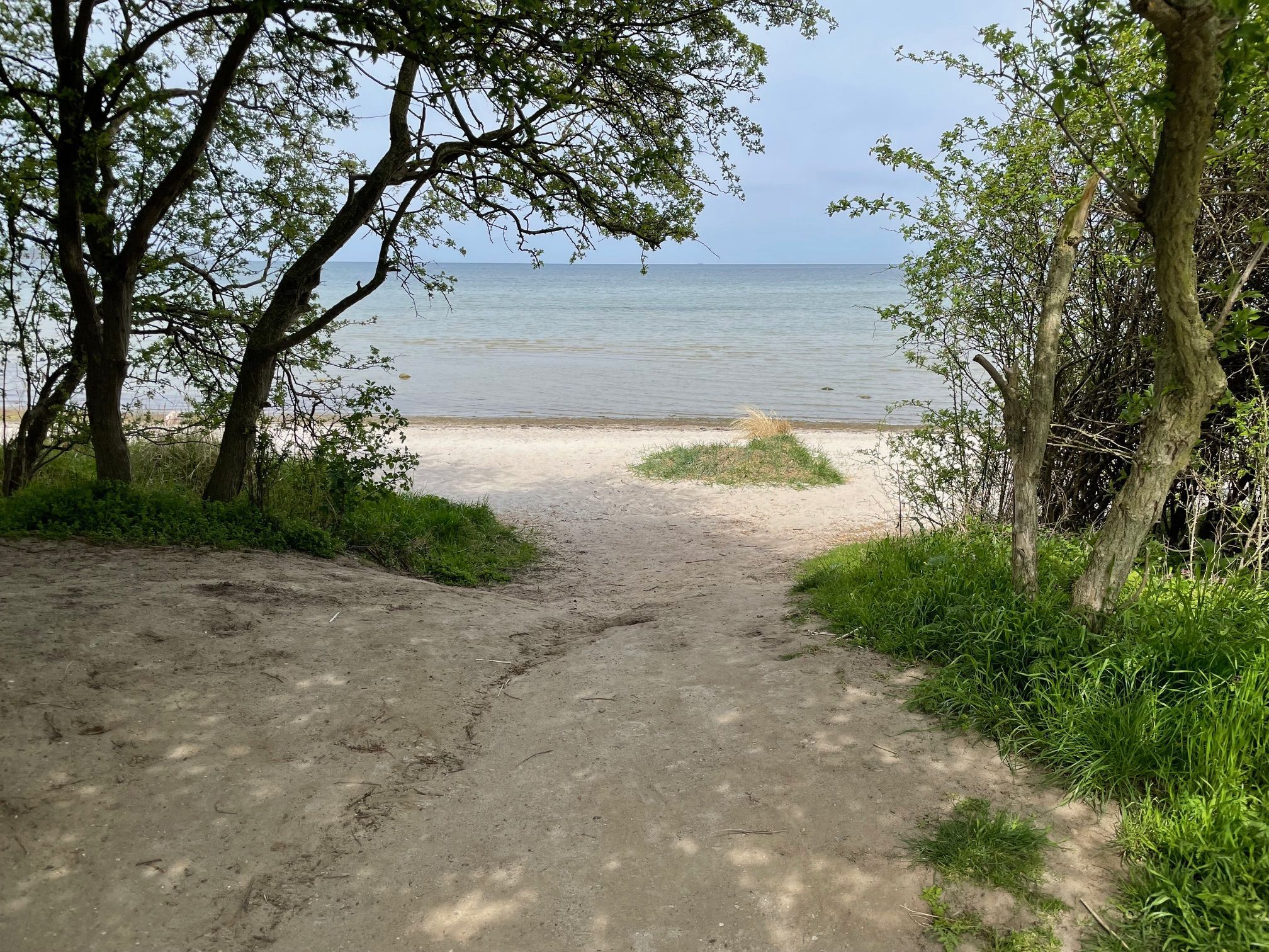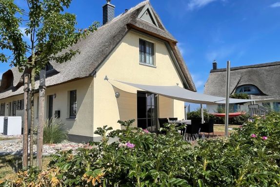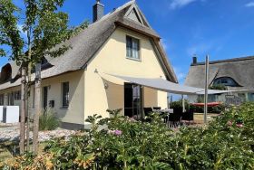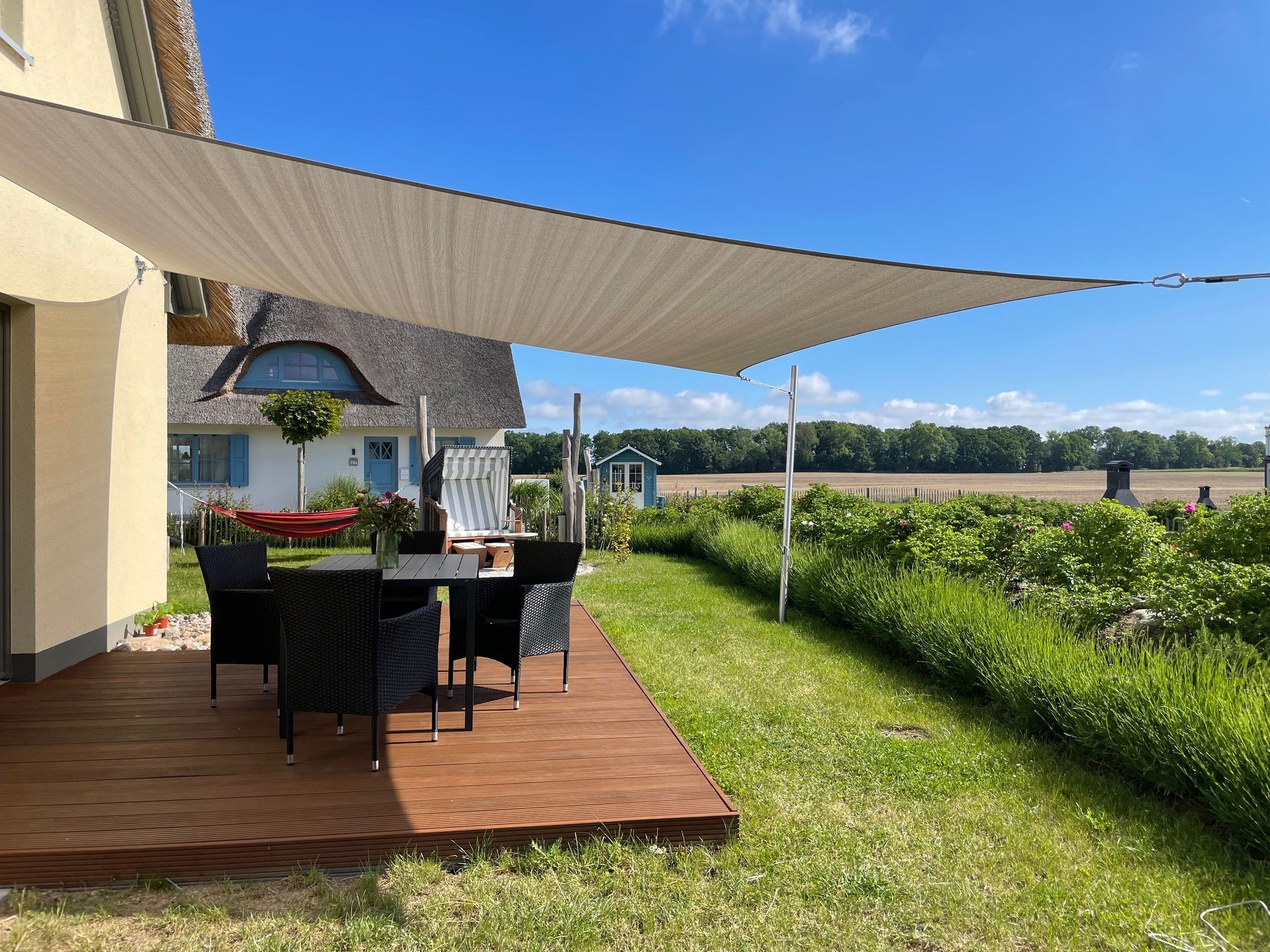 Im Garten stehen bequeme Gartenmöbel, ein eigener Strandkorb und eine Hängematte bereit. Die sonnengeschützte Holzterrasse lädt zum barfußlaufen ein. Auf der den Garten umgebenden Natursteinmauer sind Wildrosen gepflanzt. Im Mai zieht ein zarter Duft ums Haus. Im Herbst und Winter finden die Vögel in den Hagebutten Nahrung und Unterschlupf. Zum Grillen steht ein Elektrogrill von Weber zur Verfügung. Zum Naturstrand sind es ca. 400 m.
