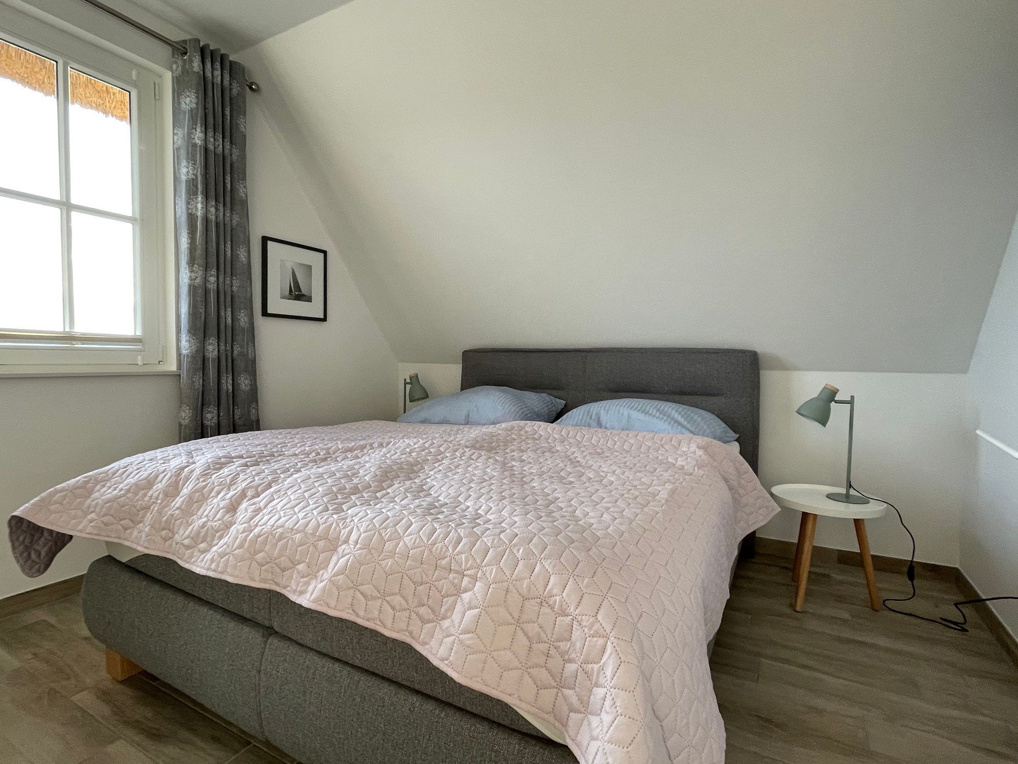 Im oberen Bereich stehen Ihnen zwei Schlafzimmer mit je einem Boxspringbett zur Verfügung. Im 2. Schlafzimmer befindet sich noch ein weiteres Einzelbett. Jedes Schlafzimmer ist mit ausreichend Ablagemöglichkeiten für Kleidung, Kommoden und bequemen Sitzgelegenheiten ausgestattet.