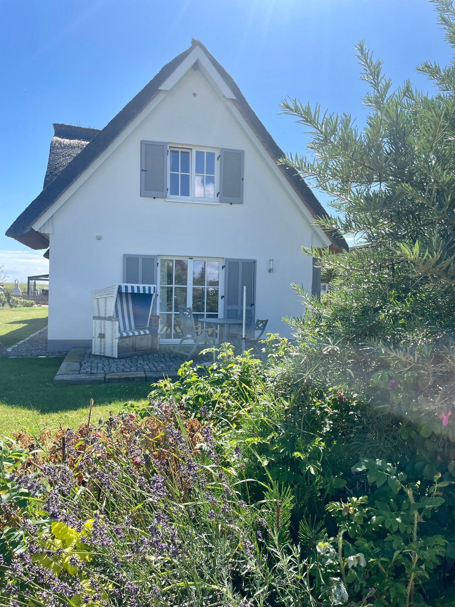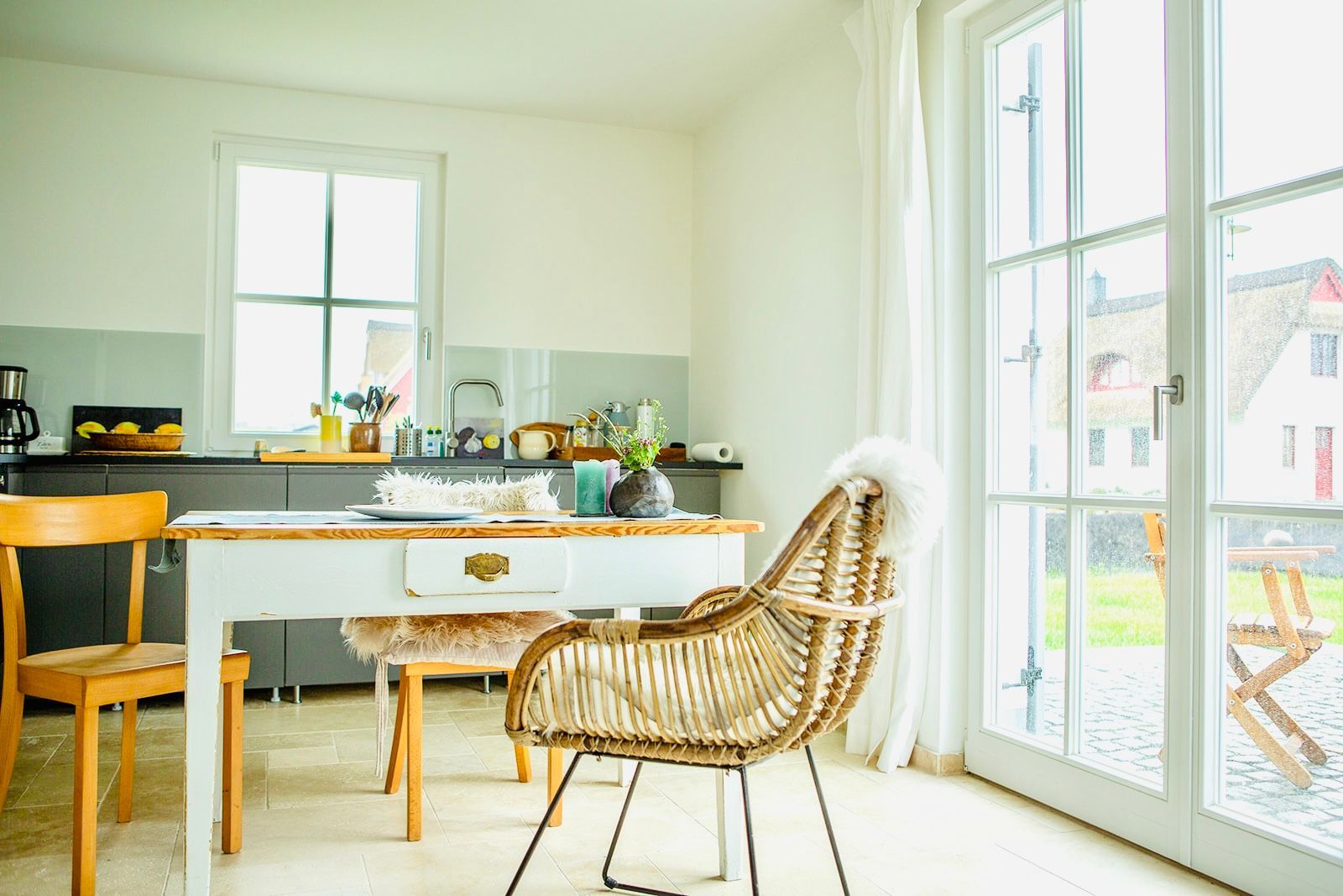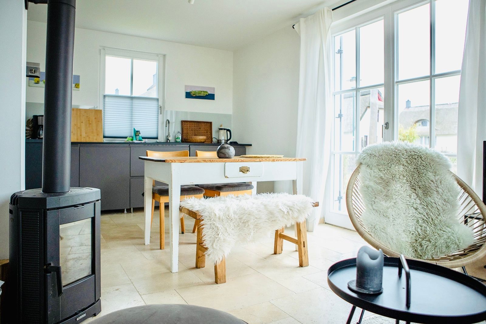 Die 2021 fertiggestellte Reetdach-Doppelhaushälfte wurde von uns liebevoll eingerichtet und ausgestattet. Im Erdgeschoss empfängt Sie die offen gestaltete Wohnküche mit einer voll ausgestatteten Küchenzeile (Backofen, Cerankochfeld, Geschirrspüler, Kaffeemaschine, SodaStream, Toaster, Wasserkocher u.v.m.), einem wunderbaren Essplatz mit Blick in den Garten und eine gemütliche Sofaecke mit Kaminofen. Hier finden Sie alles, um gemeinsam den Tag zu beginnen oder mit einem Kochabend und einem Glas Wein vor dem Kamin ausklingen zu lassen. Eine Auswahl an Gesellschaftsspielen, Spielzeug und (Kinder)Büchern ist ebenfalls vorhanden. Auf derselben Ebene befindet sich auch ein Hauswirtschaftsraum mit Waschmaschine sowie kleinem Gefrierschrank, ein separates WC und ein kleiner, aber feiner Wellnessbereich mit Sauna und begehbarer Rainshower-Dusche.
