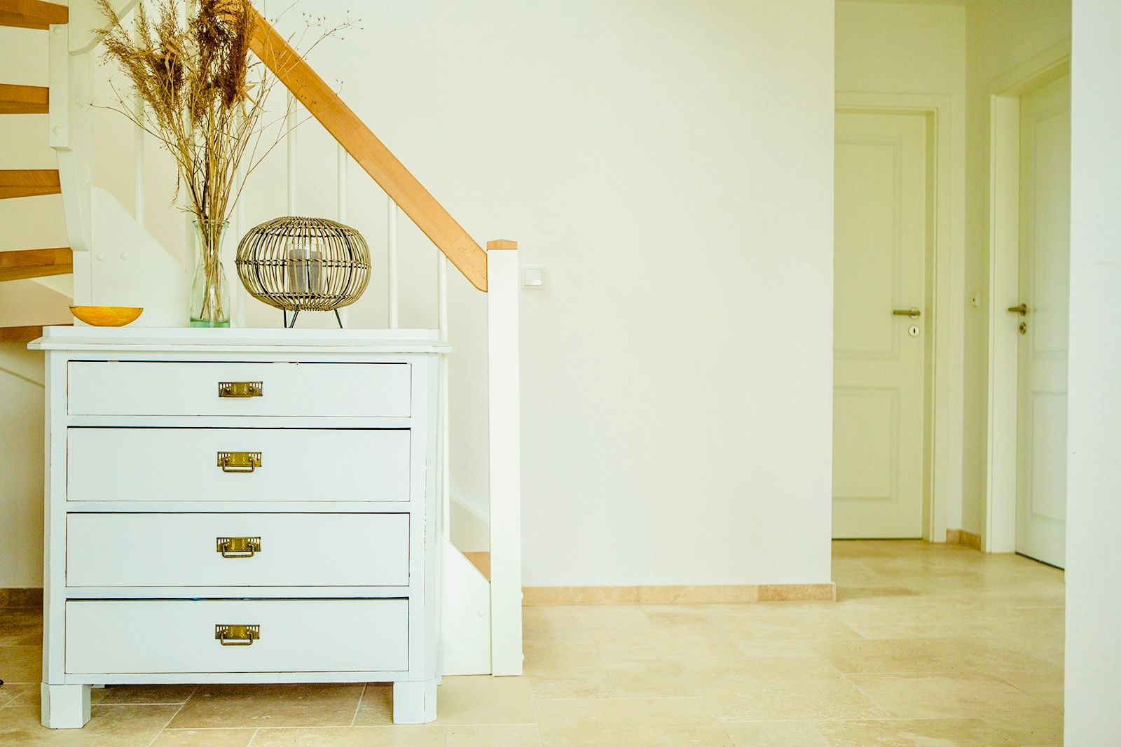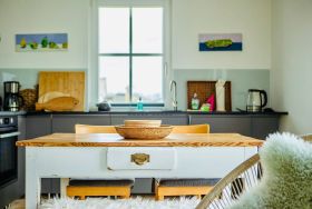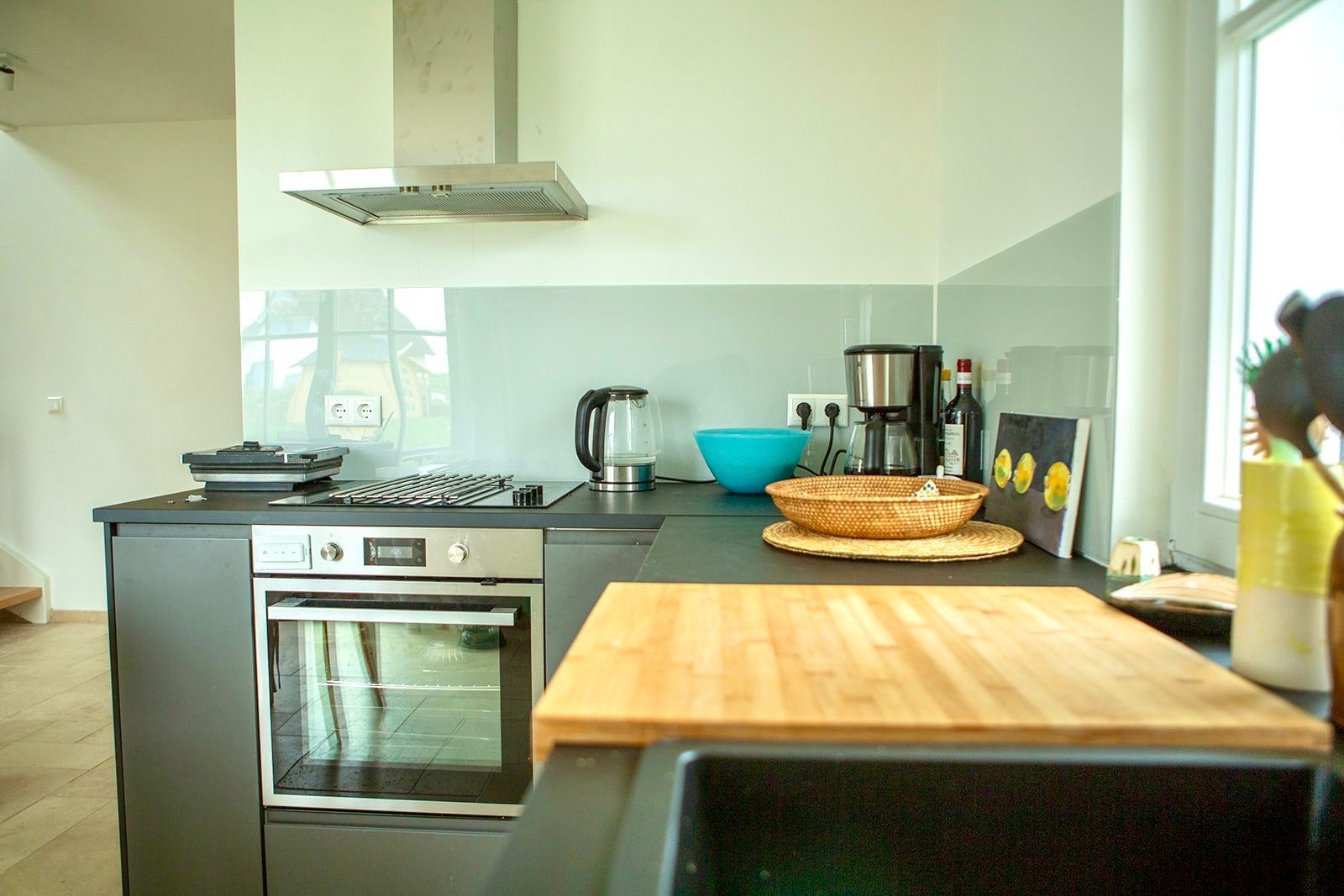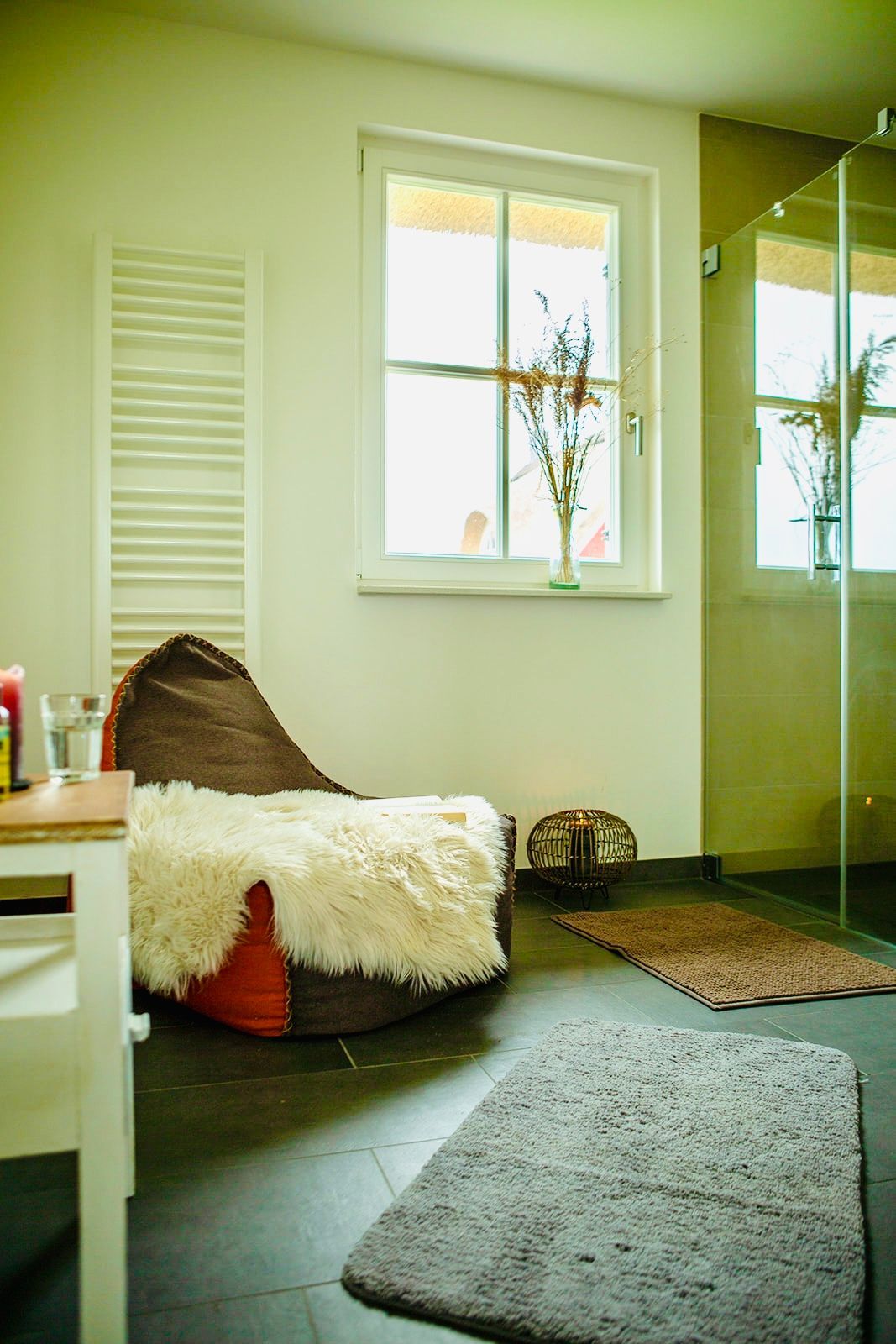 Die 2021 fertiggestellte Reetdach-Doppelhaushälfte wurde von uns liebevoll eingerichtet und ausgestattet. Im Erdgeschoss empfängt Sie die offen gestaltete Wohnküche mit einer voll ausgestatteten Küchenzeile (Backofen, Cerankochfeld, Geschirrspüler, Kaffeemaschine, SodaStream, Toaster, Wasserkocher u.v.m.), einem wunderbaren Essplatz mit Blick in den Garten und eine gemütliche Sofaecke mit Kaminofen. Hier finden Sie alles, um gemeinsam den Tag zu beginnen oder mit einem Kochabend und einem Glas Wein vor dem Kamin ausklingen zu lassen. Eine Auswahl an Gesellschaftsspielen, Spielzeug und (Kinder)Büchern ist ebenfalls vorhanden. Auf derselben Ebene befindet sich auch ein Hauswirtschaftsraum mit Waschmaschine sowie kleinem Gefrierschrank, ein separates WC und ein kleiner, aber feiner Wellnessbereich mit Sauna und begehbarer Rainshower-Dusche.