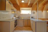 Im gefliesten Wohnbereich gibt es einen offenen Wohnbereich mit Kamin und großem großen Flat-TV, Essplatz und Küche mit komplett ausgestatteter moderner Einbauküche. Von hier aus geht es auf die Terrasse mit Abstellraum und Gartenmöbeln