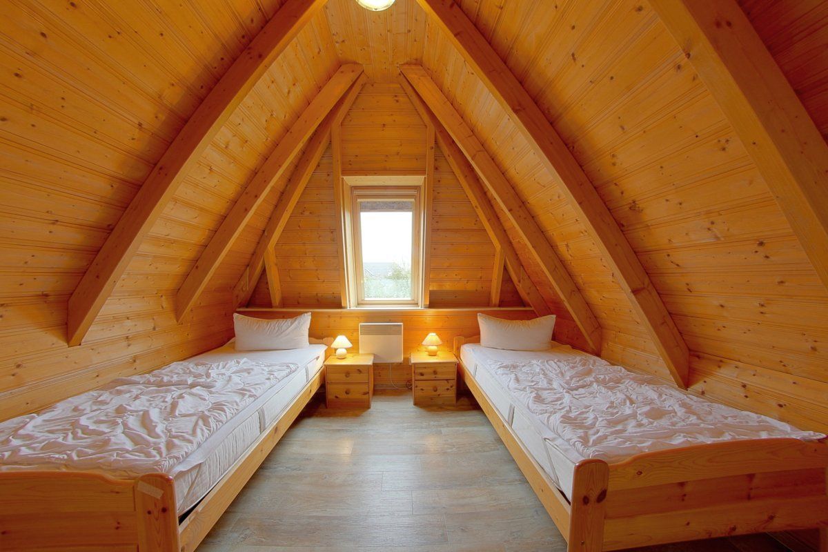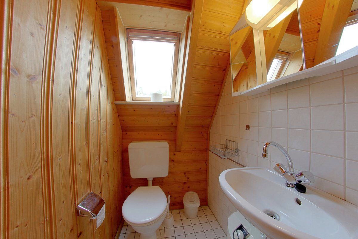 Im Obergeschoss befinden sich zwei weitere Schlafzimmer mit wischbaren Böden und ein WC mit Waschbecken. Ein Schlafzimmer mit Doppelbett und Babyreisebett und ein weiteres Schlafzimmer mit 2 Einzelbetten.