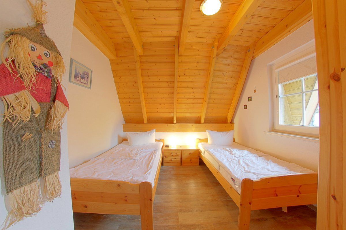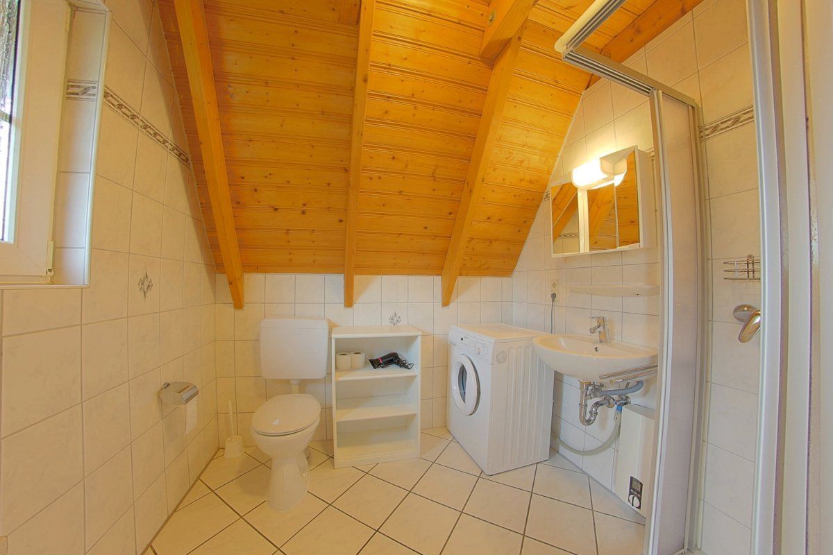 Im Erdgeschoß gibt es ein Schlafzimmer mit zwei Einzelbetten und ein helles Duschbad mit Fenster und Waschmaschine.