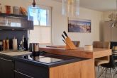 Eine offene Küche mit Theke, 2 Barhockern und einem Glastisch mit 6 komfortablen Stühlen bietet ausreichend Sitzgelegenheiten während der Mahlzeiten. Ein Induktionsherd mit integriertem Dunstabzug, ein Backofen, eine Kaffeemaschine, ein Wasserkocher, ein Eierkocher und sämtlicher Küchenzubehör bieten alle Annehmlichkeiten für gelungene Mahlzeiten. Ein Kühlschrank mit Tiefkühlfach und eine Geschirrspülmaschine sind ebenfalls vorhanden.