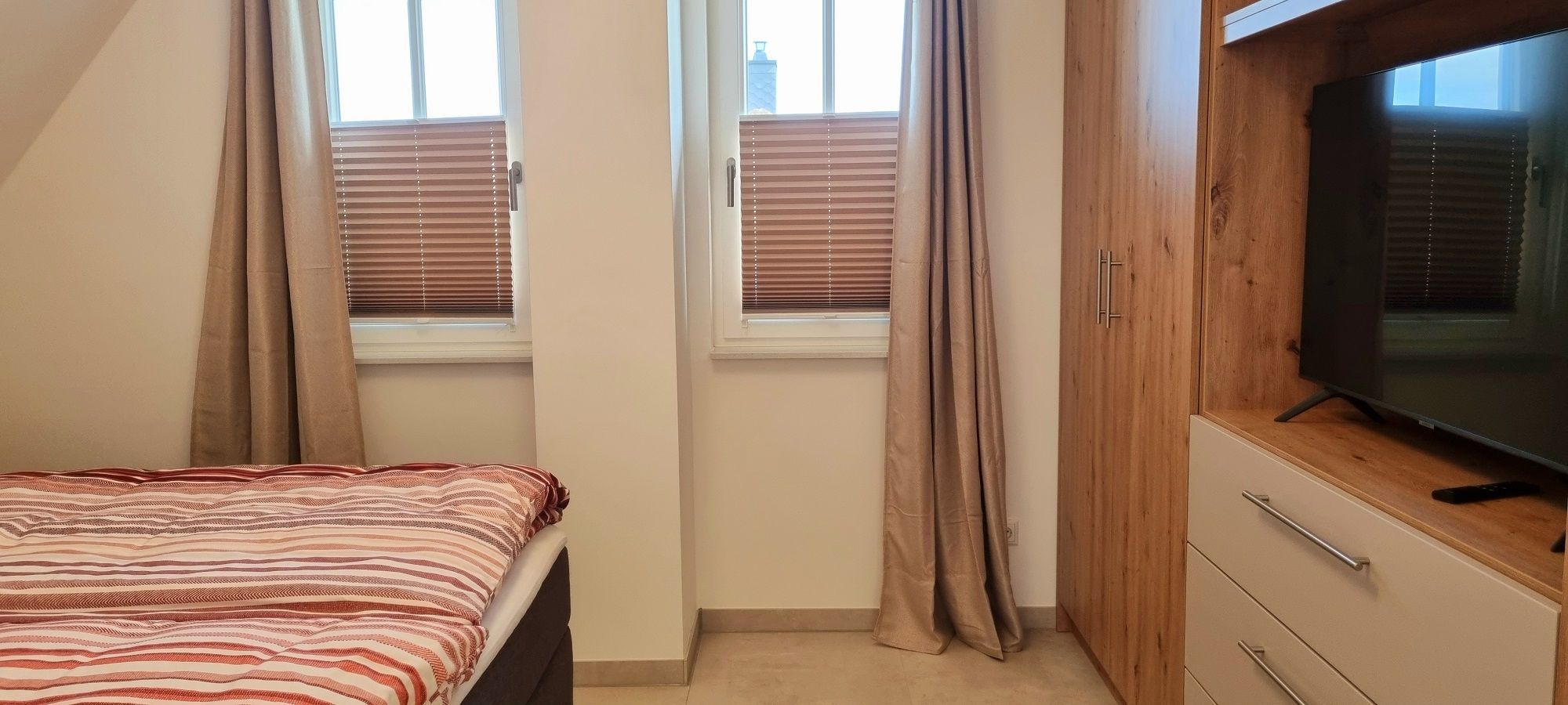 Im Obergeschoß befinden sich 2 Schlafzimmer. Beide sind mit Boxspringbetten für jeweils 2 Personen und mit jeweils einen Wandschrank und Fernseher ausgestattet. Ein Badezimmer mit Wanne, Dusche, WC, Waschbecken, Spiegelschrank und Haartrockner steht zur Verfügung.