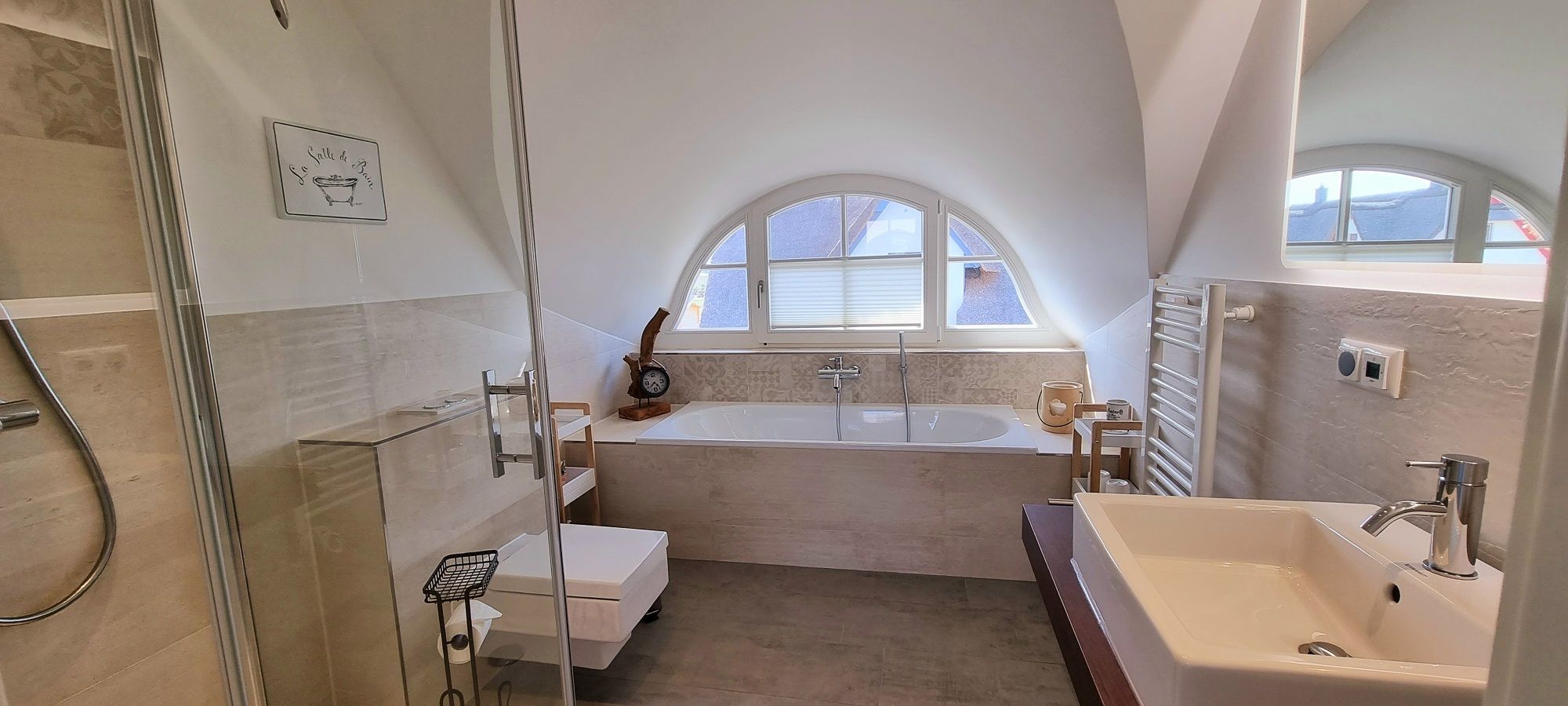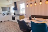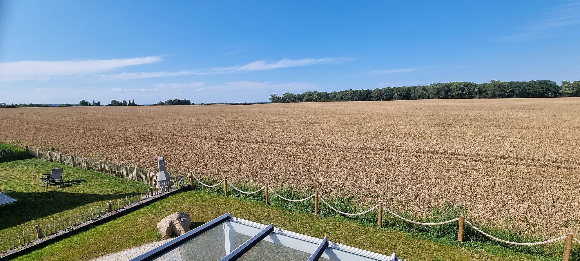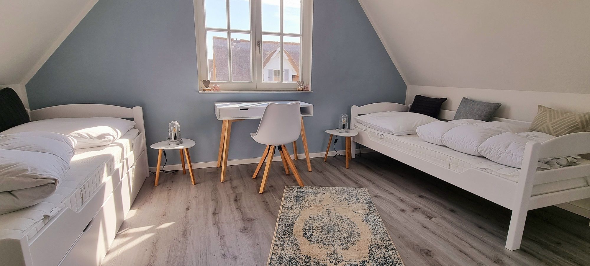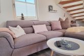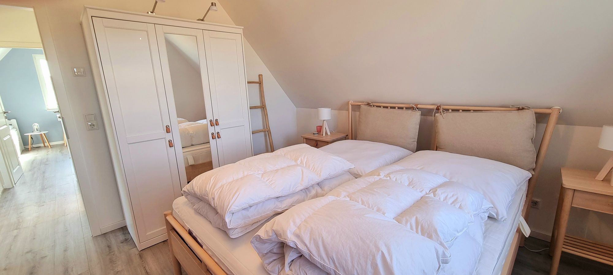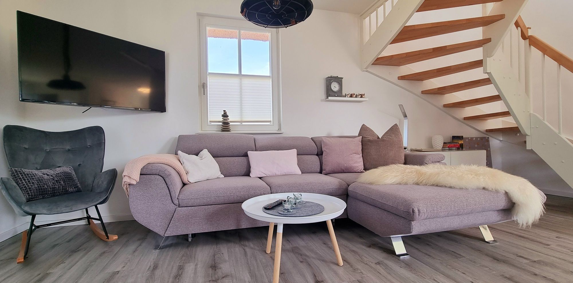 Im Erdgeschoss empfängt Sie die offen und hell gestaltete Wohnküche mit einer Küchenzeile, dem Essbereich und einer gemütlichen Sofaecke mit Kaminofen. Hier kann man gemeinsam den Tag beginnen und den Abend genießen. Im Wohnzimmer befinden sich 2 Türen, die Sie in den Garten mit Blick auf das freie Feld vor Ihnen einladen. Auf der Terrasse sitzen Sie unter einem Glasdach so sitzen Sie immer perfekt geschützt. Egal ob Sonne, Regen oder Wind. Zusätzlich finden Sie einen extra gepflasterten Bereich für Sonnenanbeter und einen unter Bambus aufgestellten, hochwertigen Strandkorb. Ebenfalls im Erdgeschoß befindet sich eine kleine Sauna mit begehbarer Rainshower-Dusche. Im Herbst und Winter bietet Ihnen die Sauna eine wundervolle Möglichkeit zur Regeneration von Körper, Geist und Seele. Zusätzlich gibt es hier noch ein separates Gäste-WC und einen kleinen Hauswirtschaftsraum mit Waschtrockner, kl. Bügelbrett, Bügeleisen, kl. Wäscheständer und Staubsauger. Alle Fenster sind mit Außen Fensterläden, Fliegengittern und Plissees versehen. Die hübsche Holztreppe hinauf geht es zu den beiden Schlafzimmern und einem großzügigen Badezimmer mit Fledermausgabe, Wlan-Radio, einer weiteren Dusche und einer zusätzlichen Badewanne. Hier finden Sie ein Schlafzimmer mit einem Doppelbett (160m x 200m) und ein weiteres Zimmer mit zwei getrennten Betten (90 x 200) - eines davon ist zusätzlich ausziehbar. Sie haben ein Baby oder Kleinkind? Auch ein Kinderreisebett (kostenfrei) und Hochstuhl stehen Ihnen bei uns zur Verfügung. Alle Steckdosen haben zusätzlich eine Kindersicherung und an den Betten jeweils 2 USB-Ports.