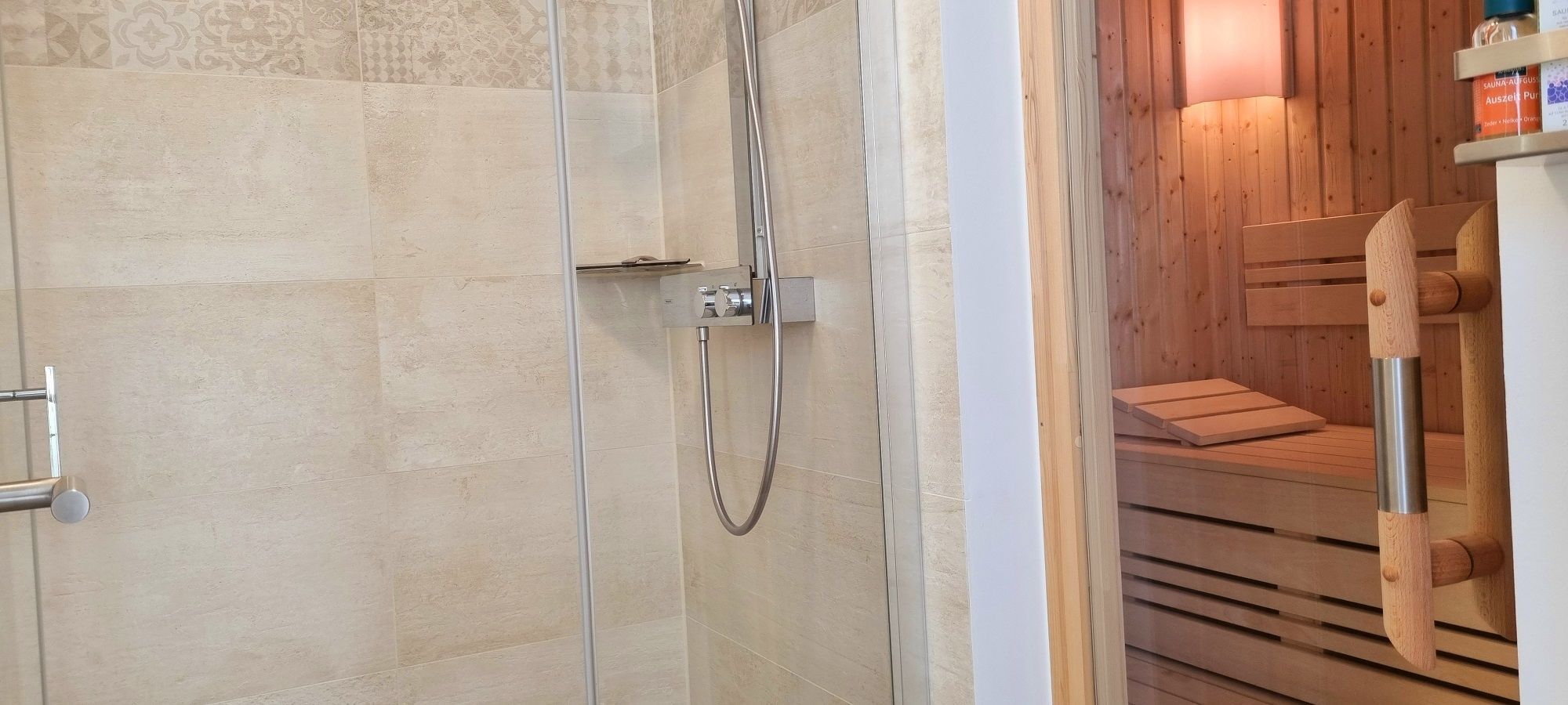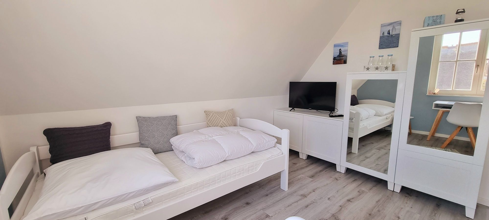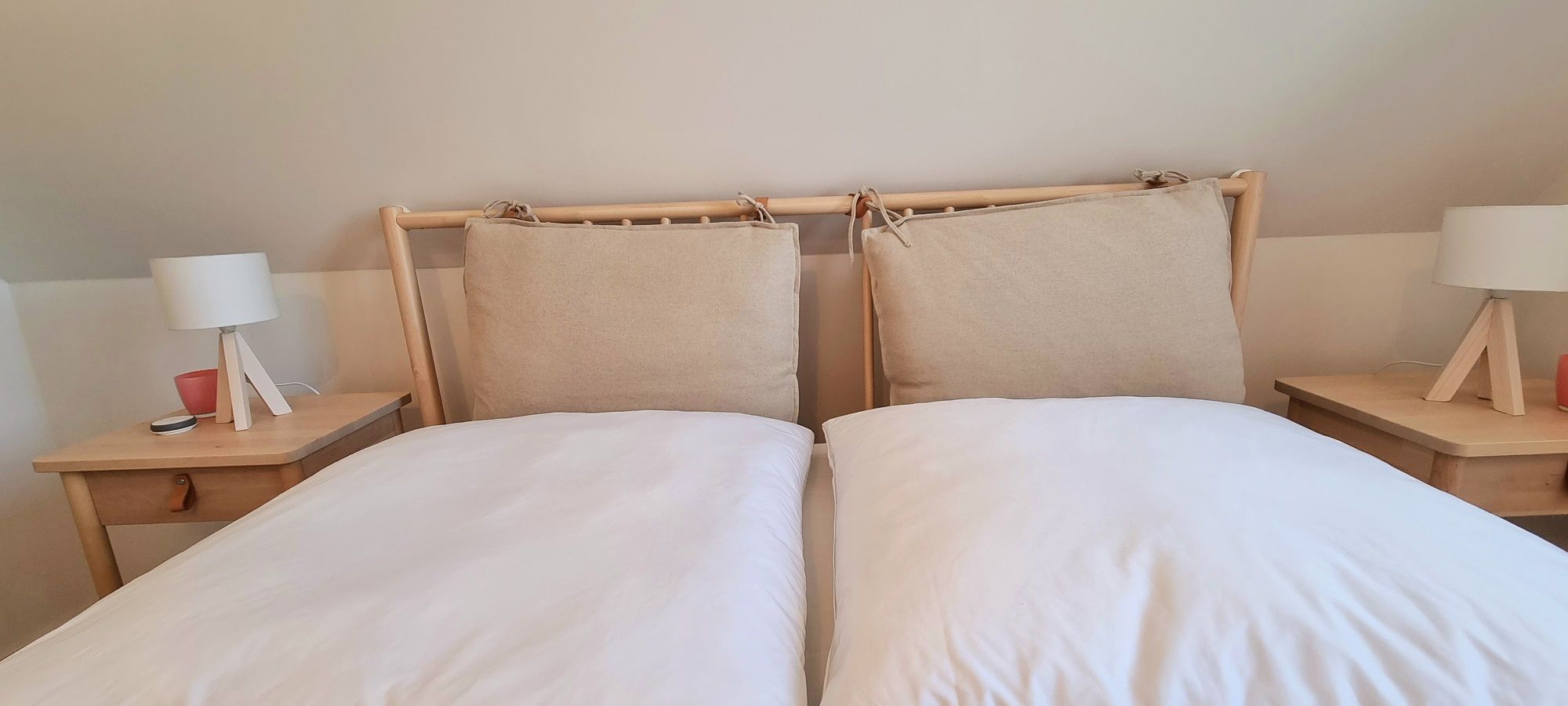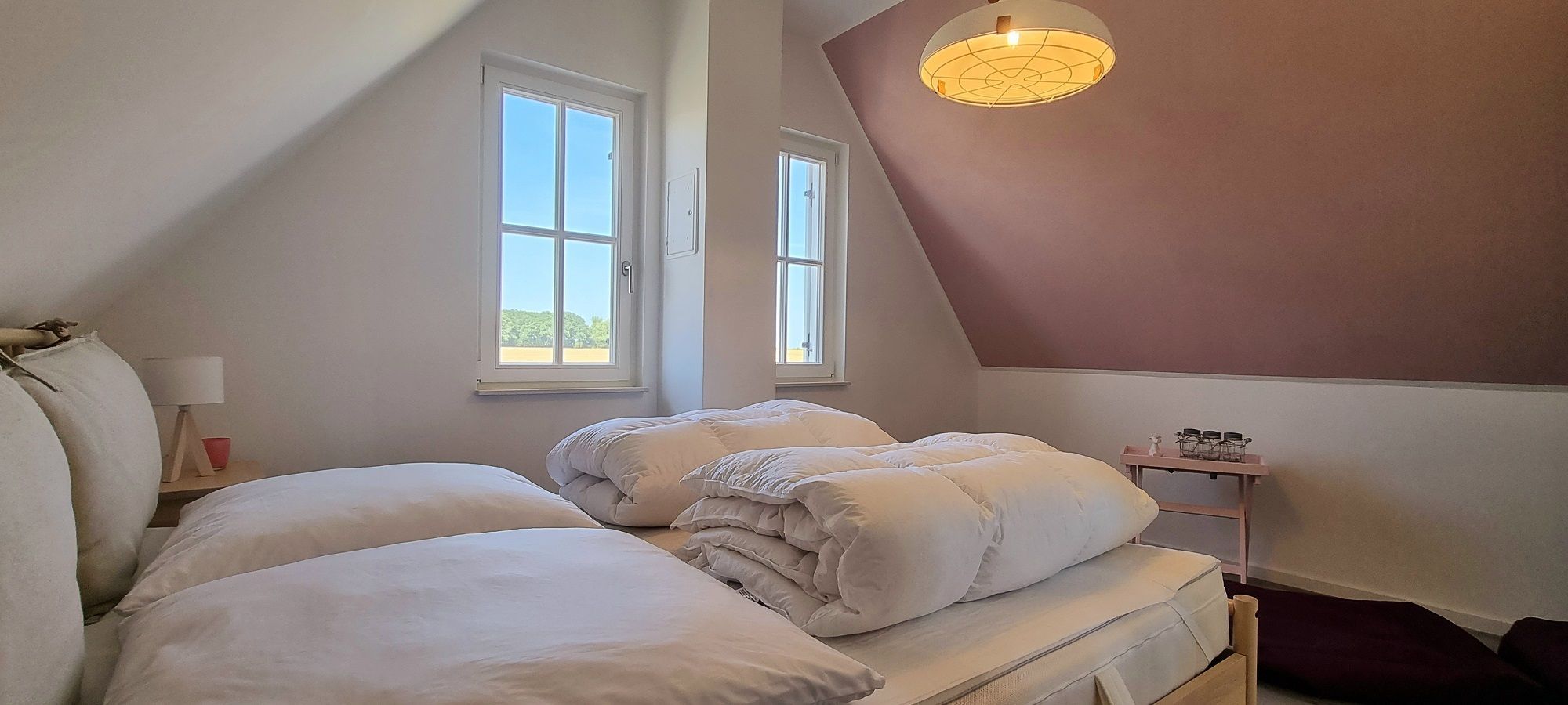 Im Erdgeschoss empfängt Sie die offen und hell gestaltete Wohnküche mit einer Küchenzeile, dem Essbereich und einer gemütlichen Sofaecke mit Kaminofen. Hier kann man gemeinsam den Tag beginnen und den Abend genießen. Im Wohnzimmer befinden sich 2 Türen, die Sie in den Garten mit Blick auf das freie Feld vor Ihnen einladen. Auf der Terrasse sitzen Sie unter einem Glasdach so sitzen Sie immer perfekt geschützt. Egal ob Sonne, Regen oder Wind. Zusätzlich finden Sie einen extra gepflasterten Bereich für „Sonnenanbeter“ und einen unter Bambus aufgestellten, hochwertigen Strandkorb. Ebenfalls im Erdgeschoß befindet sich eine kleine Sauna mit begehbarer Rainshower-Dusche. Im Herbst und Winter bietet Ihnen die Sauna eine wundervolle Möglichkeit zur Regeneration von Körper, Geist und Seele. Zusätzlich gibt es hier noch ein separates Gäste-WC und einen kleinen Hauswirtschaftsraum mit Waschtrockner, kl. Bügelbrett, Bügeleisen, kl. Wäscheständer und Staubsauger. Alle Fenster sind mit Außen Fensterläden, Fliegengittern und Plissees versehen. Die hübsche Holztreppe hinauf geht es zu den beiden Schlafzimmern und einem großzügigen Badezimmer mit Fledermausgabe, Wlan-Radio, einer weiteren Dusche und einer zusätzlichen Badewanne. Hier finden Sie ein Schlafzimmer mit einem Doppelbett (160m x 200m) und ein weiteres Zimmer mit zwei getrennten Betten (90 x 200) - eines davon ist zusätzlich ausziehbar. Sie haben ein Baby oder Kleinkind? Auch ein Kinderreisebett (kostenfrei) und Hochstuhl stehen Ihnen bei uns zur Verfügung. Alle Steckdosen haben zusätzlich eine Kindersicherung und an den Betten jeweils 2 USB-Ports.