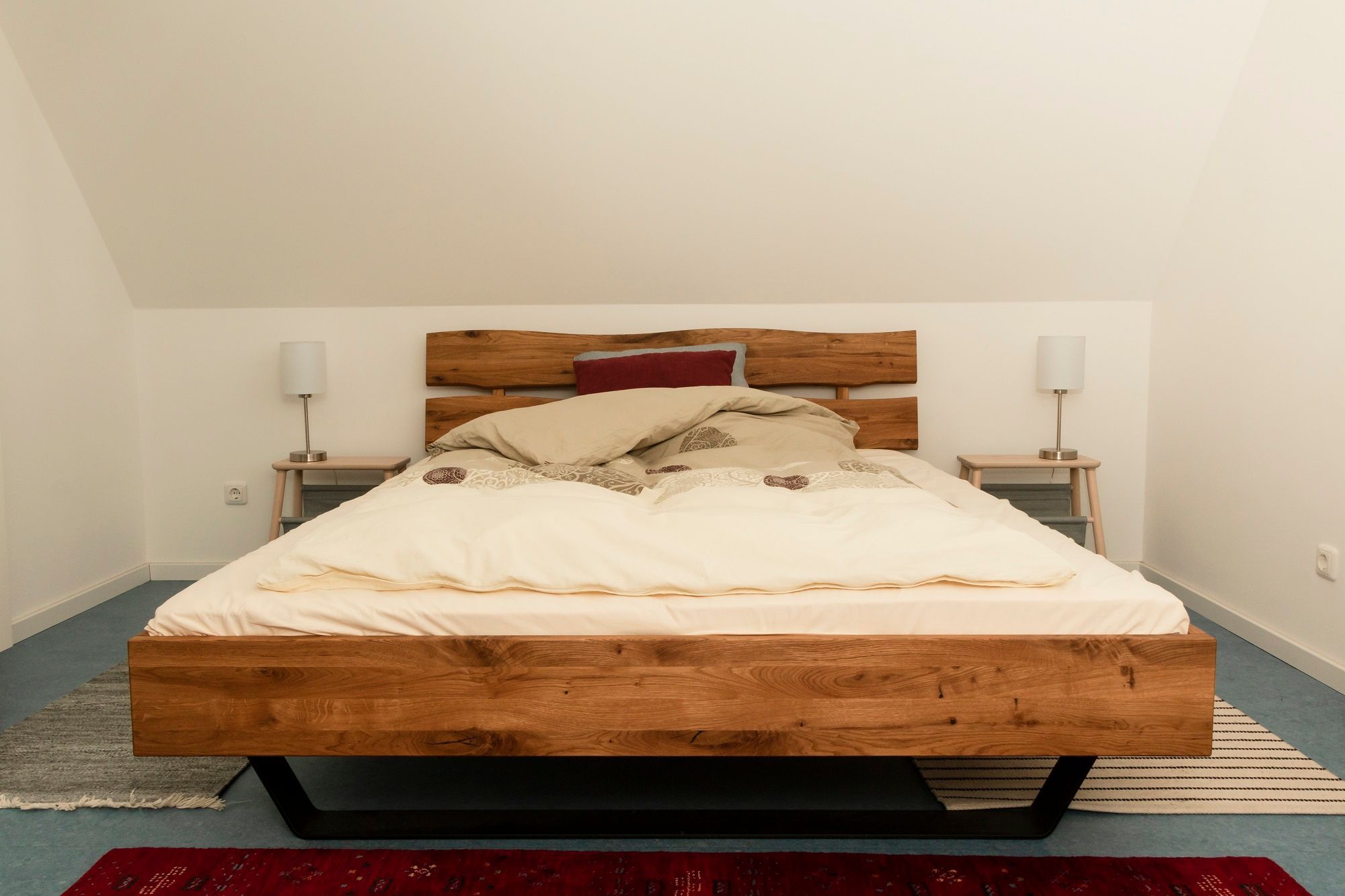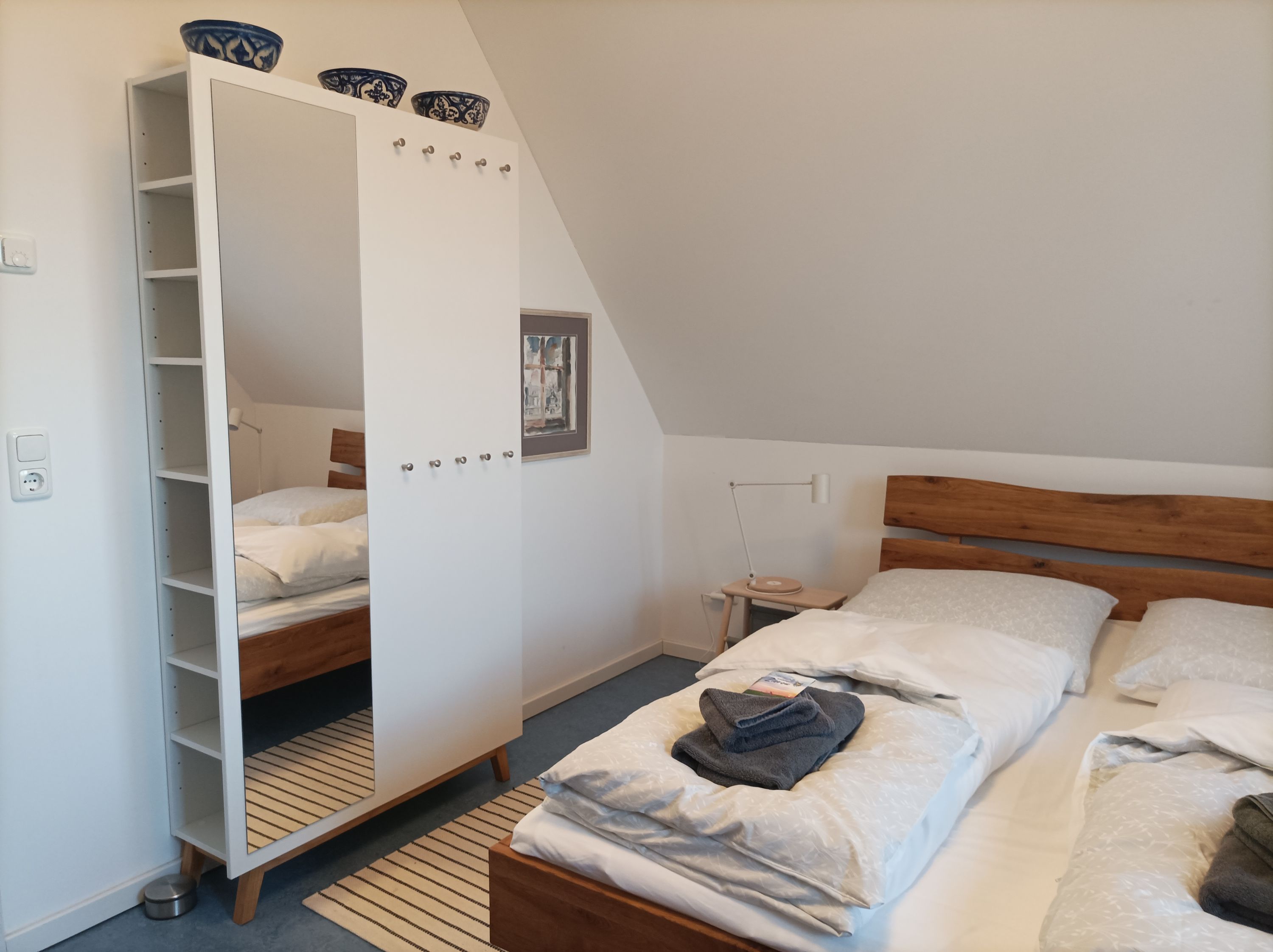 Im Obergeschoss findest du zwei Schlafzimmer: Im rechten Schlafzimmer steht ein französisches Ehebett und im linken drei Einzelbetten, die du flexibel ganz nach deinen Bedürfnissen auch zu einem Doppelbett zusammenstellen kannst. Bis zu fünf Personen genießen hier dank Insektengittern ungestörte Nächte. Falls ihr noch ein zusätzliches Kinderreisebett benötigt, sagt einfach Bescheid.