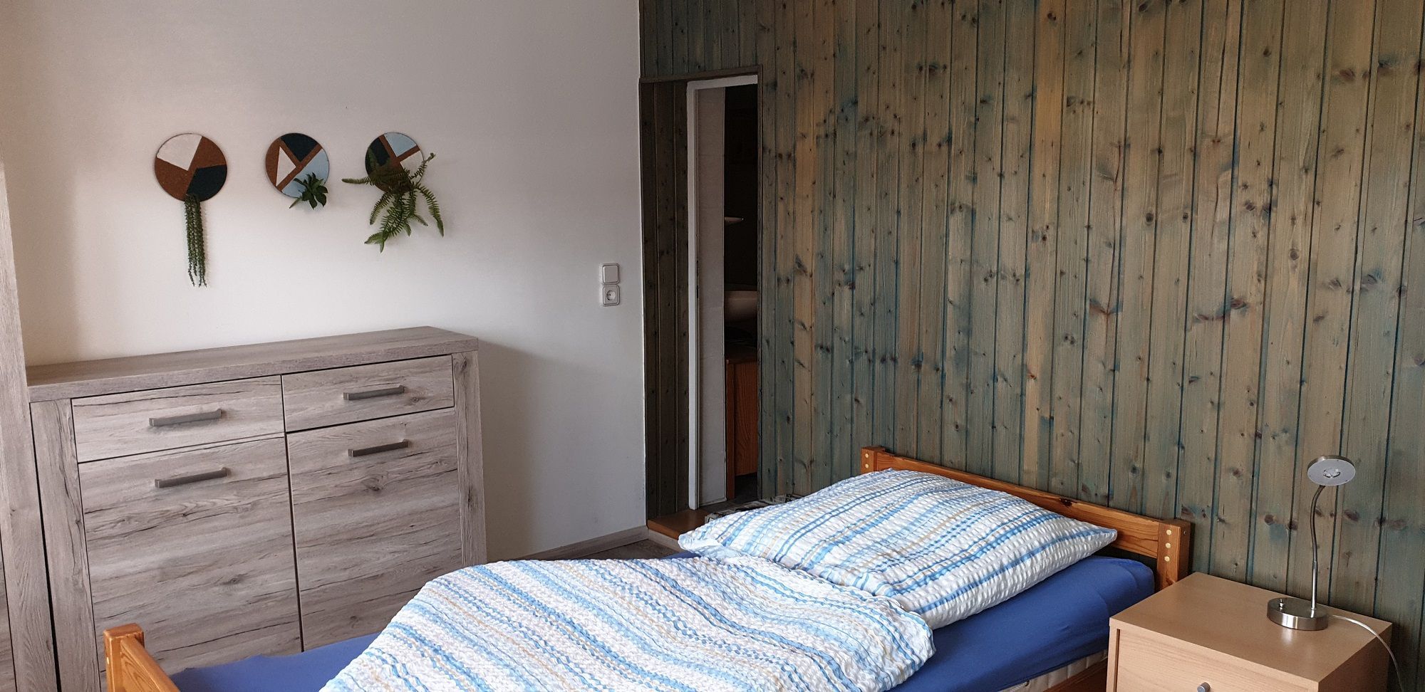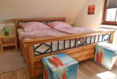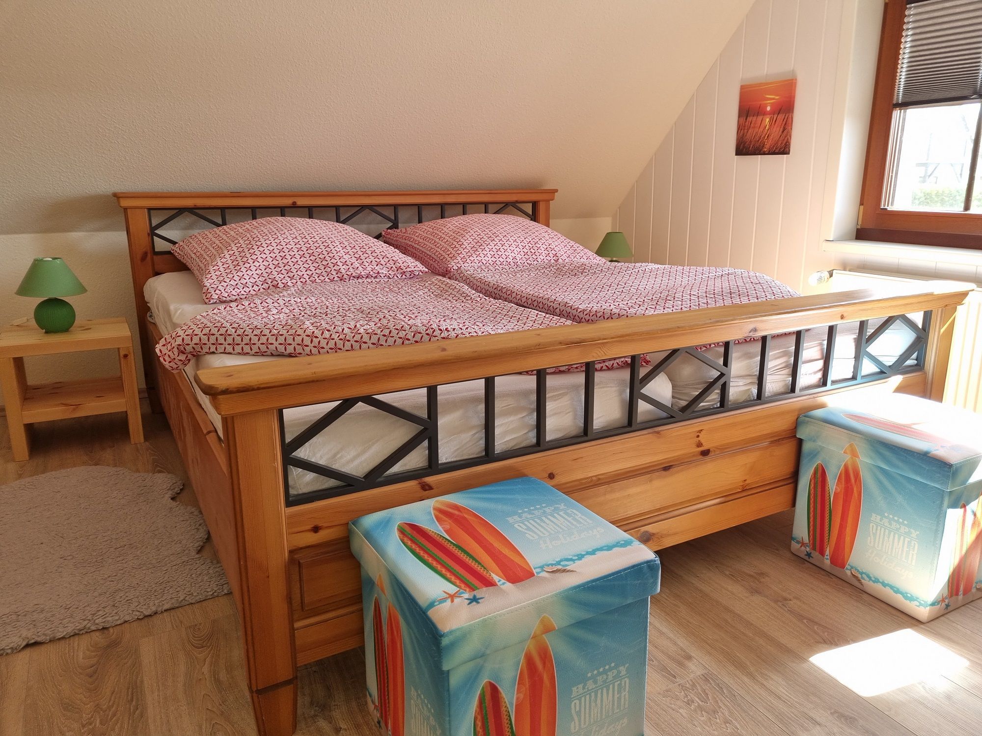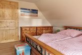 Das 2. Schlafzimmer im Obergeschoss ist ebenfalls mit einem Doppelbett und einem zusätzlichen Einzelbett eingerichtet.