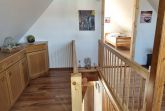 Über eine schmale Treppe geht es in den offenen Wohnbereich mit Sofa und TV ausgestattet.
