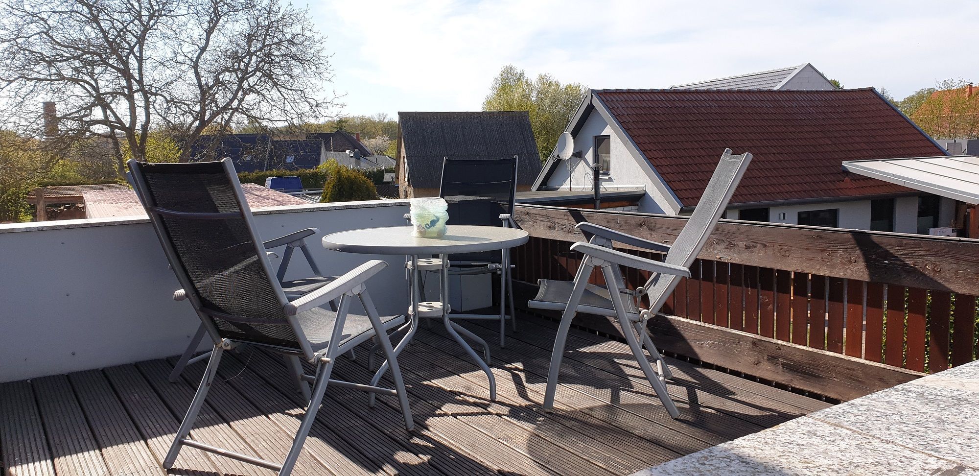 Die Dachterrasse ist vom Wohnbereich aus zugänglich und führt runter in den kleinen Hofgarten. Dort haben Sie ein sonniges Plätzchen zum Grillen.