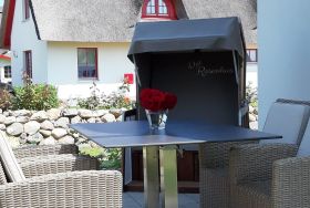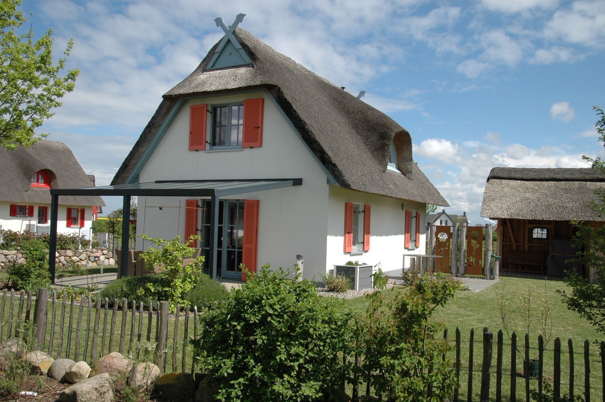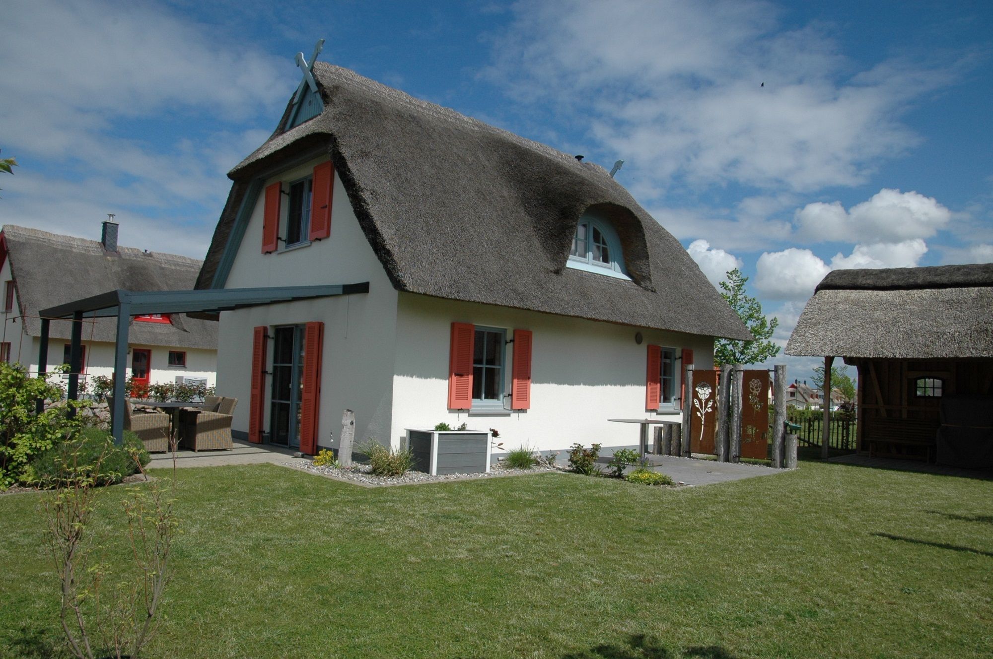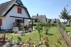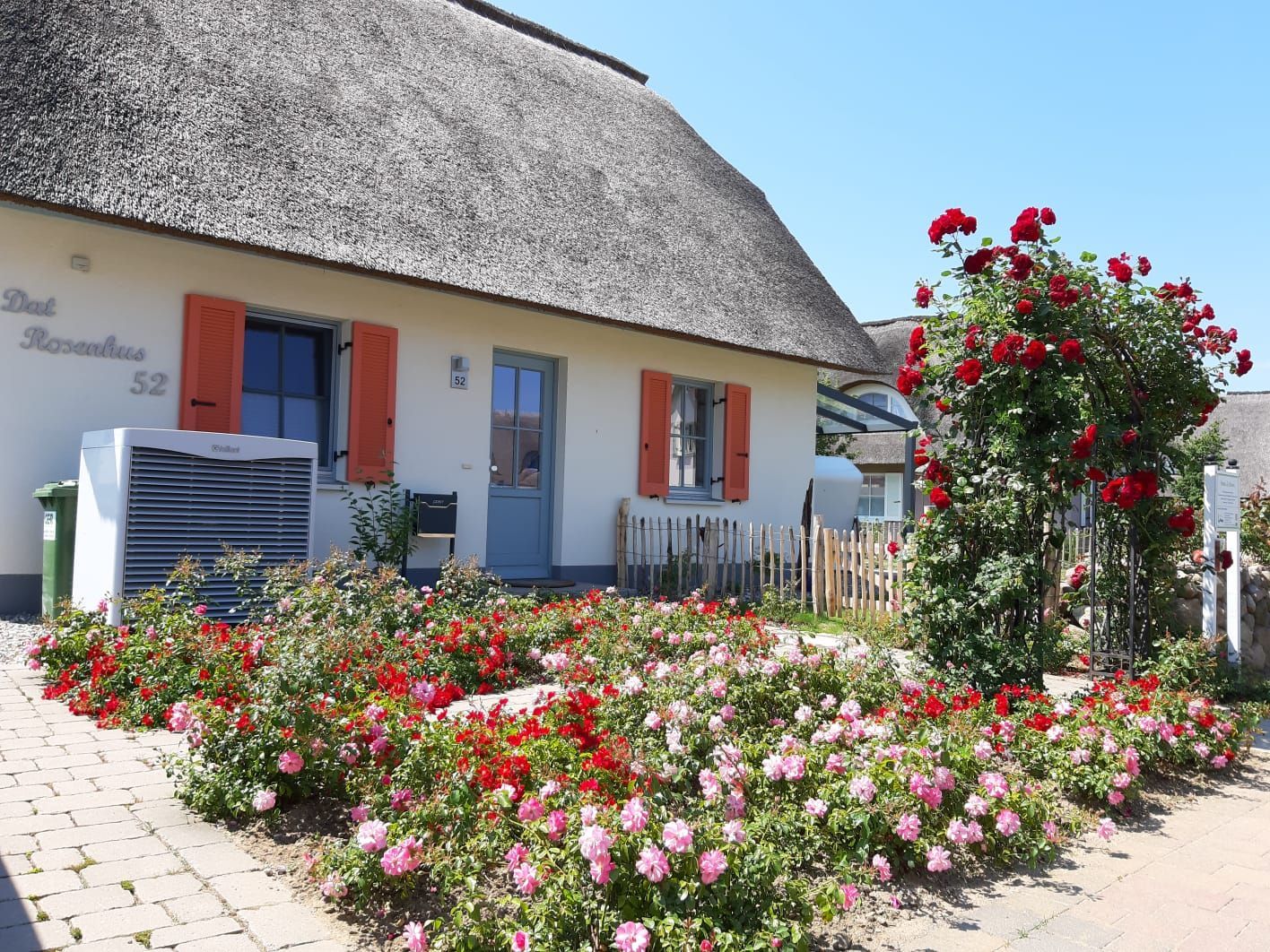 Das Reethaus befindet sich direkt am Spielplatz des Reethausgebietes und ist umzäunt und mit einem Friesenwall mit Rosen bewachsen eingefriedet.