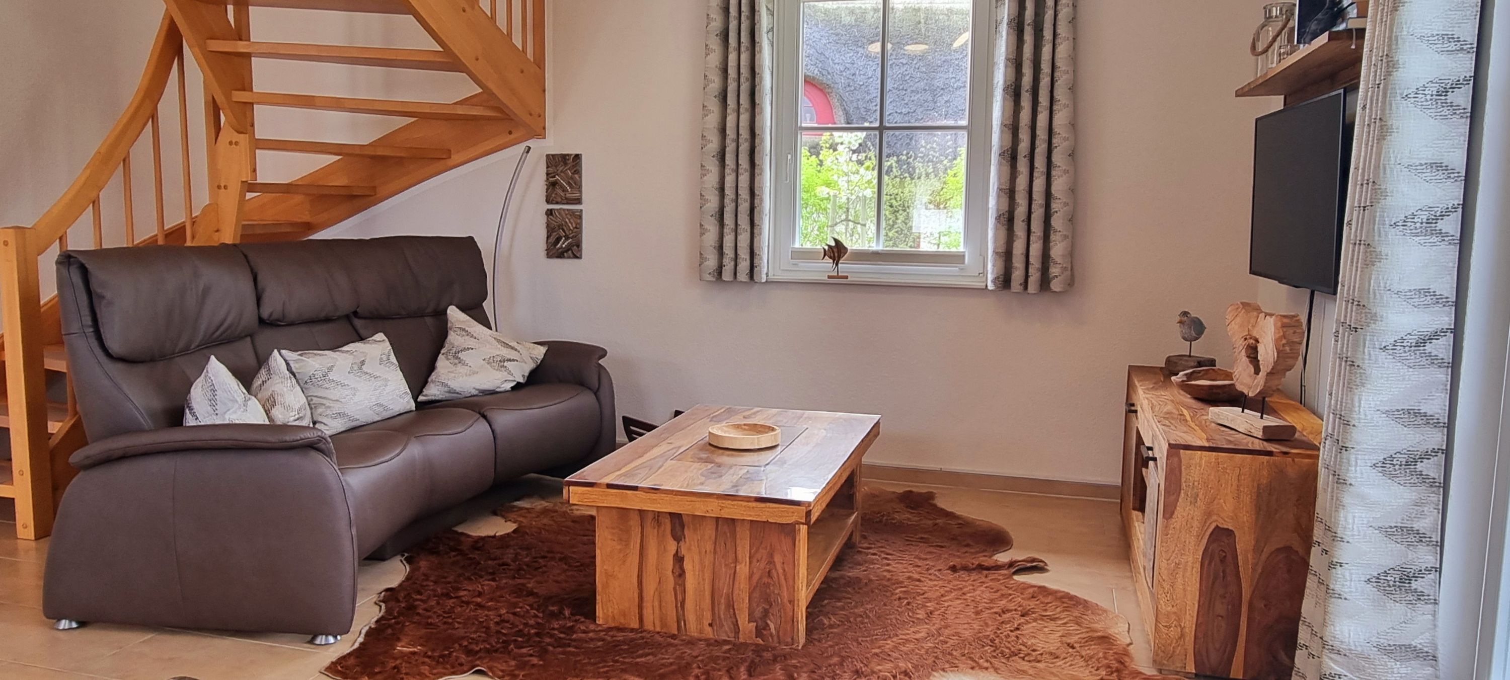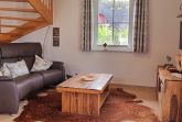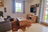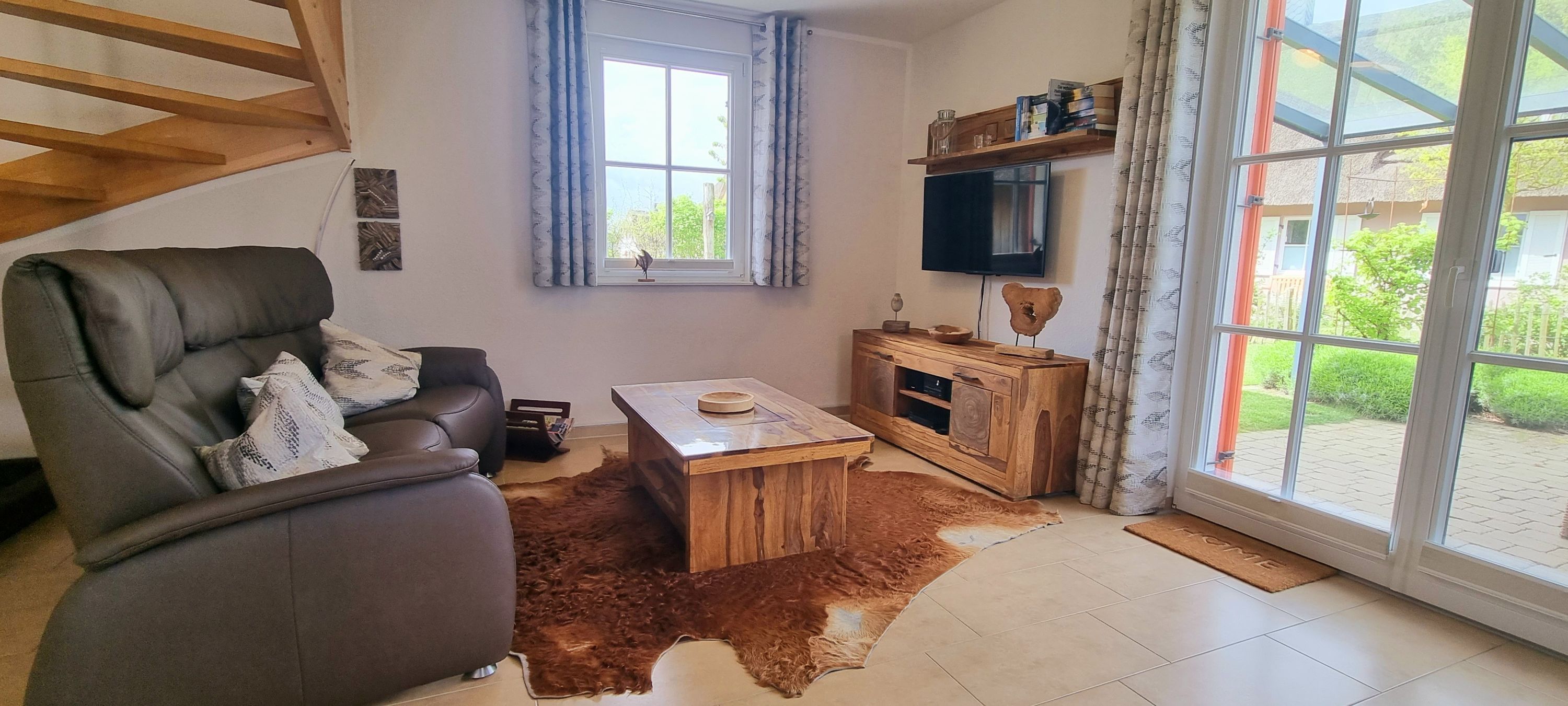Das Wohnzimmer mit Zugang zur Terrasse ist zusätzlich mit einer wohnlichen Essecke und einem gemütlichen Sofa eingerichtet.