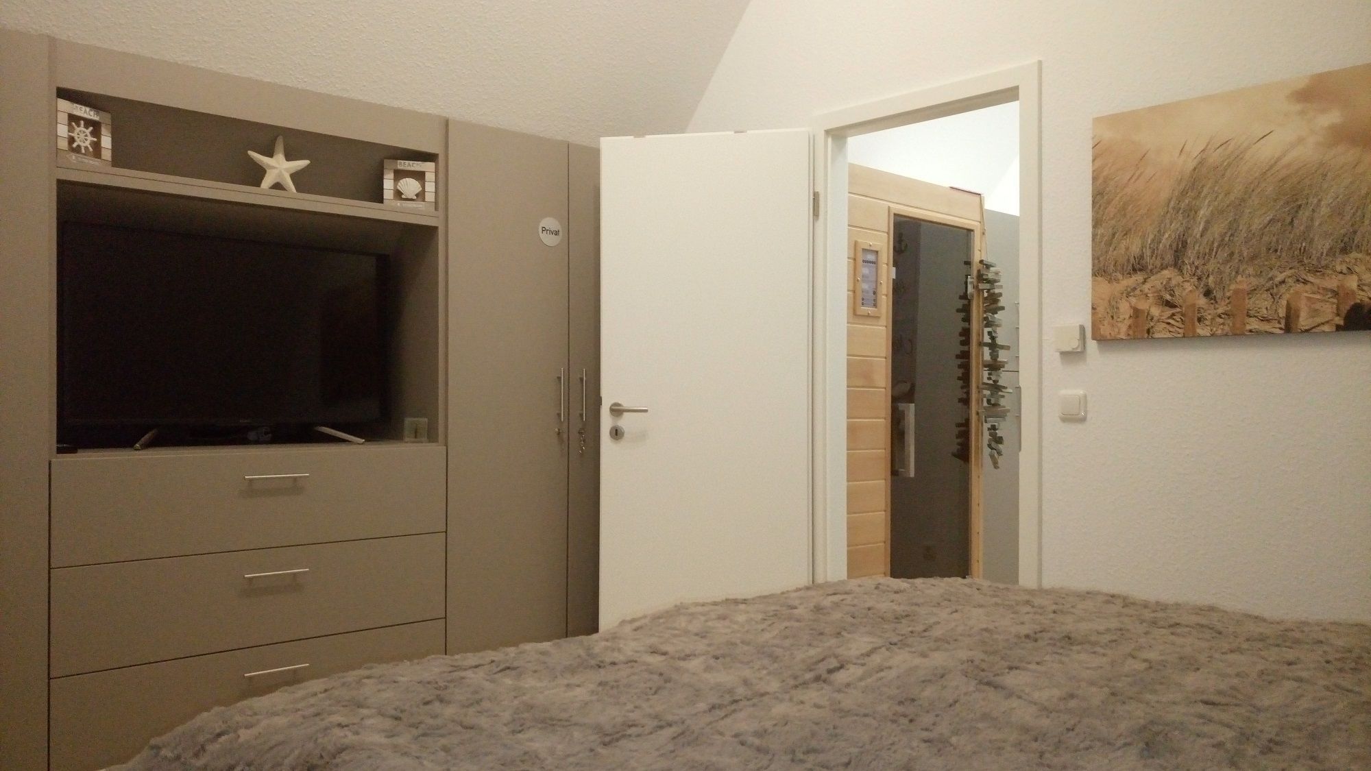 Das im Obergeschoss liegende Schlafzimmer ist mit einem Doppelbett, modernem Wandschrank und TV ausgestattet.