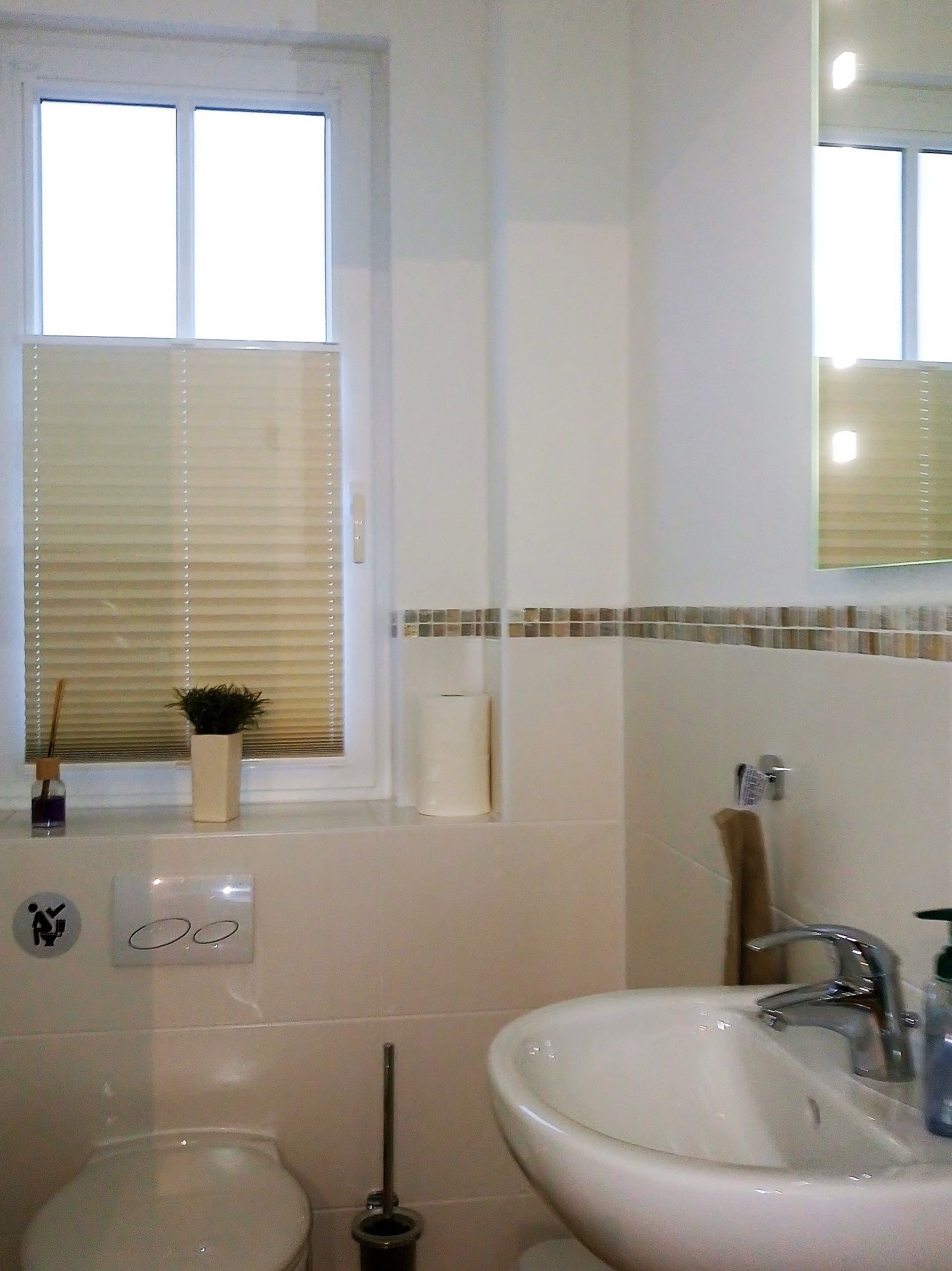 Zur Abdunklung und Schutz sind Plissees, Fliegengitter und Fensterläden angebracht. Ein gut erzogener Hund ist im Erdgeschoss zugelassen.