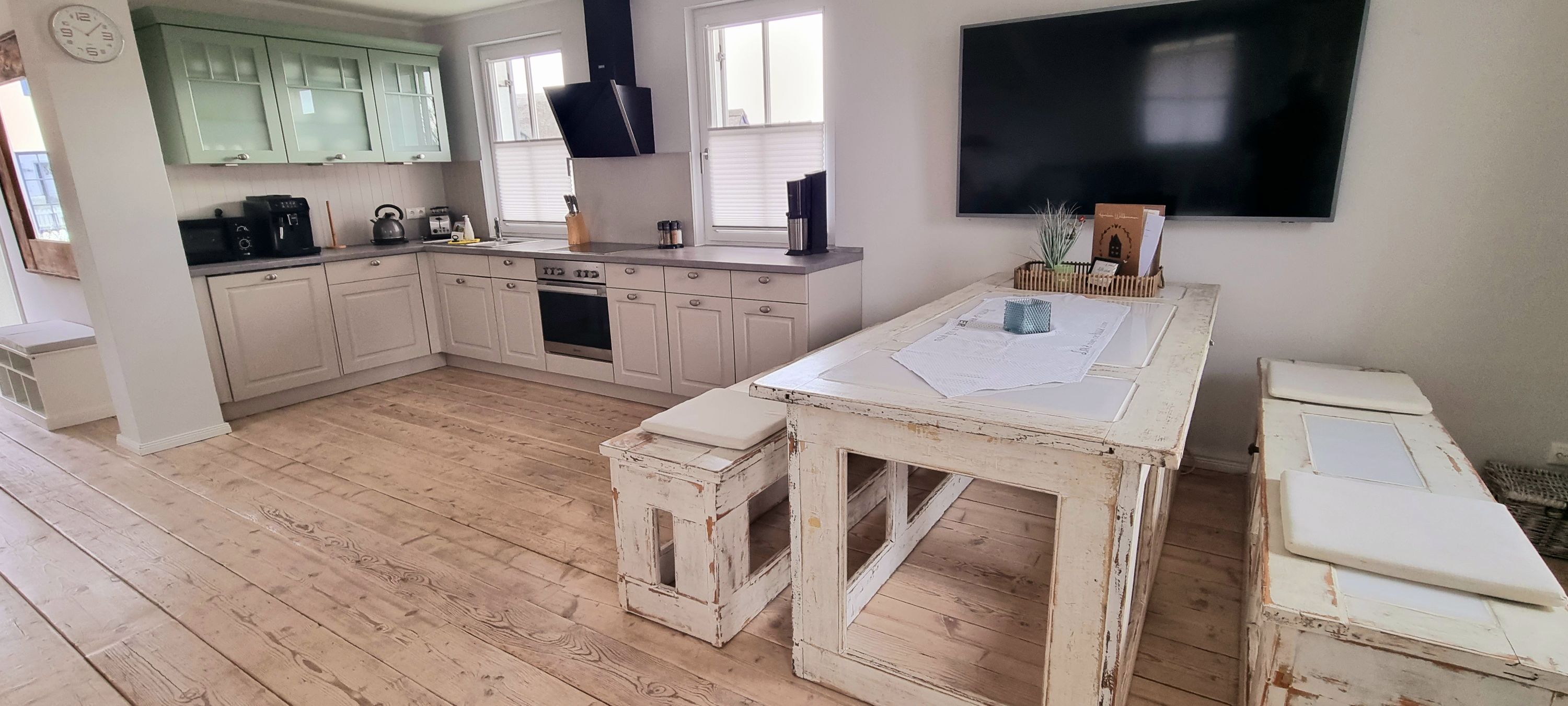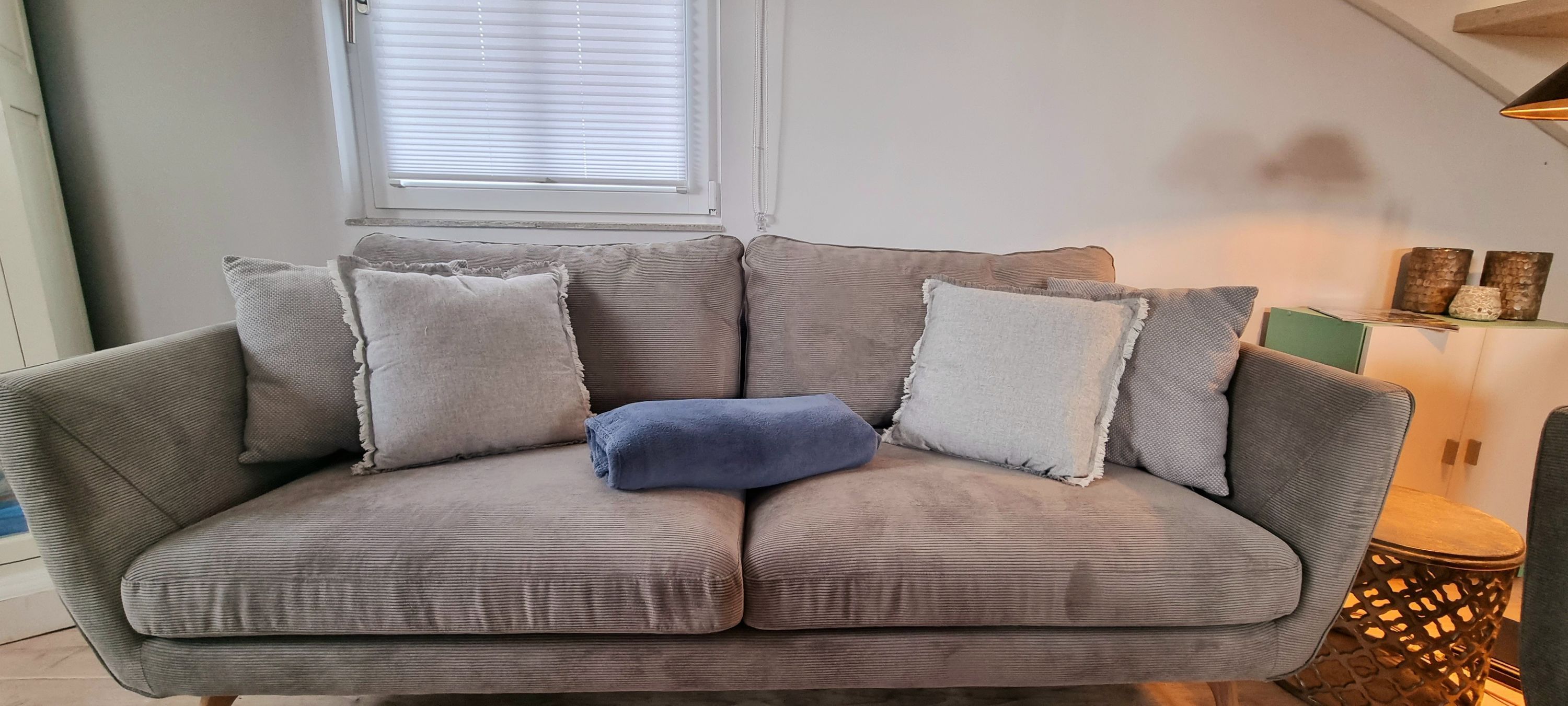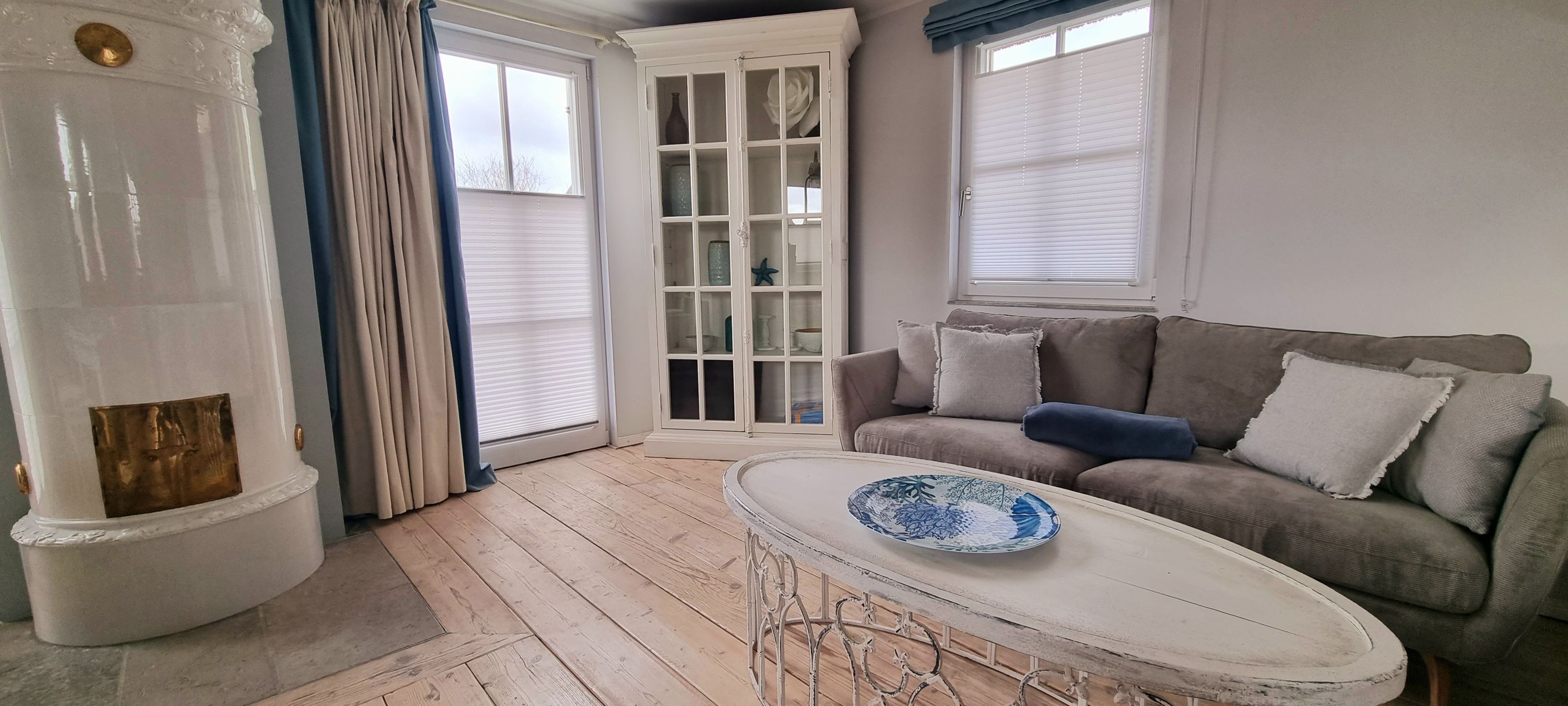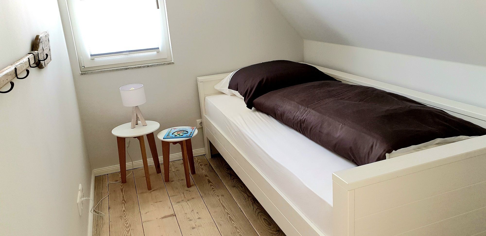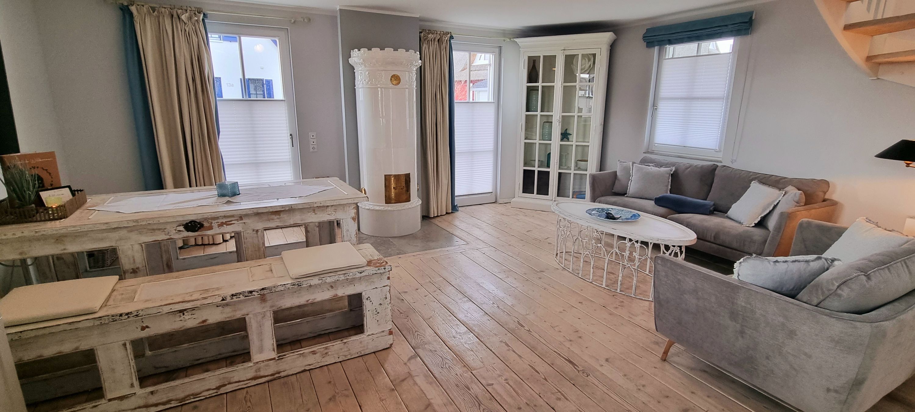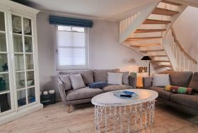 Im oberen Bereich stehen Ihnen ein Schlafzimmer mit einem Boxspringbett und zwei weitere Schlafzimmer mit je einem Einzelbett zur Verfügung. In allen Schlafzimmern ist ein TV vorhanden. Das Vollbad mit Echtglasduschabtrennung, Waschbecken und WC ist in der typischen Fledermausgaube des Reethauses eingerichtet. Im gesamten Haus ist eine Fußbodenheizung verlegt. Zum Sichtschutz sind Pliesses, Vorhänge und Fensterklappläden angebracht. Ein Waschmaschine und Trockner und diverse Putzutensilien sowie Bügelbrett und Bügeleisen sind im HWR verstaut.