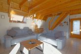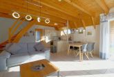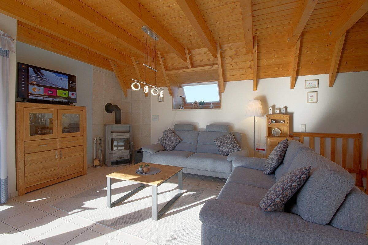 Im gefliesten Wohnbereich gibt es einen offenen Bereich mit Kaminofen, Smart TV und PS4, sowie einen Essbereich, in dem 6 Personen ausreichend Platz finden.