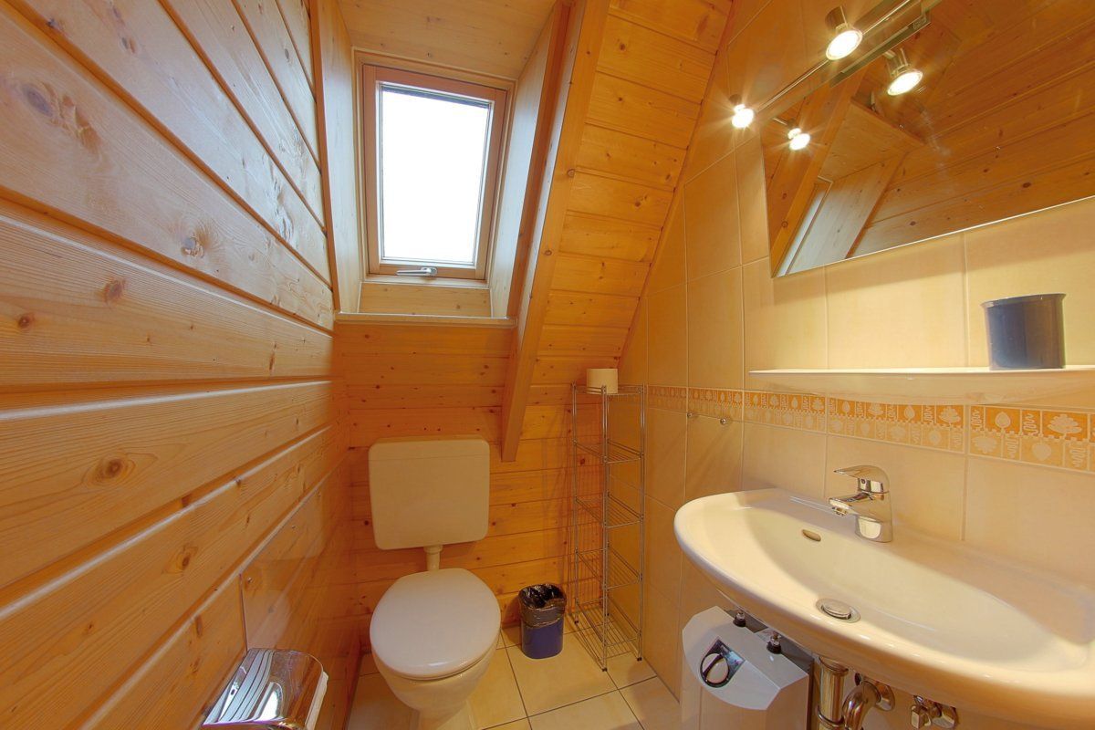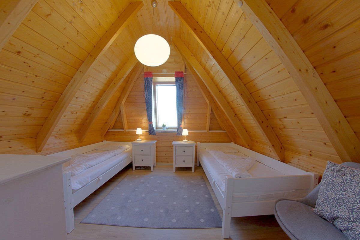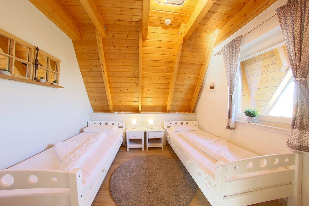 Im Obergeschoss befinden sich zwei weitere Schlafzimmer mit wischbaren Böden und ein WC mit Waschbecken. Ein Schlafzimmer mit Doppelbett und Gitterbett für ein Kleinkind und ein weiteres Schlafzimmer mit 2 Einzelbetten. Alle Schlafräume können verdunkelt werden.