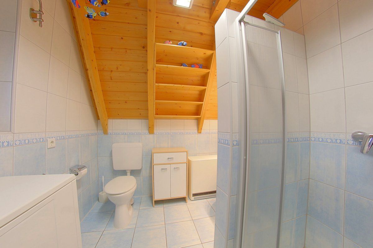 Im Erdgeschoß gibt es ein Schlafzimmer mit zwei Einzelbetten und wischbaren Bodenbelag und ein modernes, helles Duschbad mit Waschmaschine.
