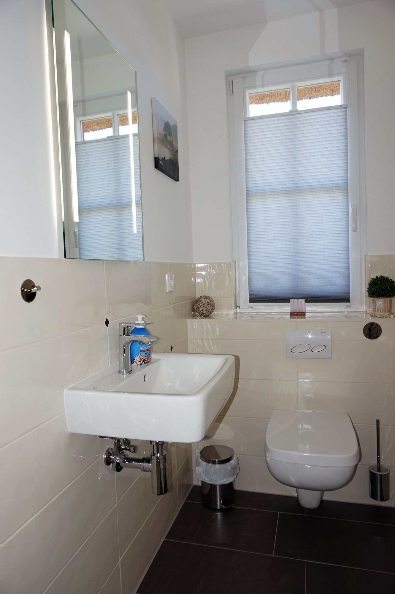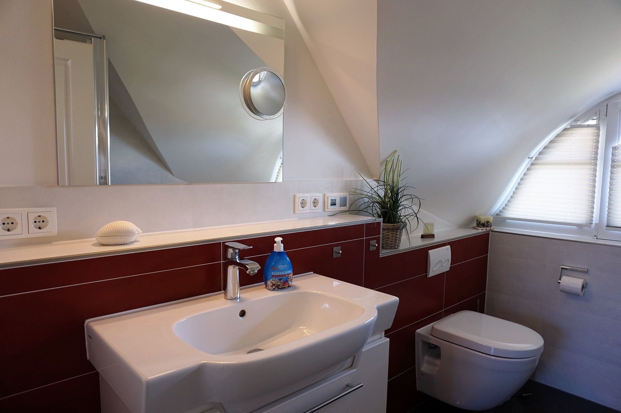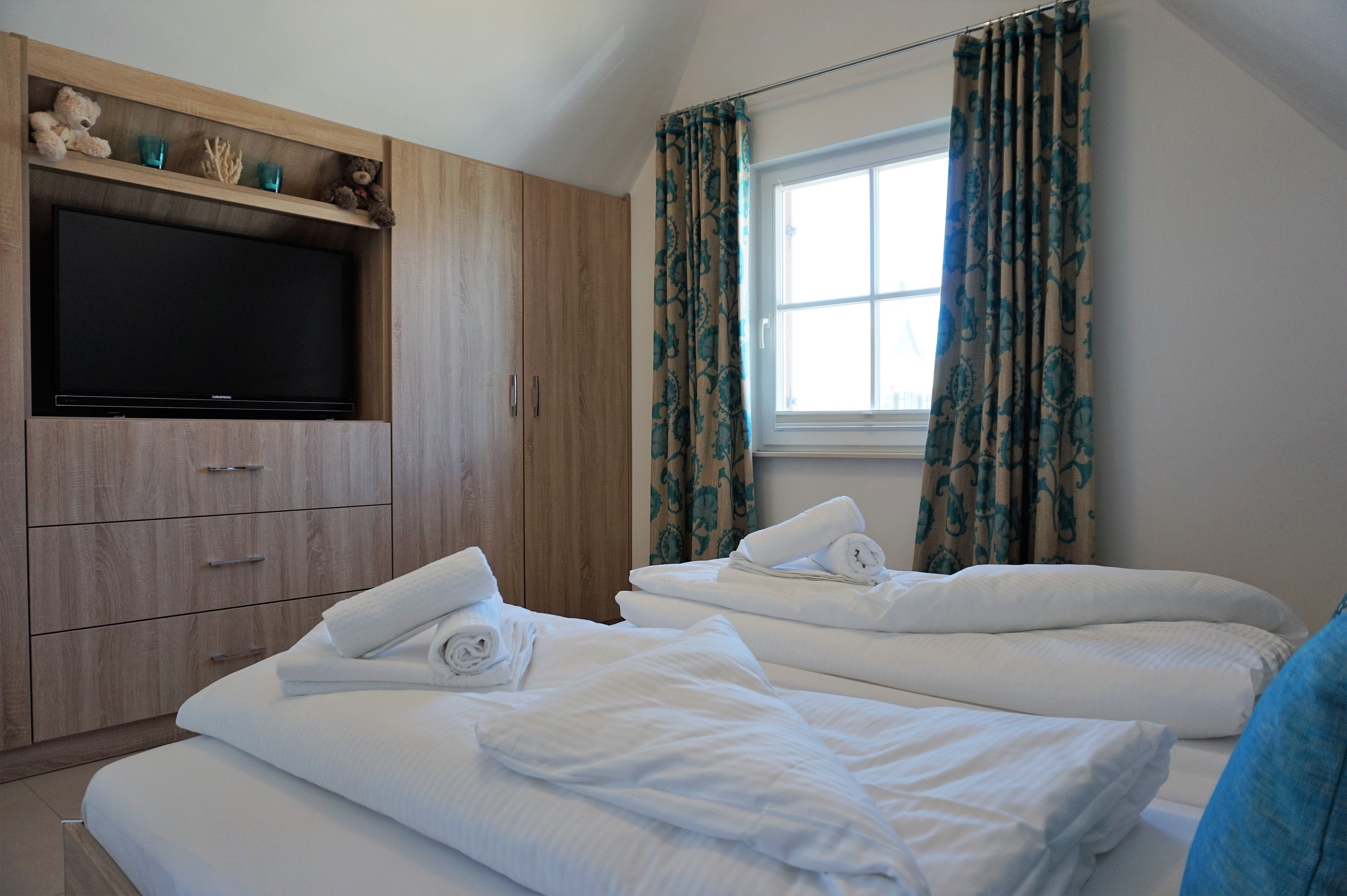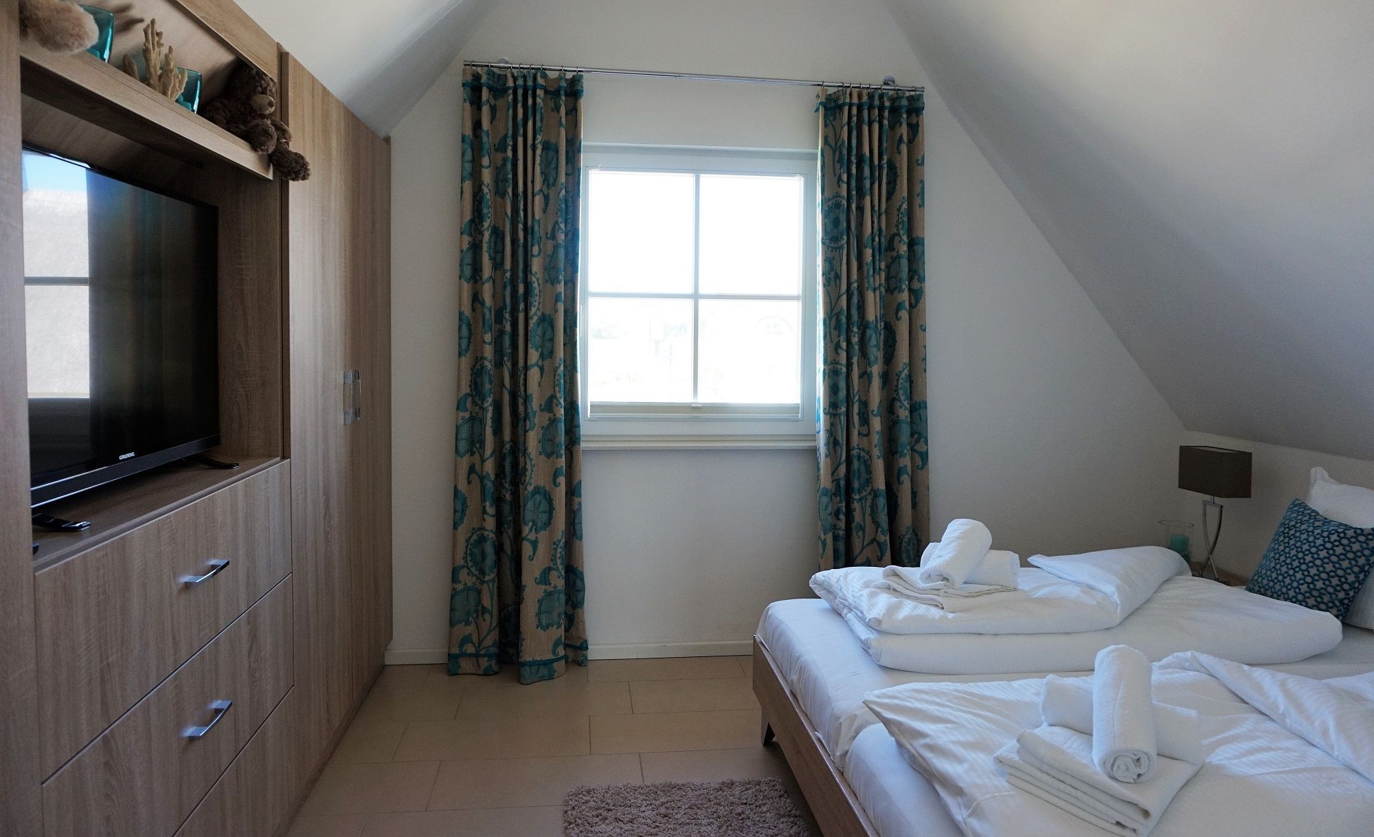 Für den Hund steht ein Lederkorb und Hundenäpfe unter der Treppe. Bitte lassen Sie den Vierbeiner im Erdgeschoss! Ein Gäste-WC mit Tageslicht befindet sich zudem im Erdgeschoss. Zwei separate Schlafzimmer sowie ein hochwertiges Vollbad sind im Obergeschoss vorhanden. Im Elternschlafzimmer befinden sich ein großer eingebauter Kleiderschrank mit 2. TV und Doppelbett. Von hier aus haben Sie einen wunderbaren Blick auf die Ostsee. Im Kinderschlafzimmer sind drei Einzelbetten nutzbar. Ein Kinderreisebett steht bereit. Ihr Urlaub kann direkt beginnen - die Bettwäsche ist bei Anreise bereits bezogen und Handtücher liegen bereit. Im Haus sind Fliegenschutzgitter und Gardinen bzw. Pliesses als Sichtschutz angebracht. Im Hauswirtschaftsraum stehen eine Wasch- Trocknerkombi und ein Bügelbrett/Bügeleisen sowie Putzutensilien bereit. Ein Safe für Ihre Wertsachen ist vorhanden. Vor dem Ferienhaus können Sie zwei PKW`s abstellen.