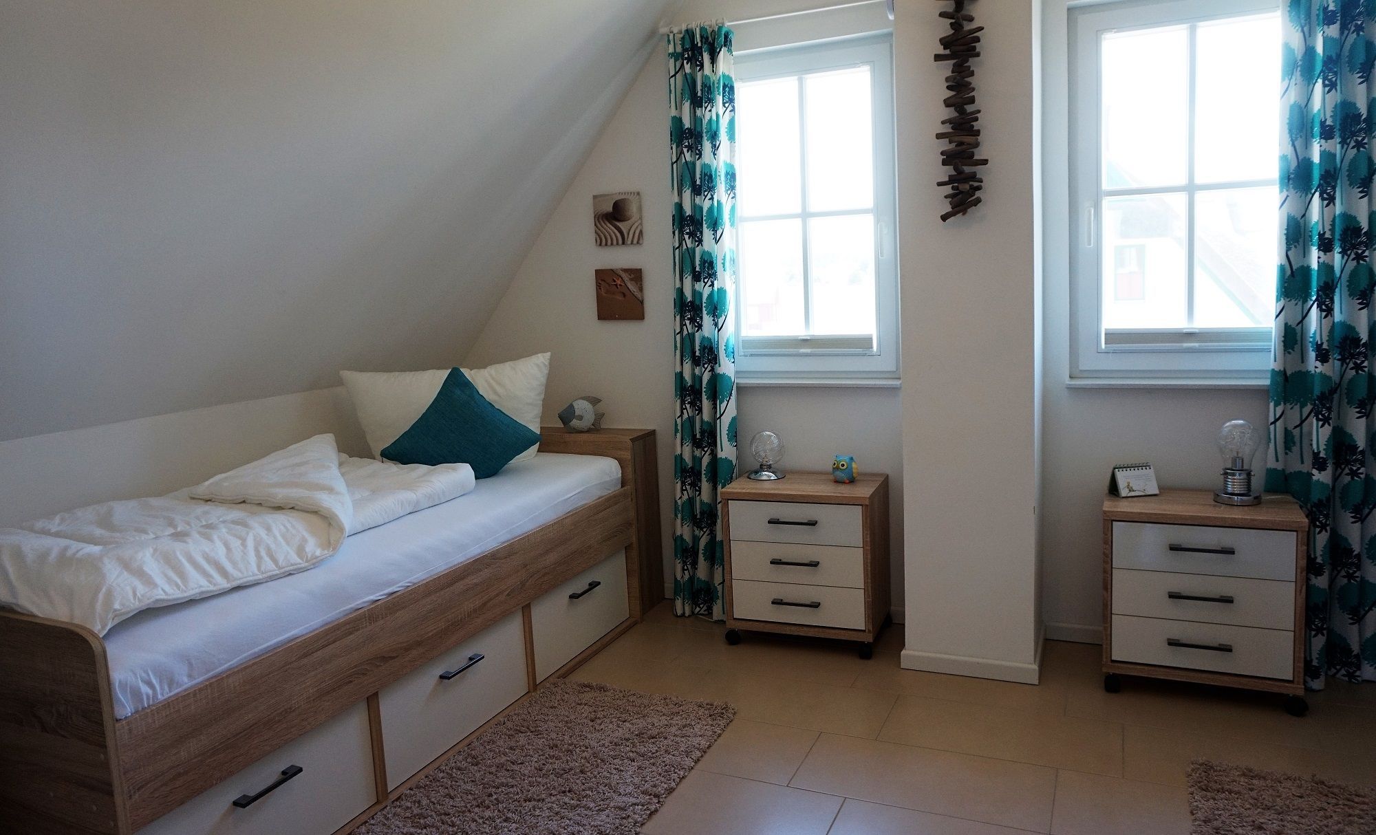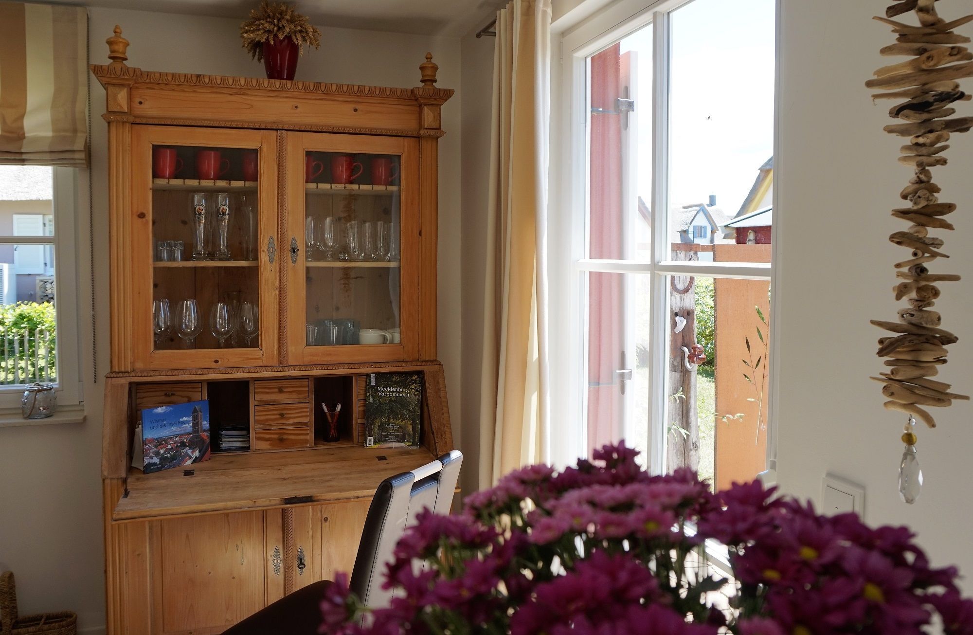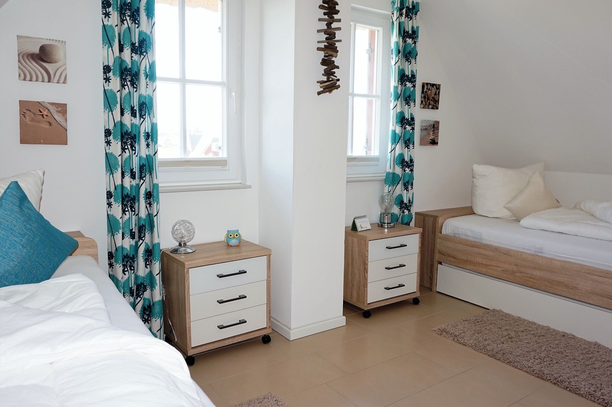Für den Hund steht ein Lederkorb und Hundenäpfe unter der Treppe. Bitte lassen Sie den Vierbeiner im Erdgeschoss! Ein Gäste-WC mit Tageslicht befindet sich zudem im Erdgeschoss. Zwei separate Schlafzimmer sowie ein hochwertiges Vollbad sind im Obergeschoss vorhanden. Im Elternschlafzimmer befinden sich ein großer eingebauter Kleiderschrank mit 2. TV und Doppelbett. Von hier aus haben Sie einen wunderbaren Blick auf die Ostsee. Im Kinderschlafzimmer sind drei Einzelbetten nutzbar. Ein Kinderreisebett steht bereit. Ihr Urlaub kann direkt beginnen - die Bettwäsche ist bei Anreise bereits bezogen und Handtücher liegen bereit. Im Haus sind Fliegenschutzgitter und Gardinen bzw. Pliesses als Sichtschutz angebracht. Im Hauswirtschaftsraum stehen eine Wasch- Trocknerkombi und ein Bügelbrett/Bügeleisen sowie Putzutensilien bereit. Ein Safe für Ihre Wertsachen ist vorhanden. Vor dem Ferienhaus können Sie zwei PKW`s abstellen.