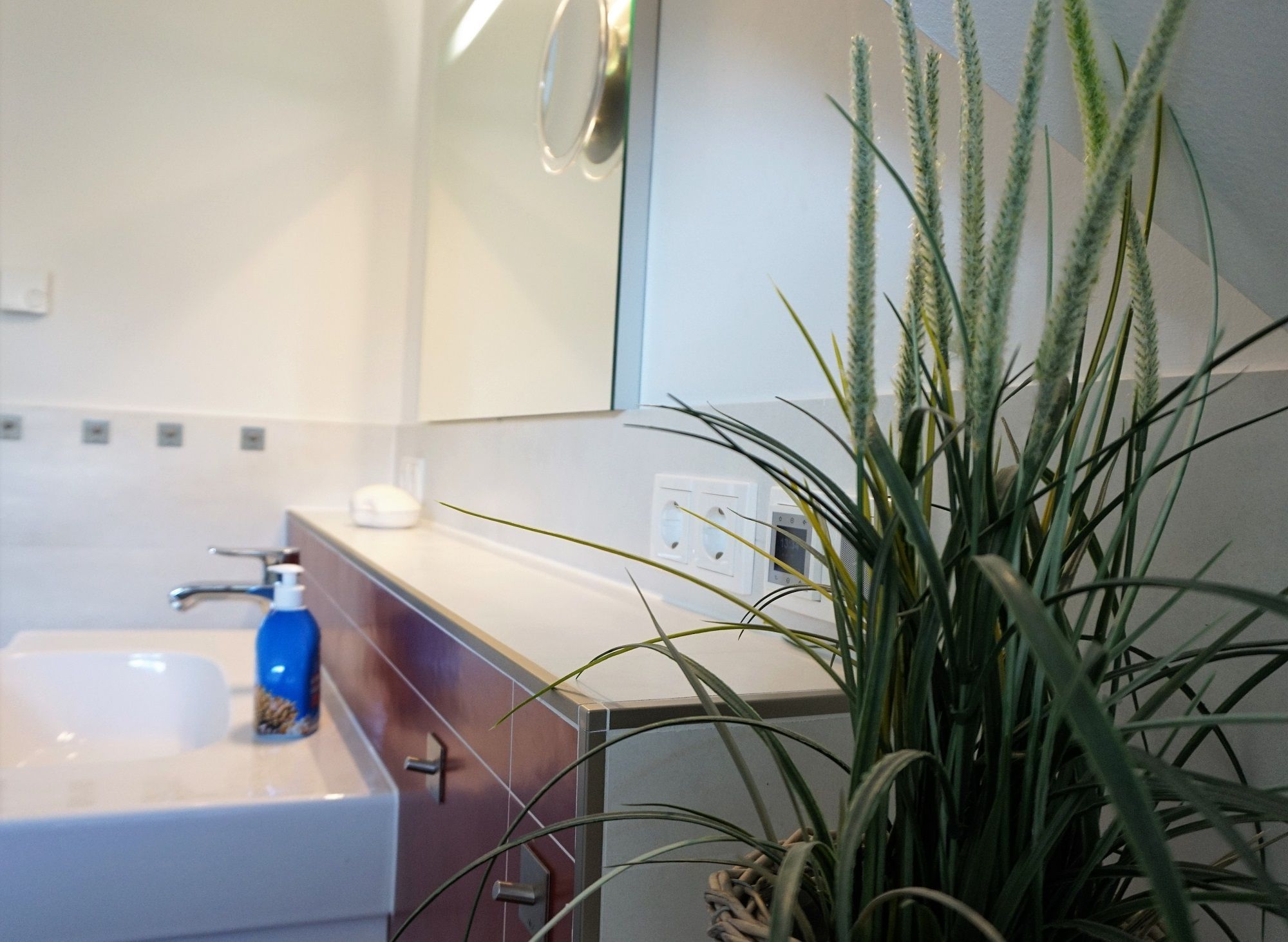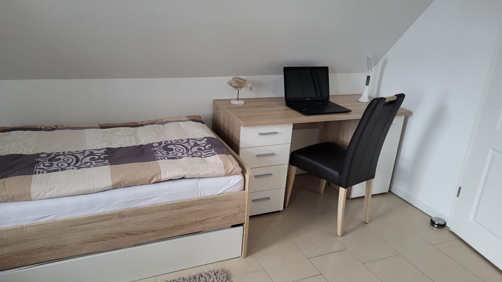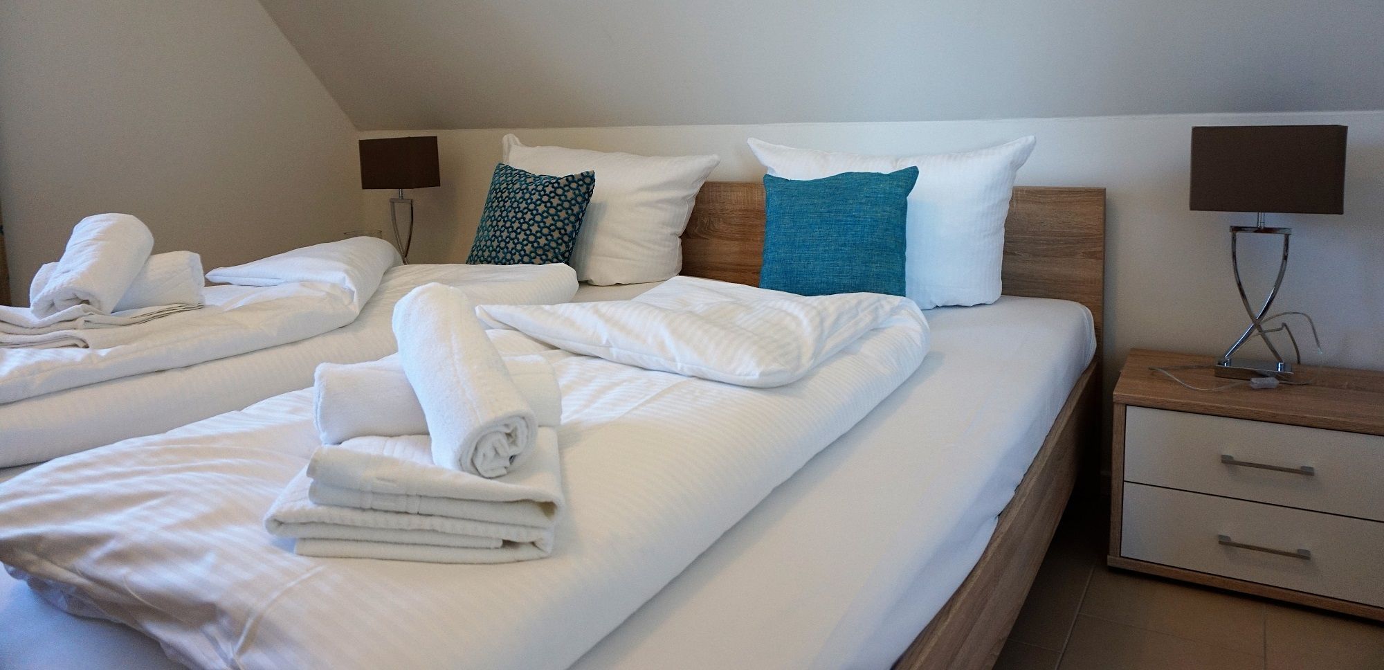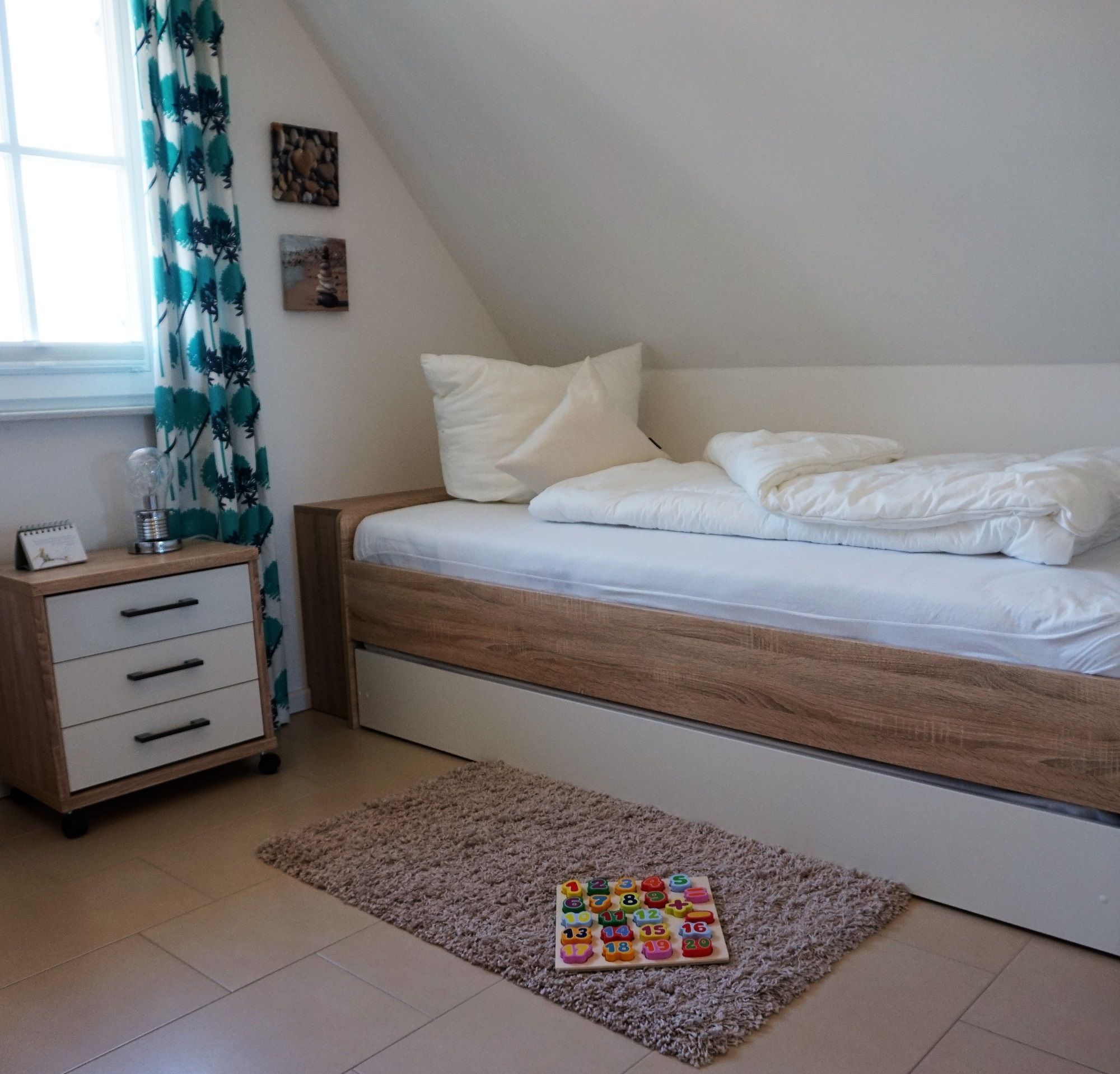 Für den Hund steht ein Lederkorb und Hundenäpfe unter der Treppe. Bitte lassen Sie den Vierbeiner im Erdgeschoss! Ein Gäste-WC mit Tageslicht befindet sich zudem im Erdgeschoss. Zwei separate Schlafzimmer sowie ein hochwertiges Vollbad sind im Obergeschoss vorhanden. Im Elternschlafzimmer befinden sich ein großer eingebauter Kleiderschrank mit 2. TV und Doppelbett. Von hier aus haben Sie einen wunderbaren Blick auf die Ostsee. Im Kinderschlafzimmer sind drei Einzelbetten nutzbar. Ein Kinderreisebett steht bereit. Ihr Urlaub kann direkt beginnen - die Bettwäsche ist bei Anreise bereits bezogen und Handtücher liegen bereit. Im Haus sind Fliegenschutzgitter und Gardinen bzw. Pliesses als Sichtschutz angebracht. Im Hauswirtschaftsraum stehen eine Wasch- Trocknerkombi und ein Bügelbrett/Bügeleisen sowie Putzutensilien bereit. Ein Safe für Ihre Wertsachen ist vorhanden. Vor dem Ferienhaus können Sie zwei PKW`s abstellen.