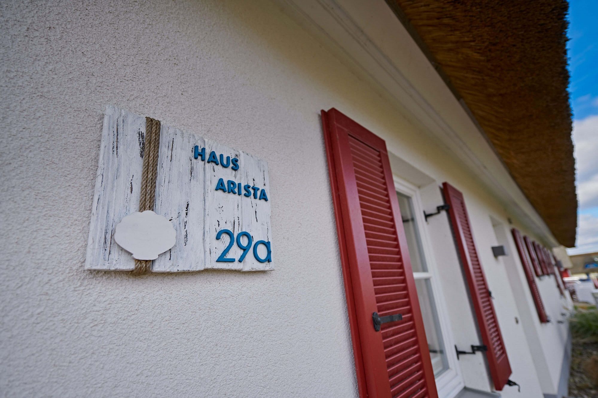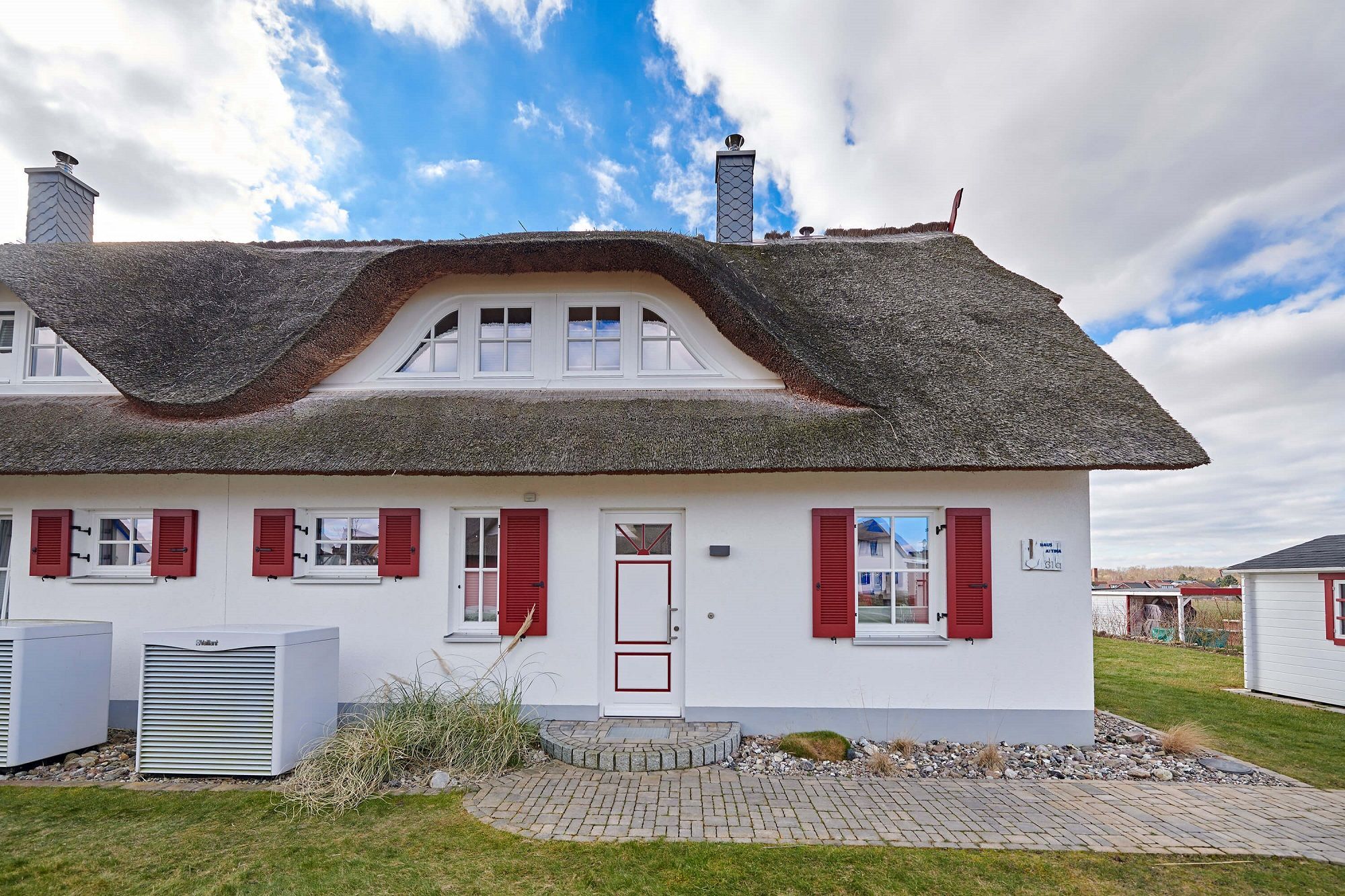 Das Duschbad mit Echtglasduschabtrennung, Waschbecken und WC ist in der typischen Fledermausgaube des Reethauses eingerichtet.