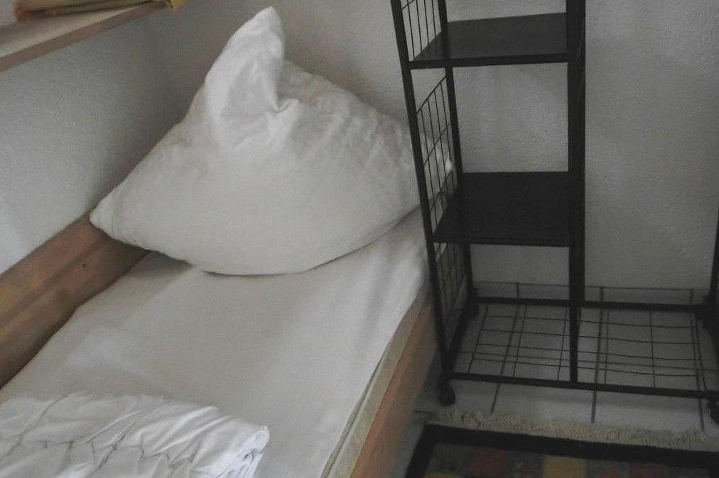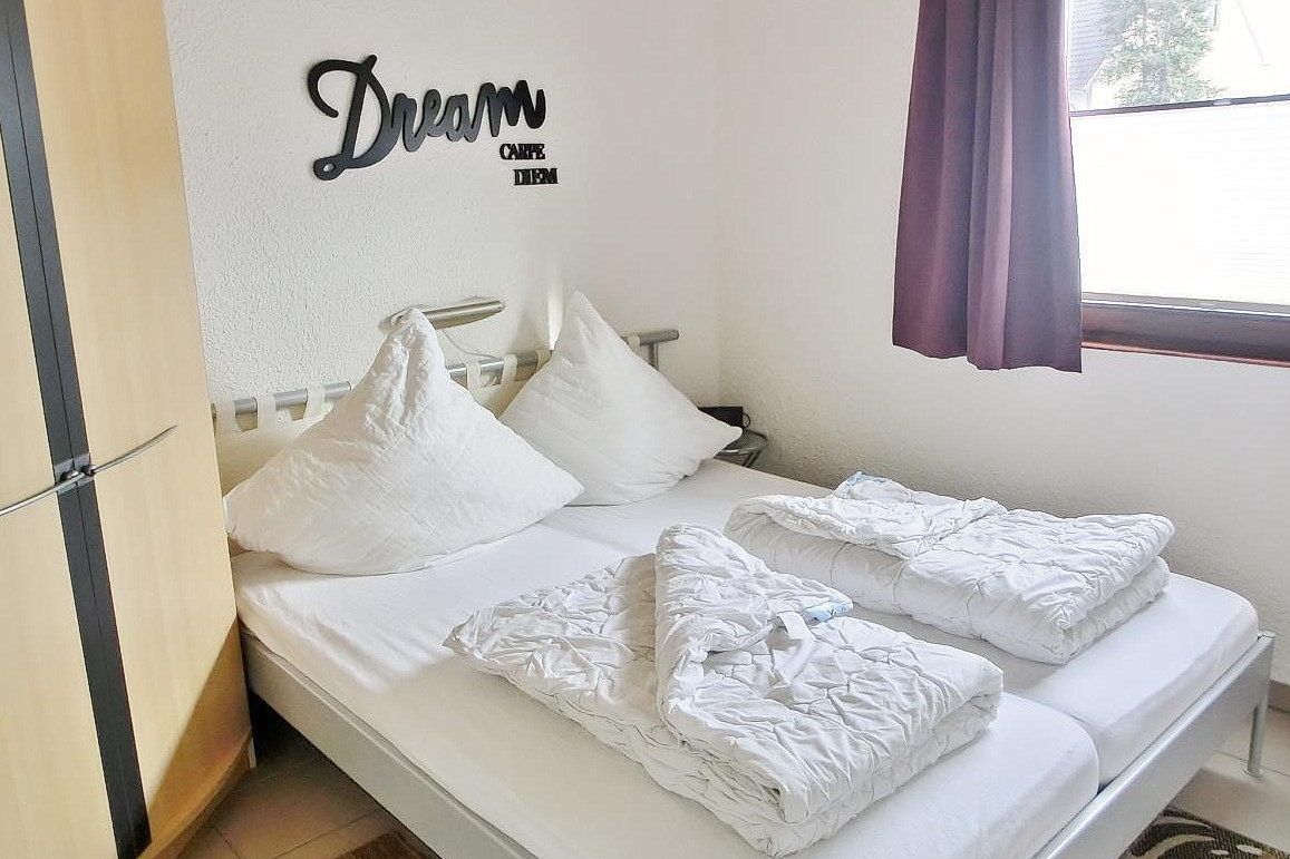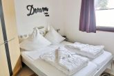 Schlafzimmer mit Doppelbett, Kleiderschrank.