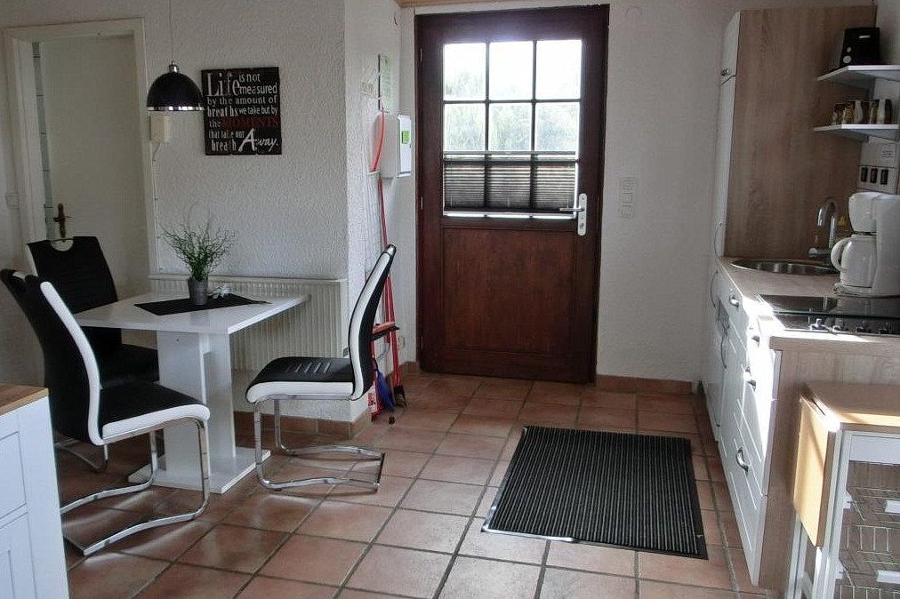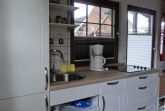 Moderne, komplett eingerichtete Küchenzeile mit Cerankochfeld, mobilen Backofen, Tiefkühlfach, kleine Spülmaschine, Mikrowelle.