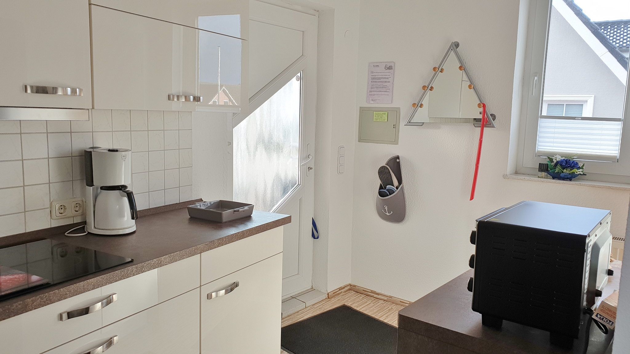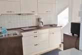 Moderne, komplett eingerichtete Küchenzeile mit E-Herd, Backofen, Kühlschrank, Tiefkühlfach, Mikrowelle, Wasserkocher, Kaffeemaschine und Toaster.