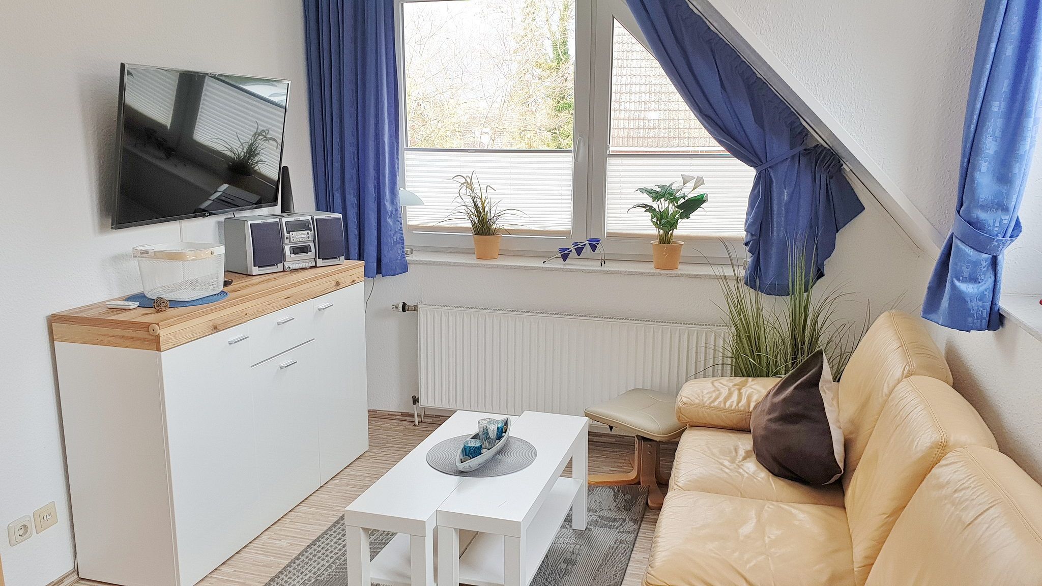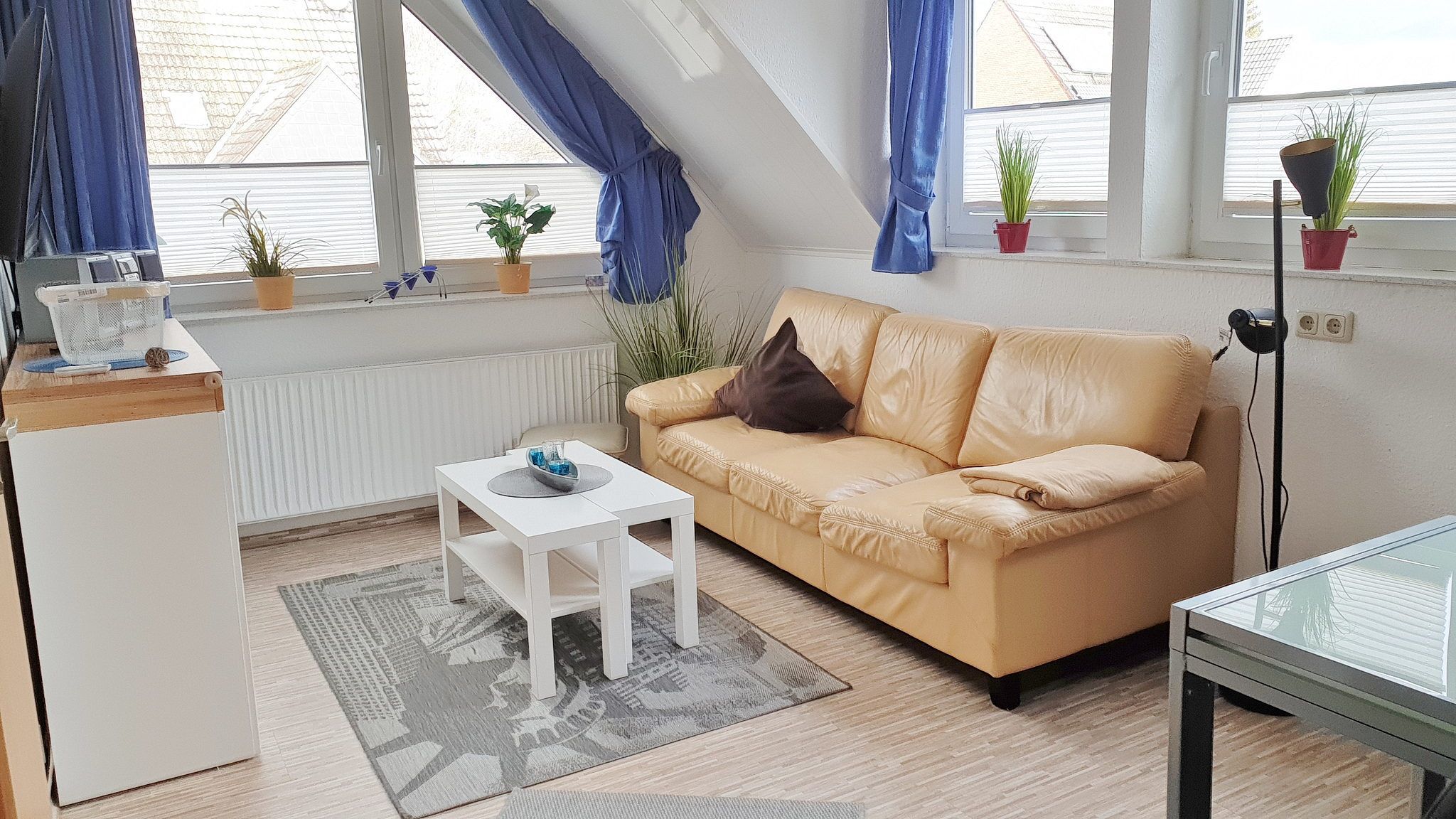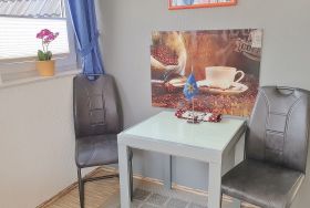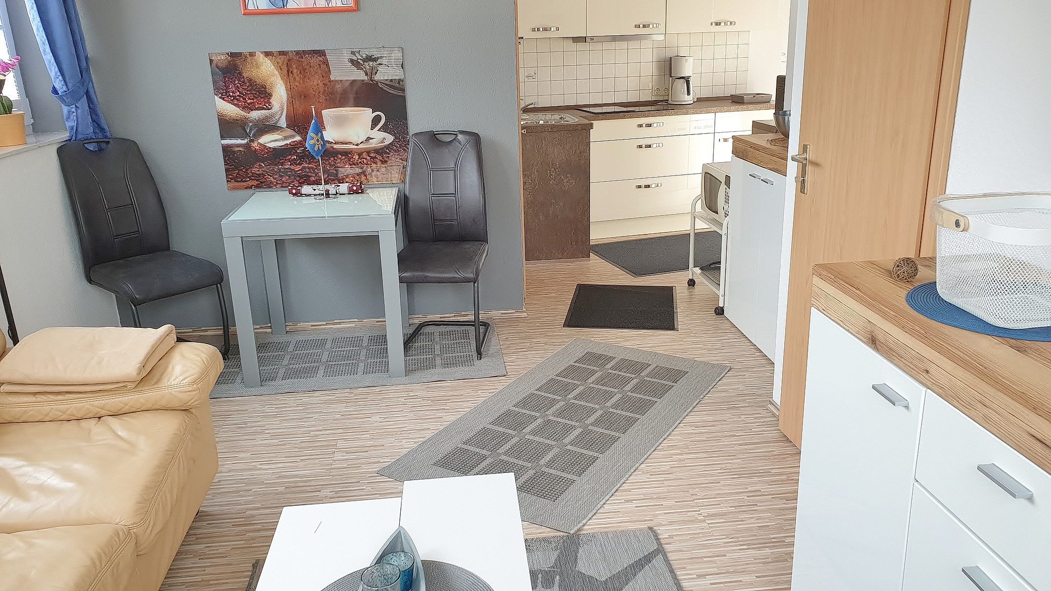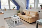 Helles modern eingerichtetes Wohnzimmer mit Ledercouch, Couchtisch, Laminatboden, Telefon. Zur Unterhaltung gibt es ein Radio, Sat-TV und eine kleine Stereoanlage. Weiterhin ist ein Essplatz mit Kommode vorhanden.