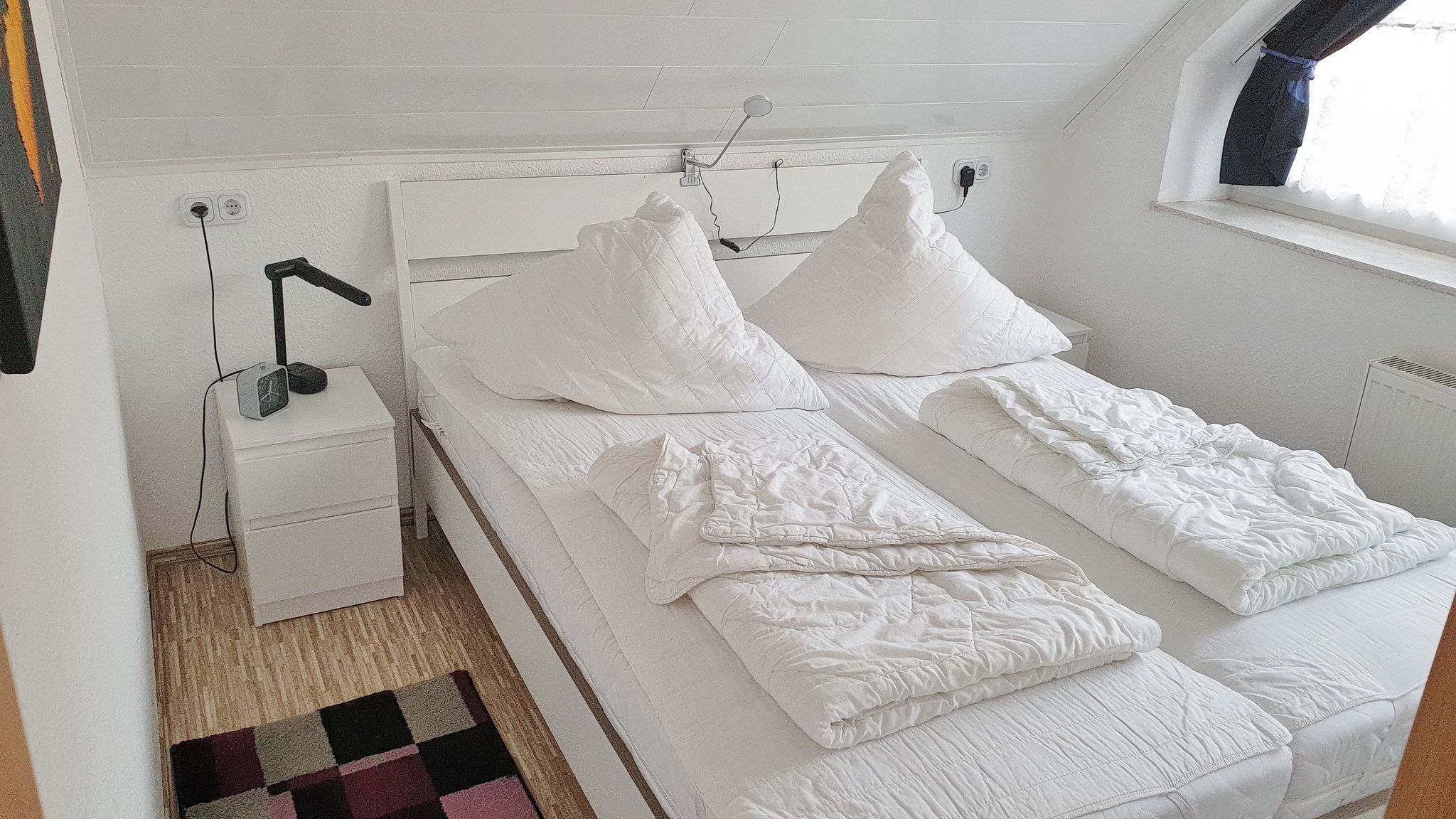 Modernes Schlafzimmer mit Doppelbett (2x 80x200cm und einer komfortablen Höhe von 65 cm) 2 Nachttische. Das Fenster lässt sich blickdicht verdunkeln.