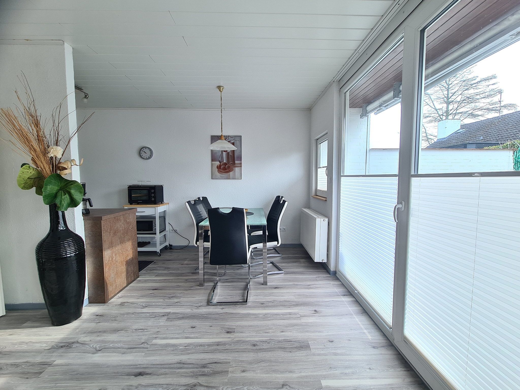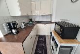 Eine abgeteilte, komplett ausgestattete Küche mit Essgruppe ist im Wohnzimmer integriert. Es gibt eine Spülmaschine, Mikrowelle, Wasserkocher, Kaffeemaschine, Toaster sowie einen mobilen Backofen.
