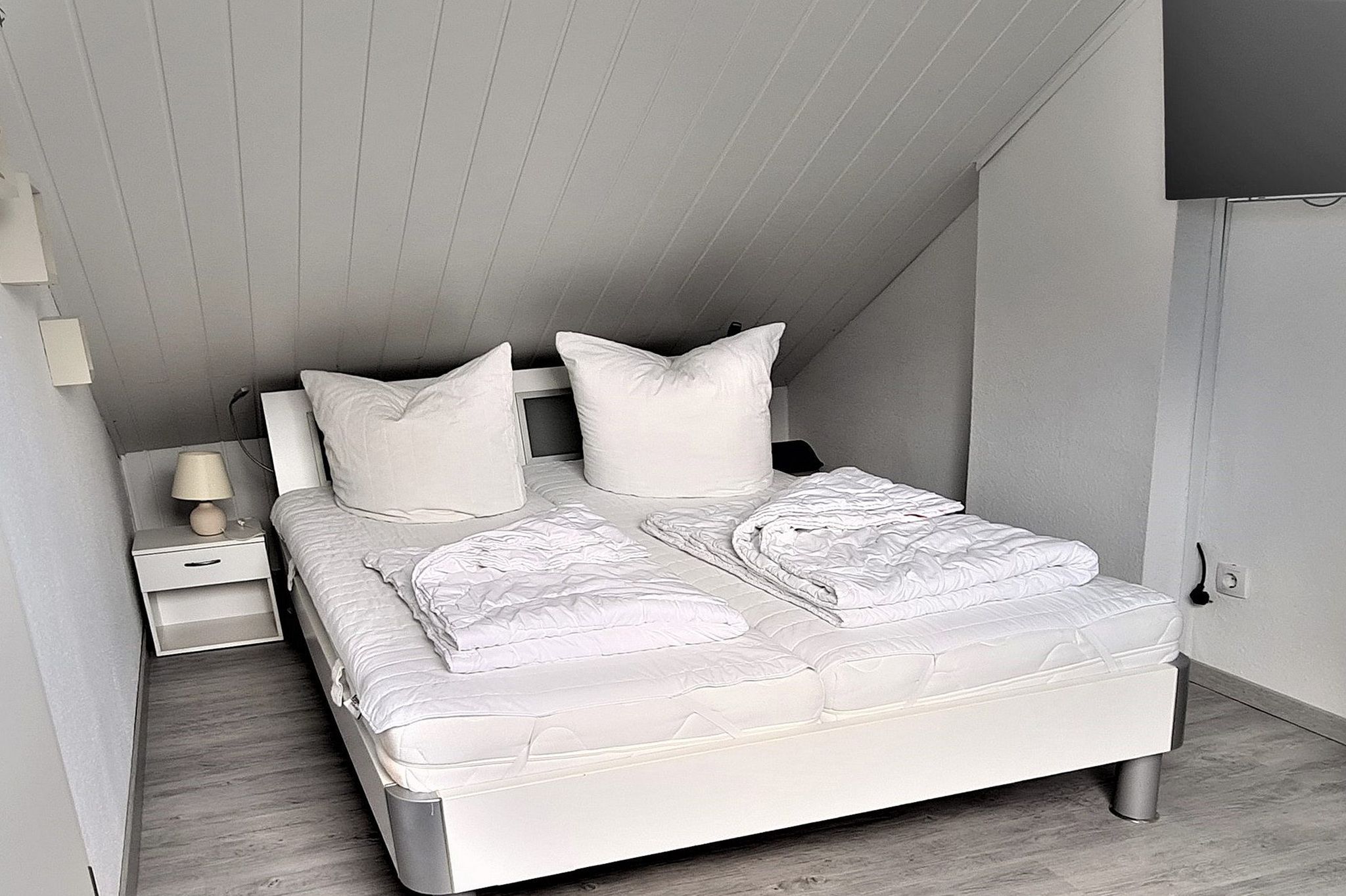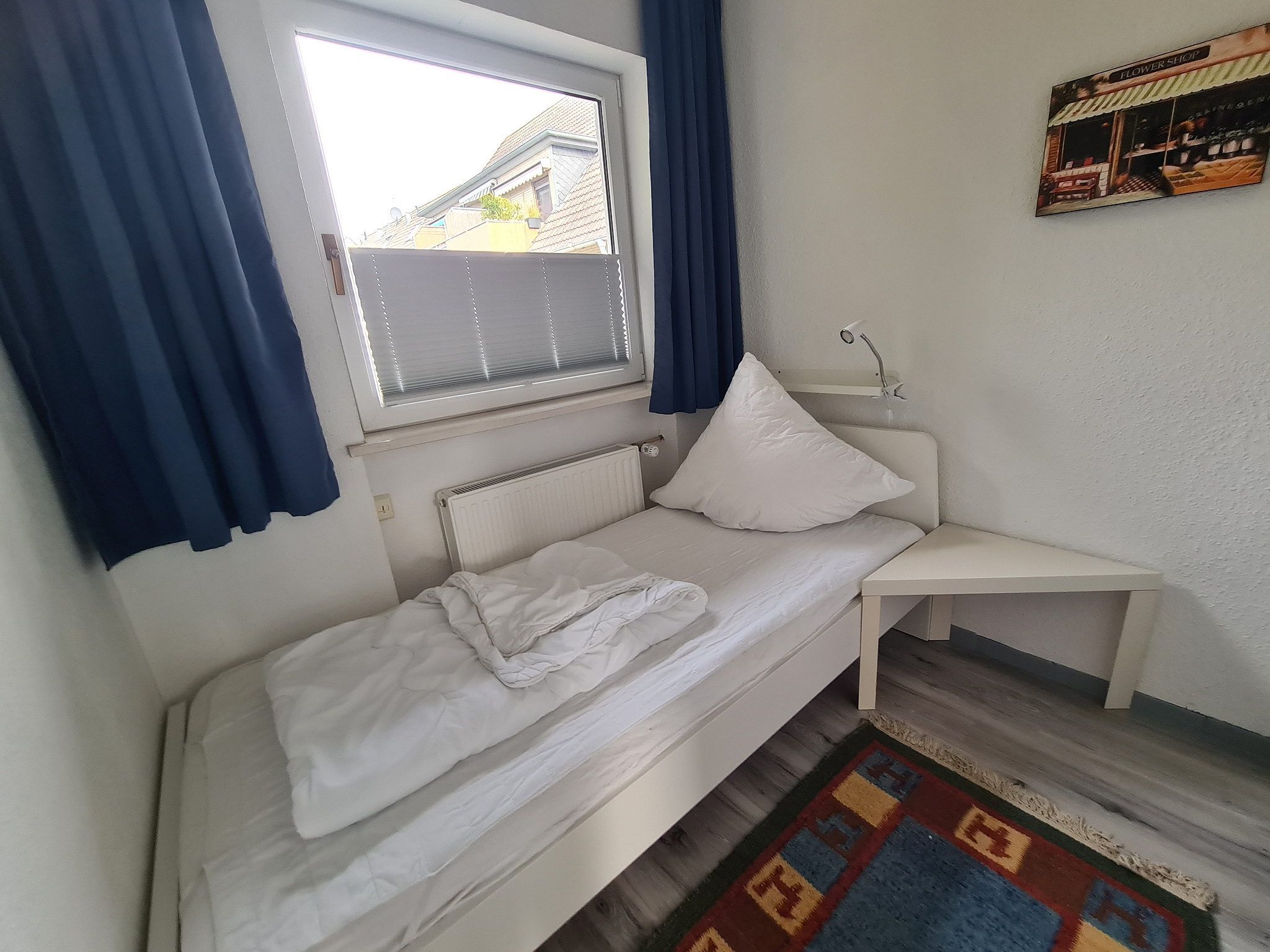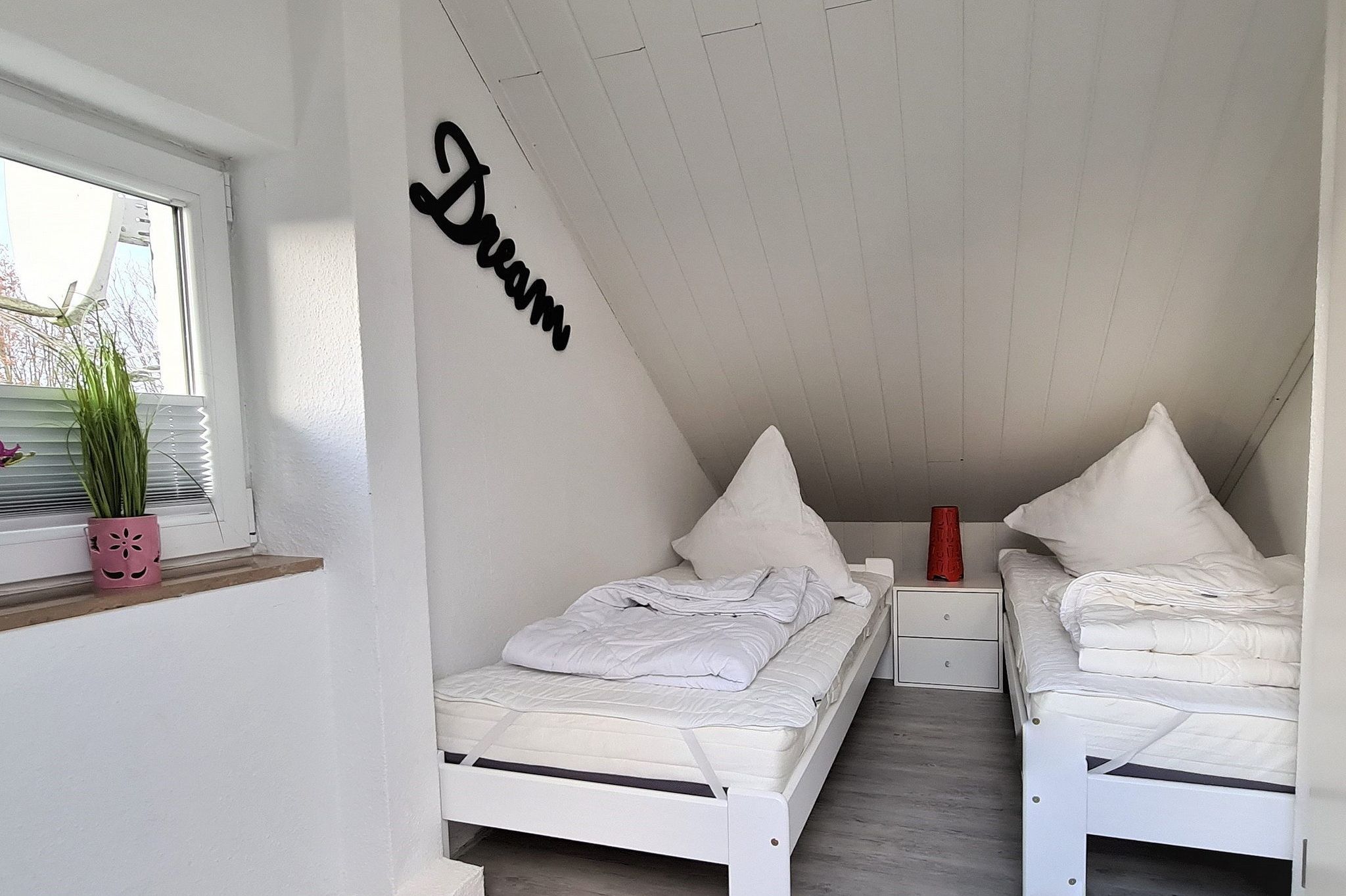 Das Schlafzimmer befindet sich im Obergeschoss und ist mit einem Doppelbett (Größe: 2x80x200cm) und einem Kleiderschrank ausgestattet. Die Fenster lassen sich mit Rollos verdunkeln. Bettwäsche und Handtücher sind mitzubringen oder anzumieten.