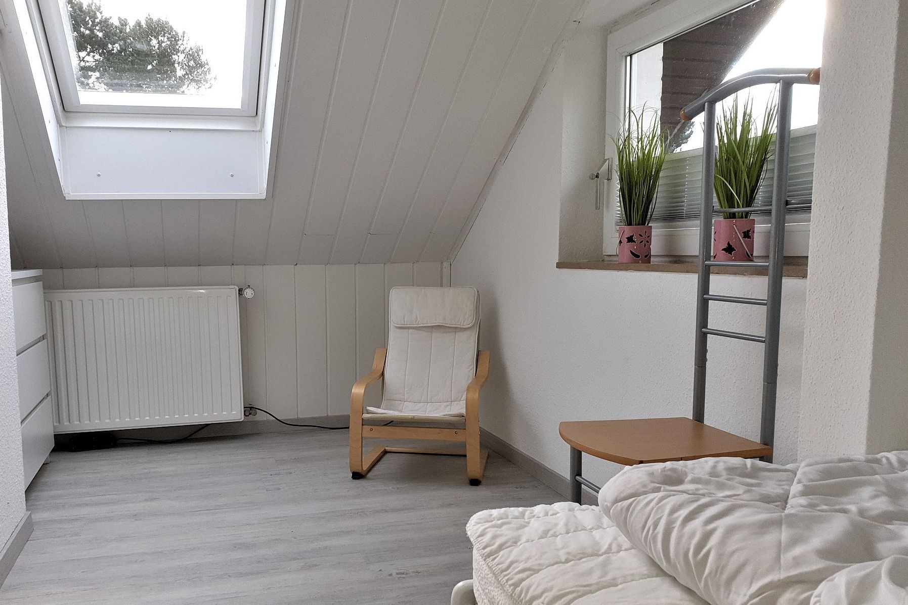 Im Erdgeschoss befindet sich ein Gästezimmer mit Einzelbett (90x200) und Kleiderschrank.