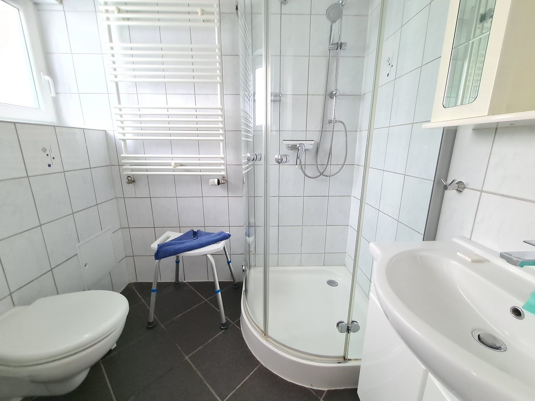 Modernes, hell gefliestes Tageslichtbad mit Dusche, WC und Waschbecken im Erdgeschoss.