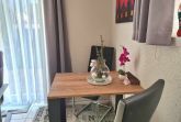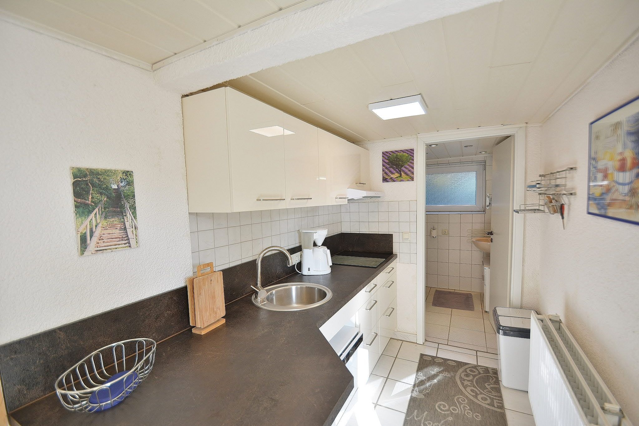Moderne, komplett eingerichtete Küche mit 4-Platten E-Herd, mobiler Backofen, Mikrowelle, Tiefkühlfach, Wasserkocher, kl. Spülmaschine.