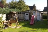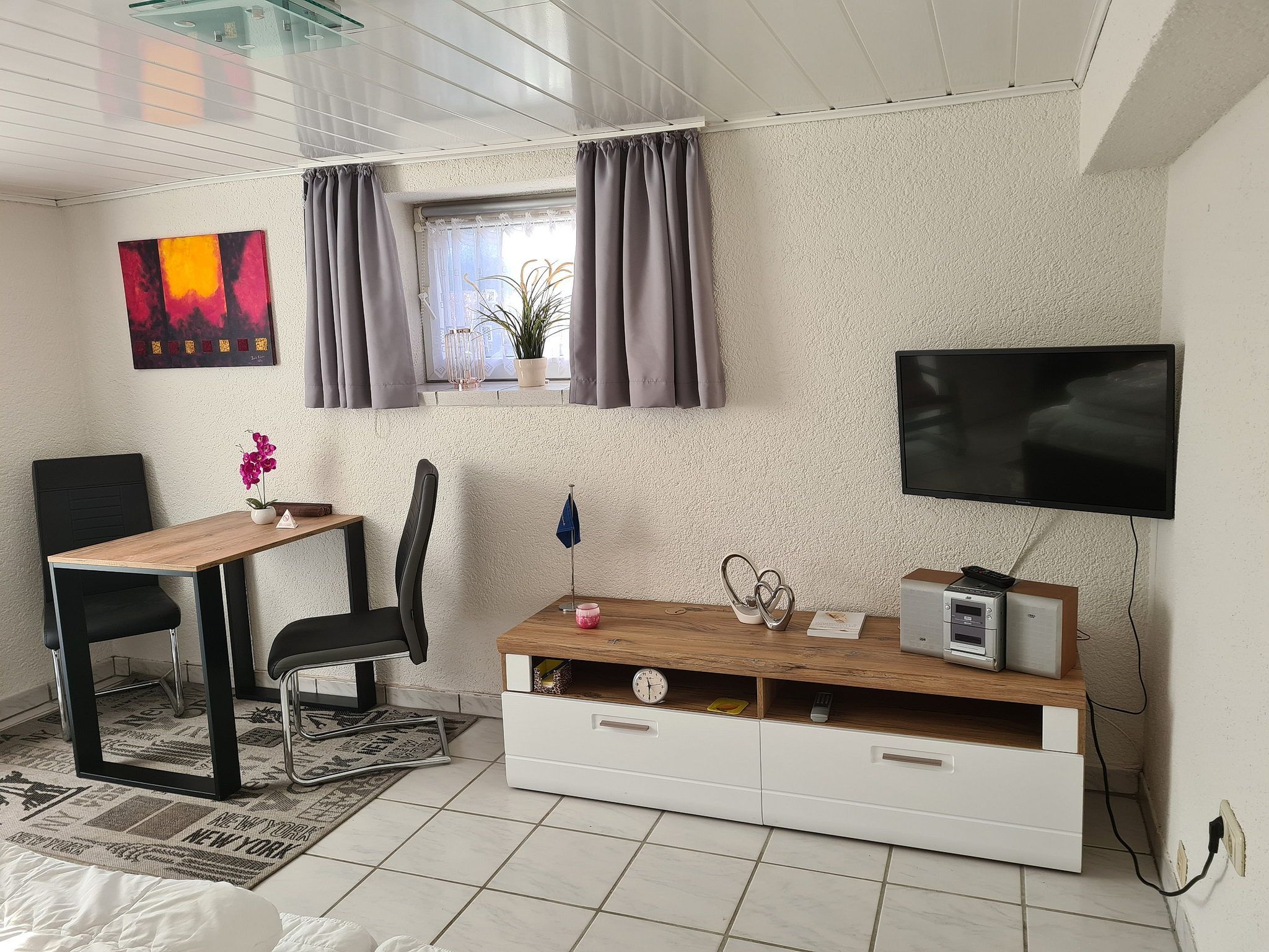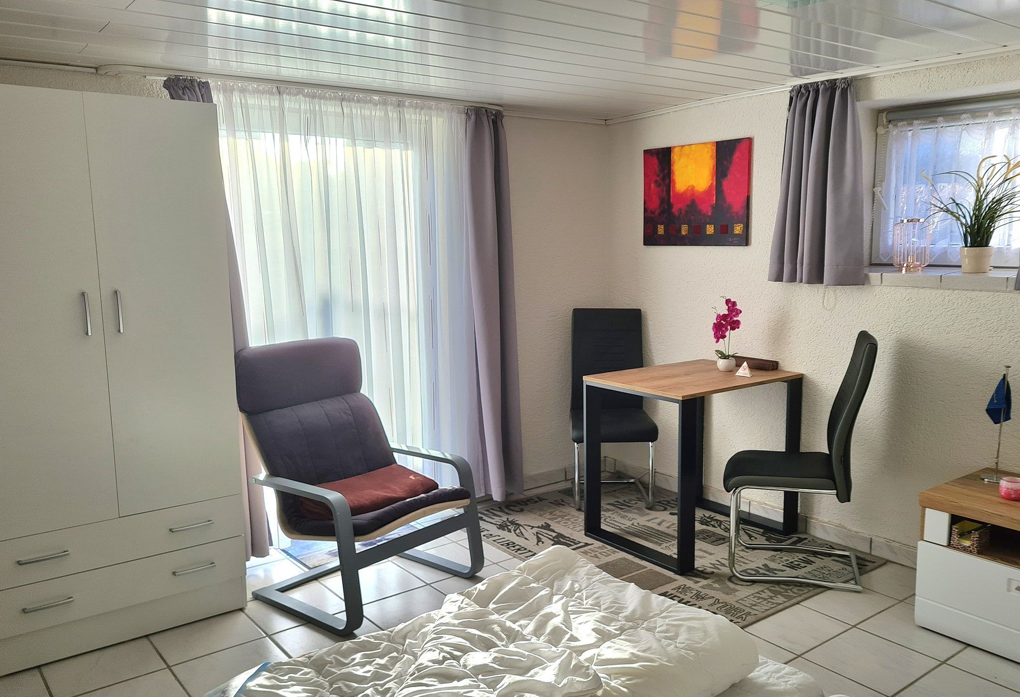 Eine 1-Zimmerwohnung mit separater Küche (28qm). Es ist eine Einliegeruntergeschoßwohnung (3 Stufen abwärts). Die Fenster befinden sich alle oberhalb der Grasnarbe. Es gibt eine große sonnige Terrasse mit kleinem Gartenanteil. Es ist komplett eingezäunt. Niedrige Raumhöhe.