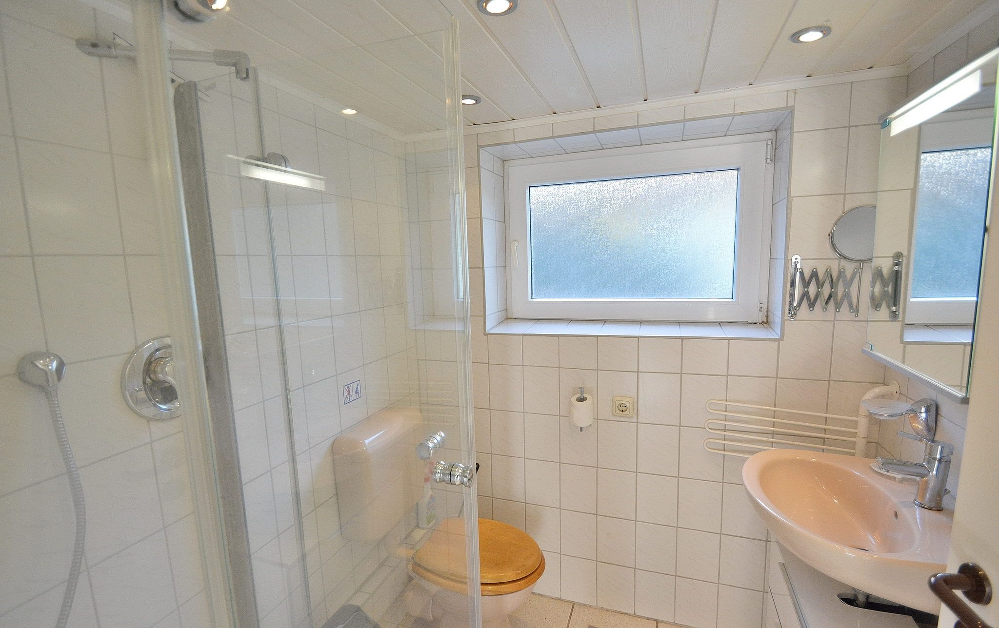 Modernes Tageslichtbad mit WC, Waschbecken und Dusche.